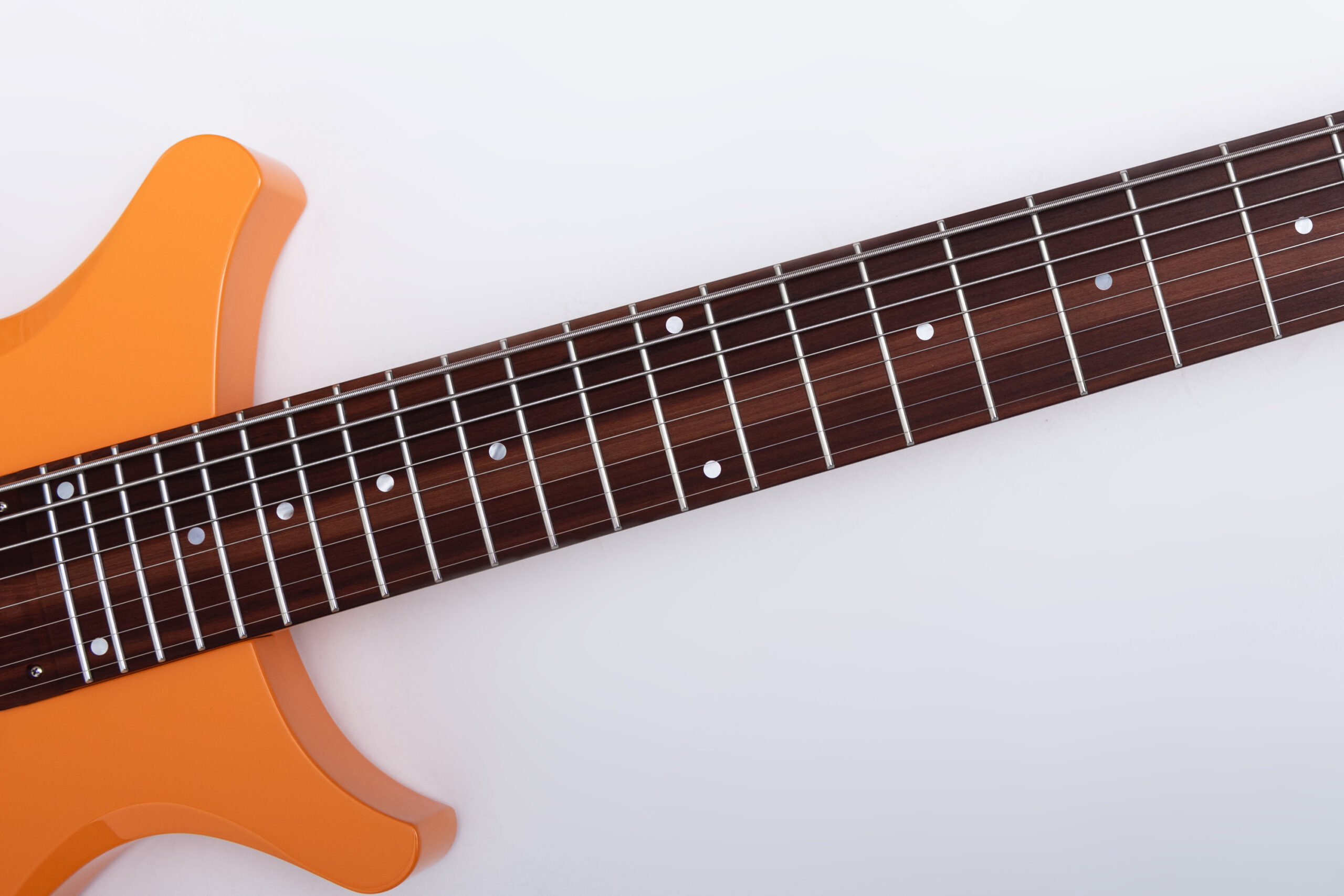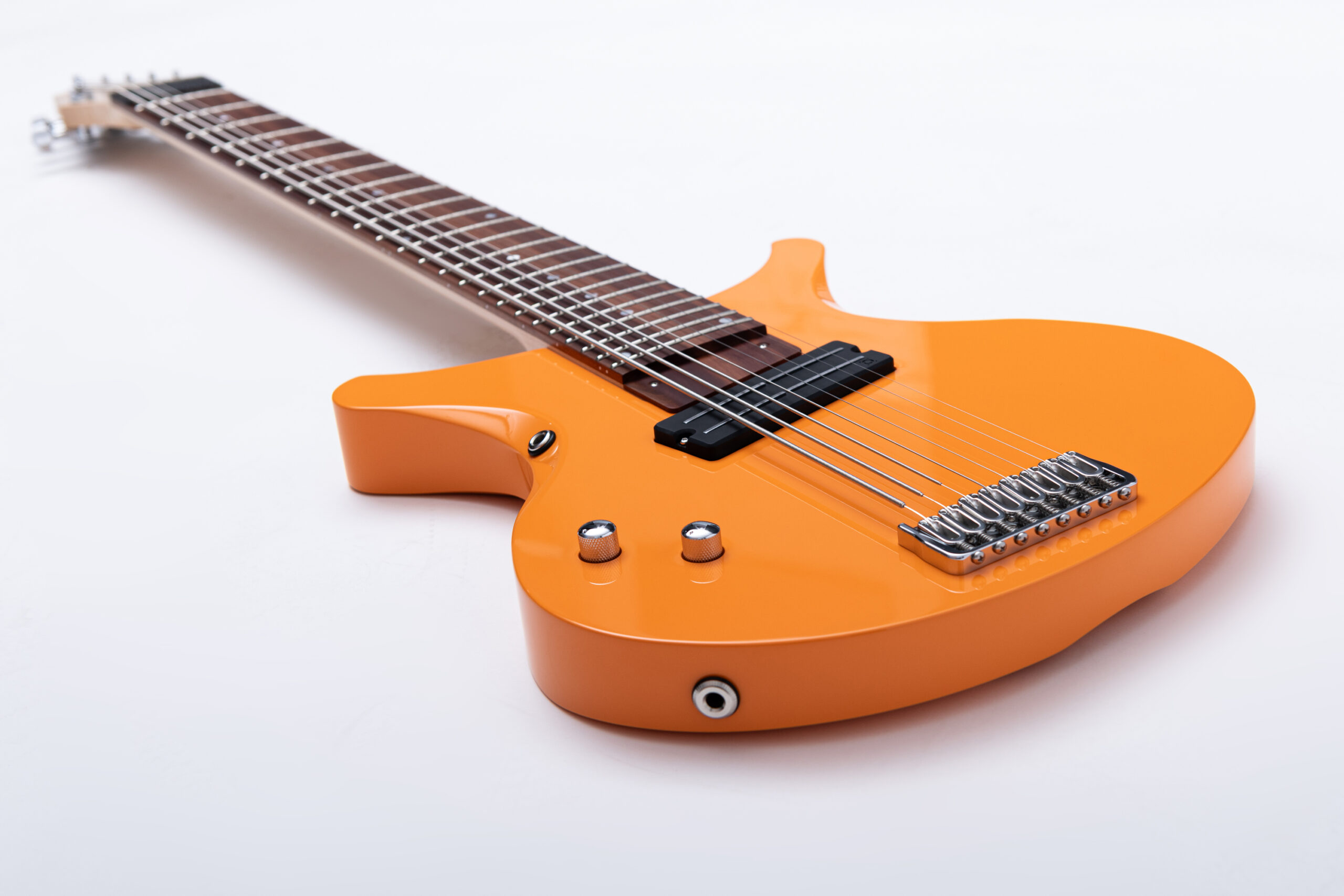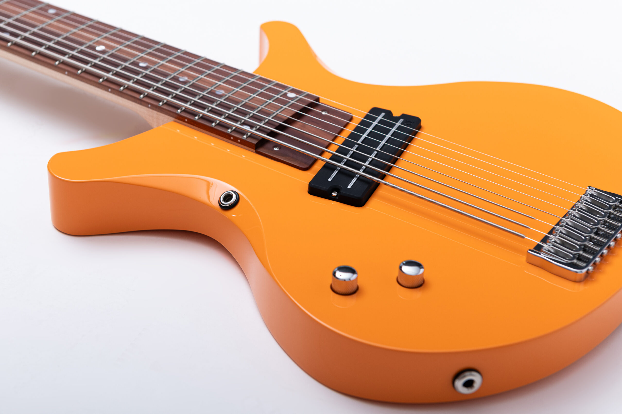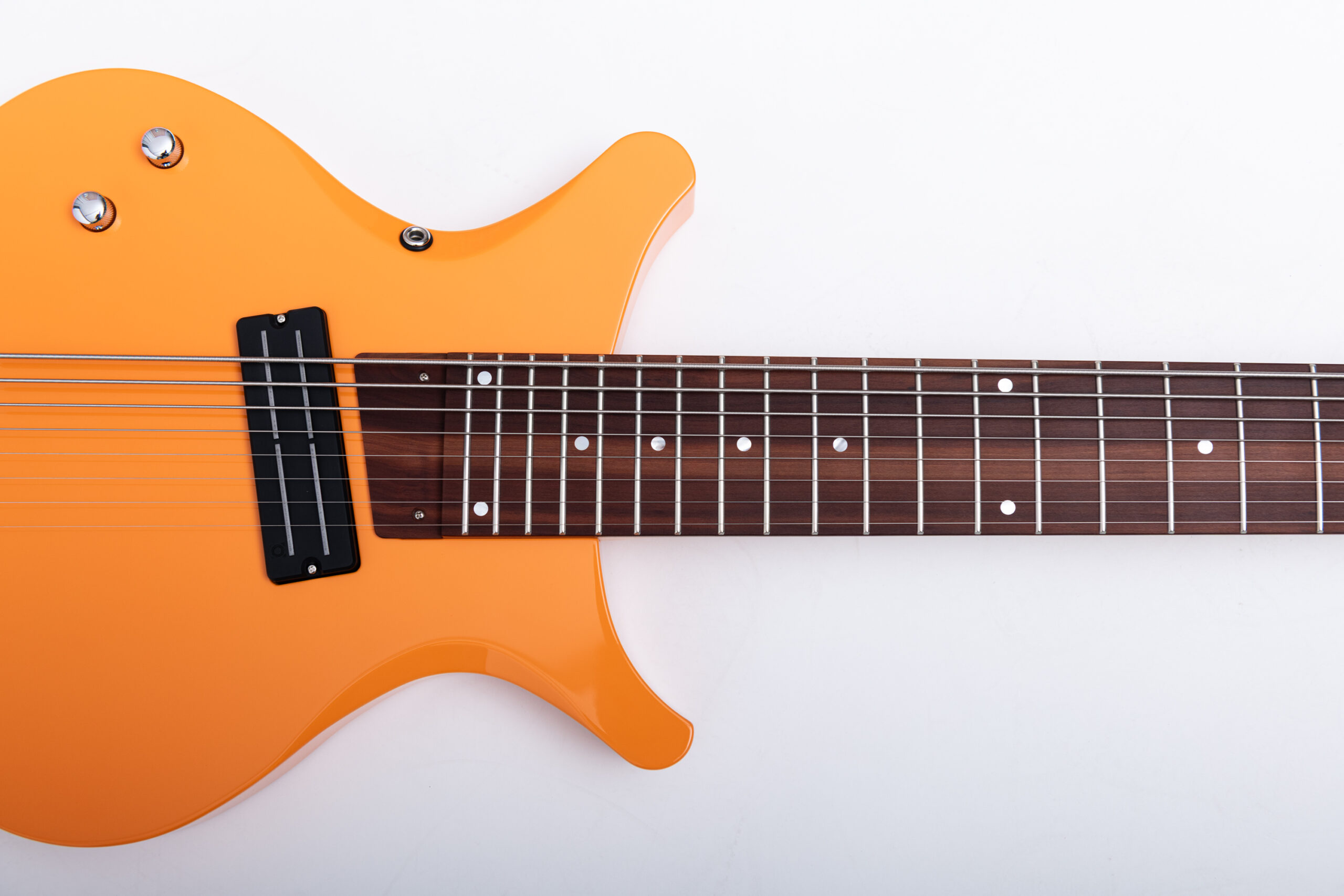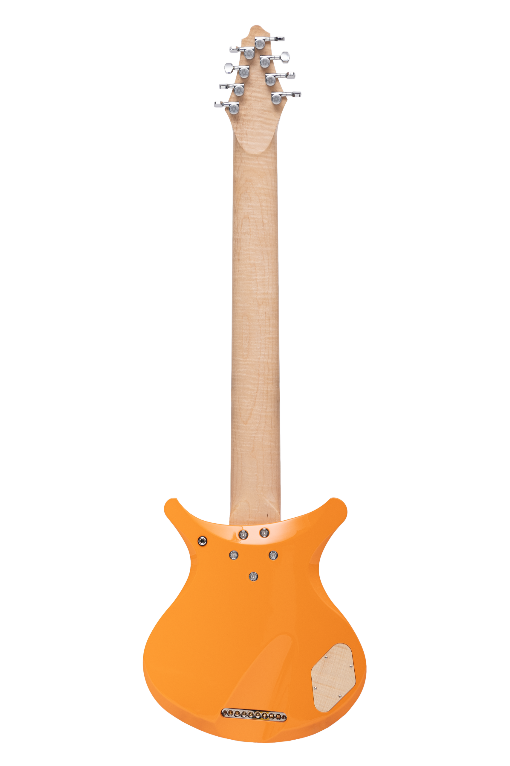 • basswood body in capri orange• true oil neck • maple neck • bog oak fretboard • chrome hardware • Jim Dunlop Straplok system • 1x Nova Custom 8- string pickup • volume, tone • Tuning: Bb F C G D A C D
