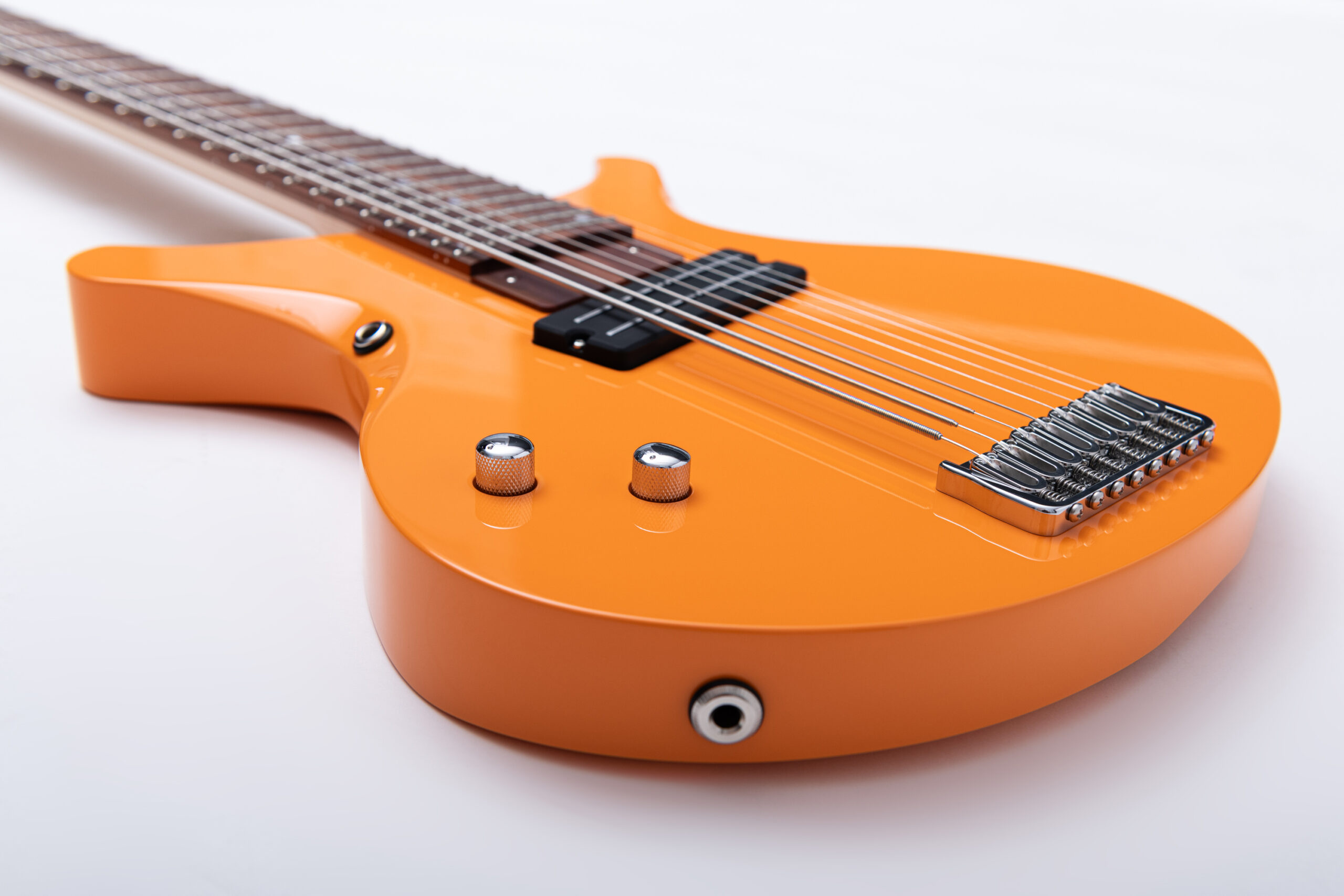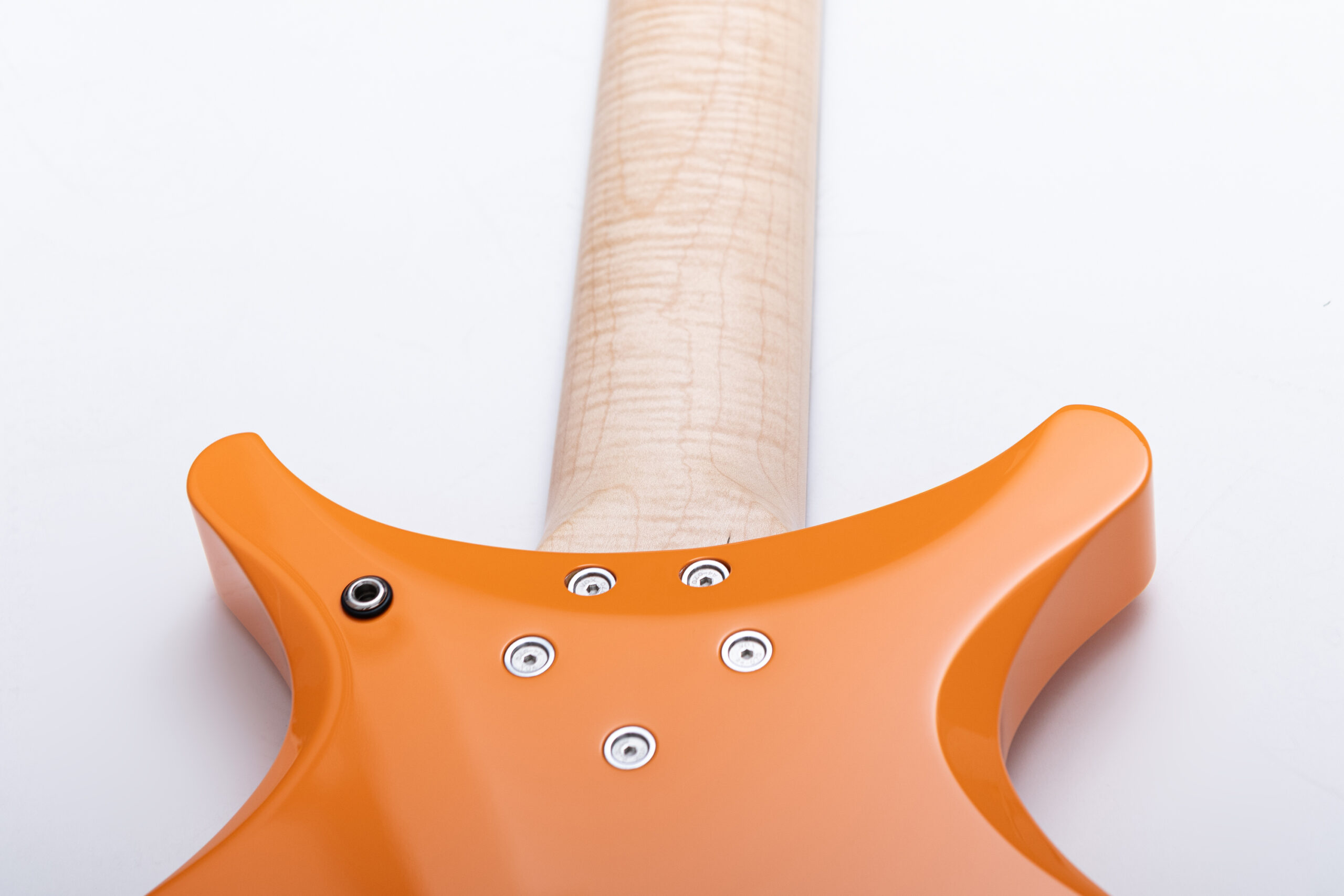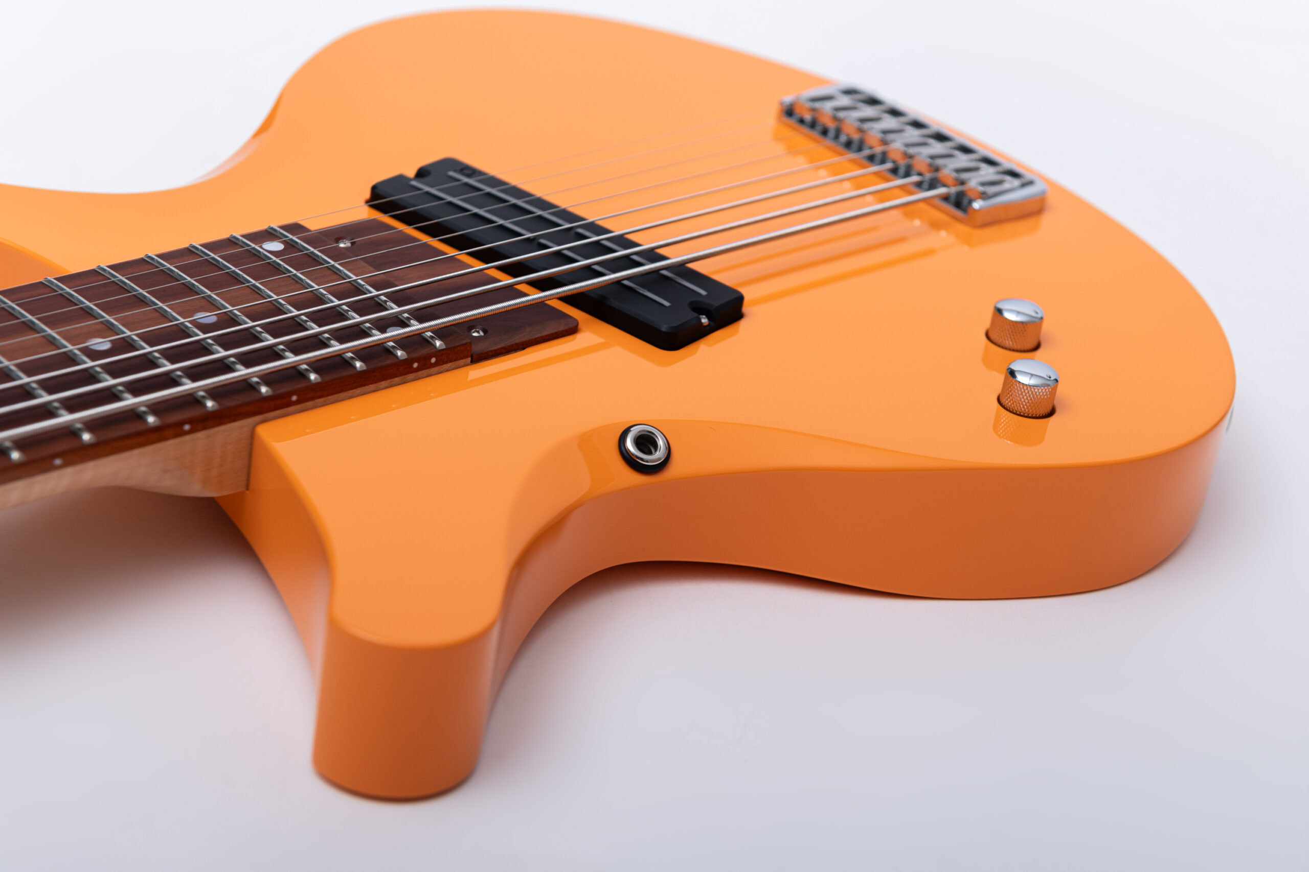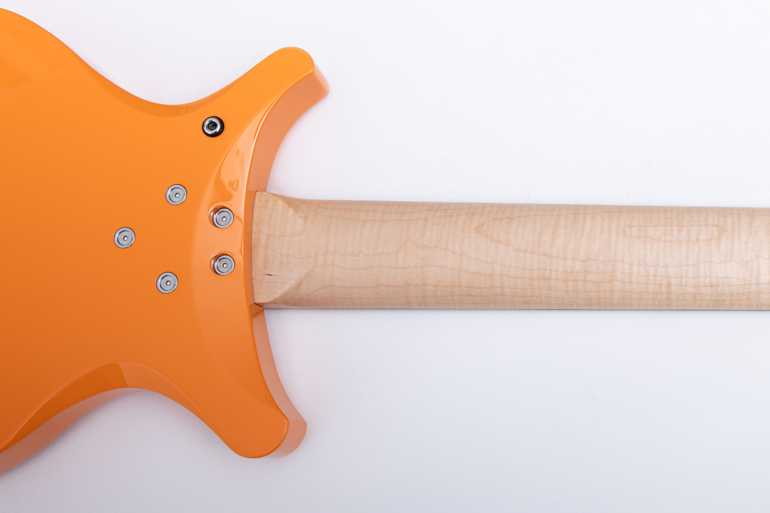 • basswood body in capri orange• true oil neck • maple neck • bog oak fretboard • chrome hardware • Jim Dunlop Straplok system • 1x Nova Custom 8- string pickup • volume, tone • Tuning: Bb F C G D A C D