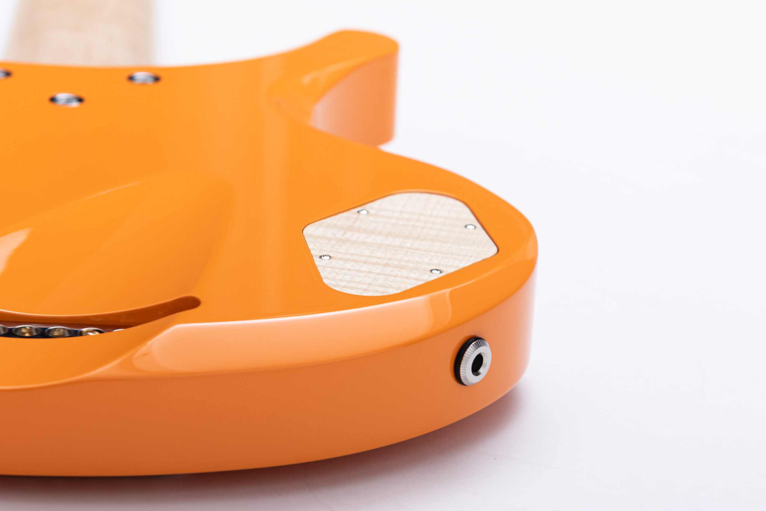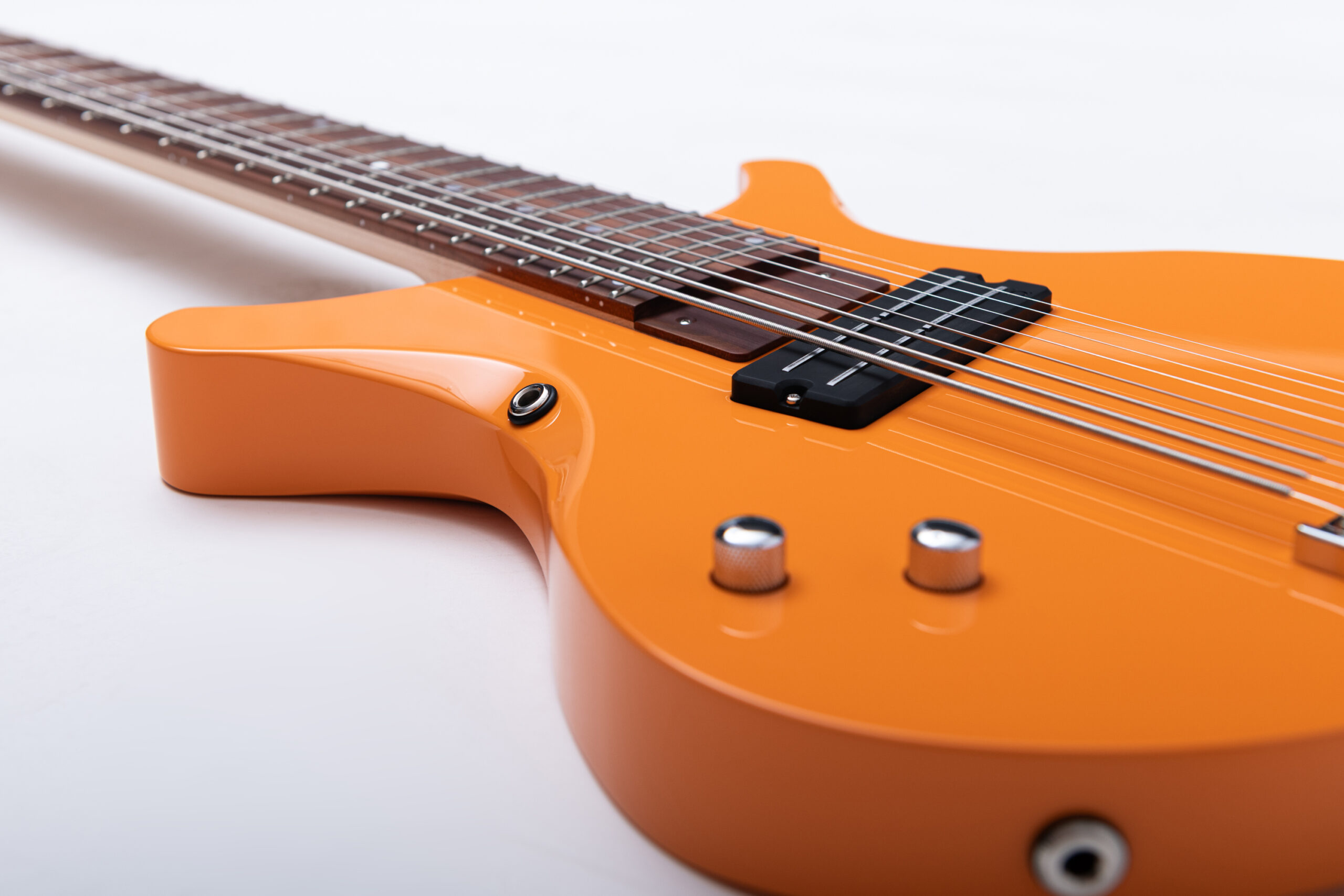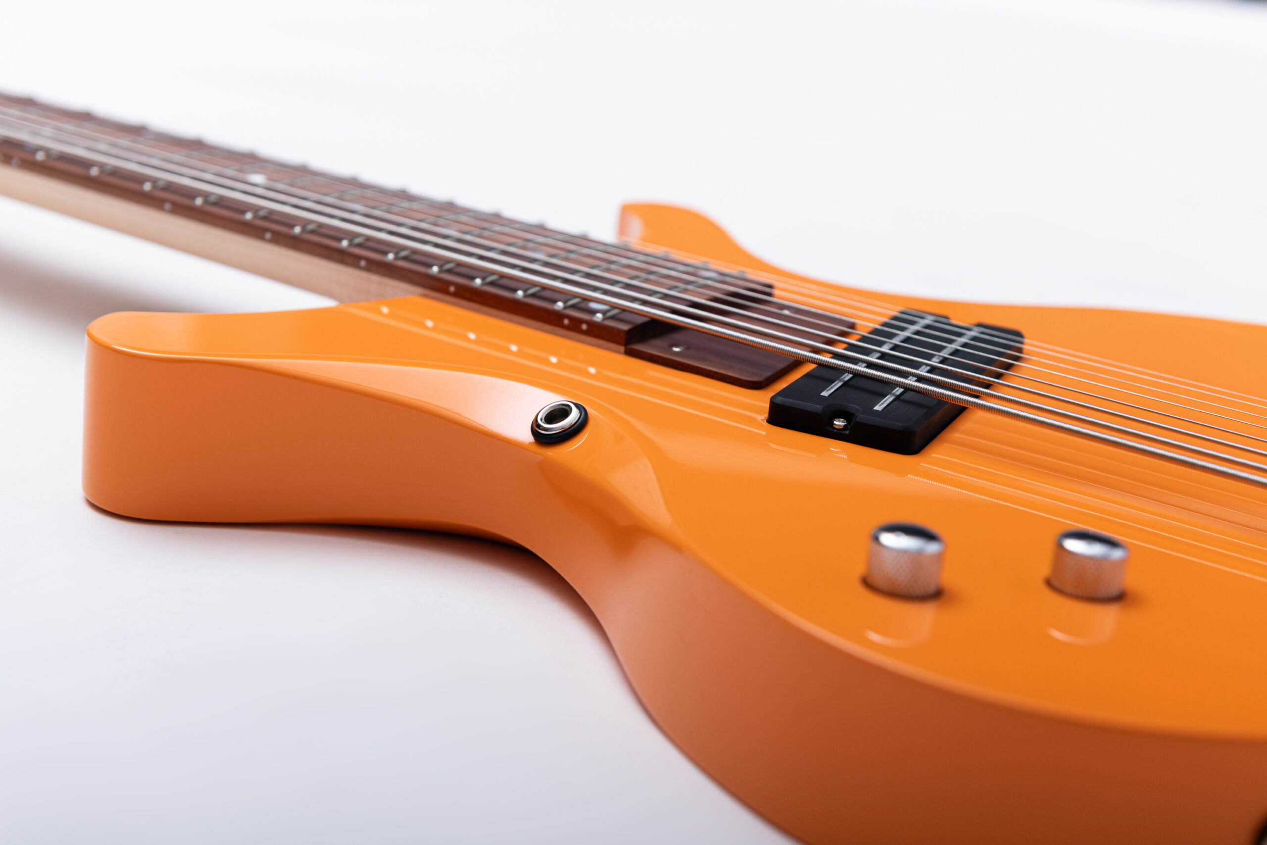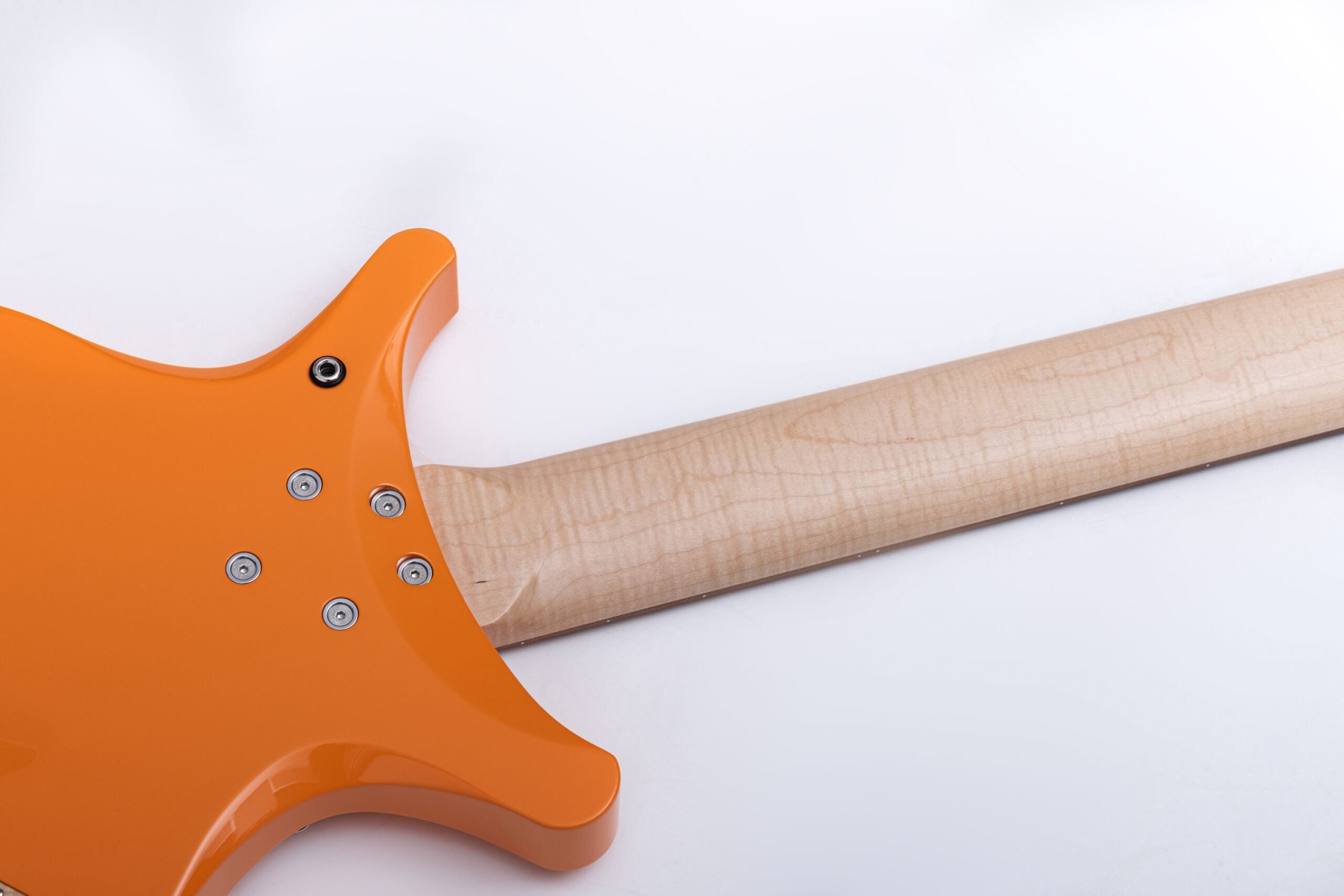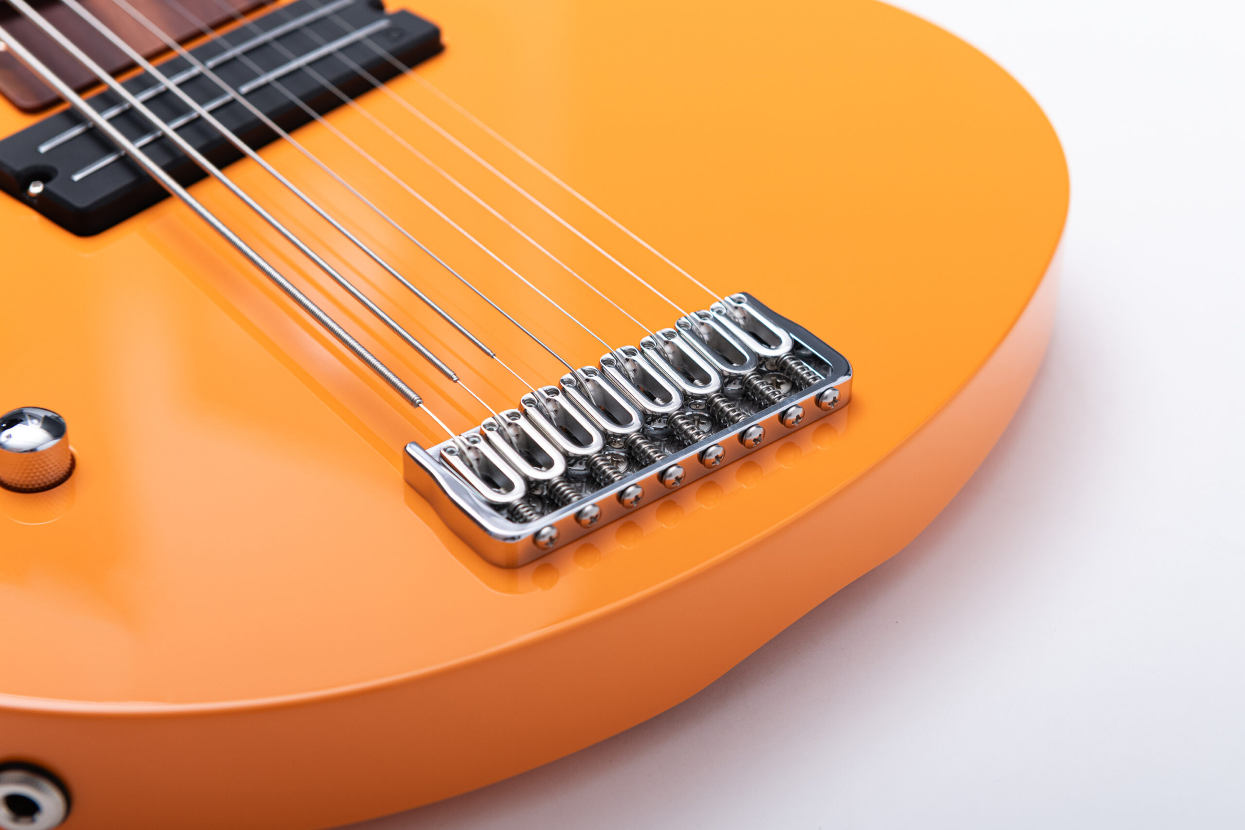 • basswood body in capri orange• true oil neck • maple neck • bog oak fretboard • chrome hardware • Jim Dunlop Straplok system • 1x Nova Custom 8- string pickup • volume, tone • Tuning: Bb F C G D A C D
