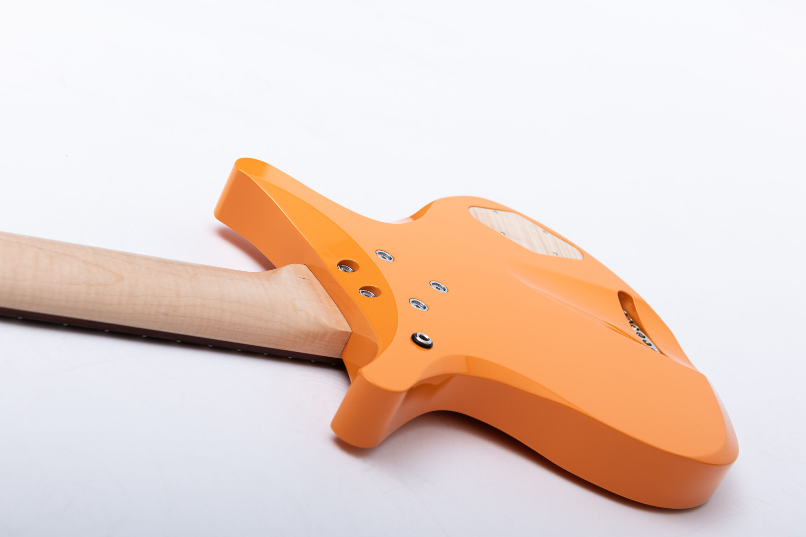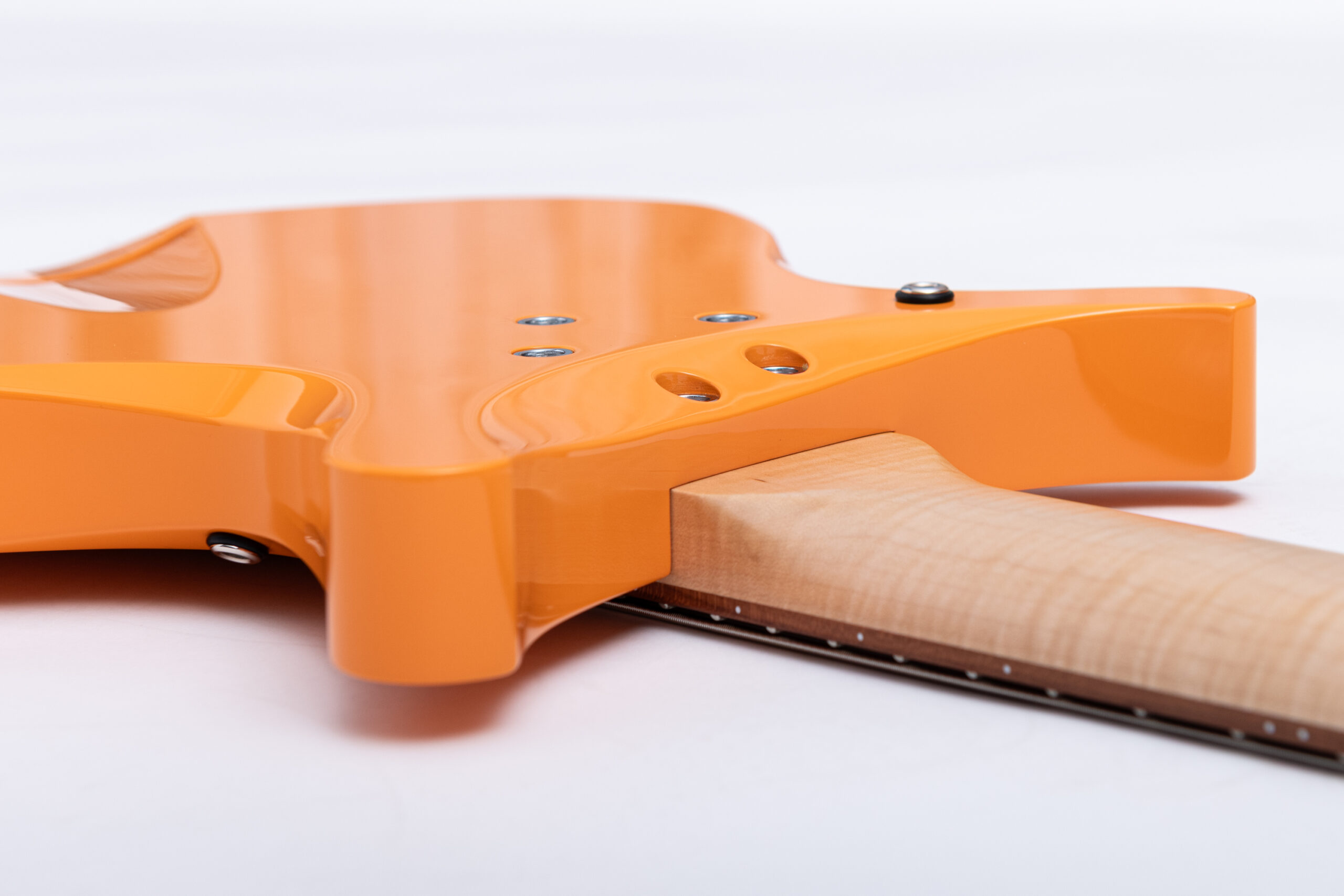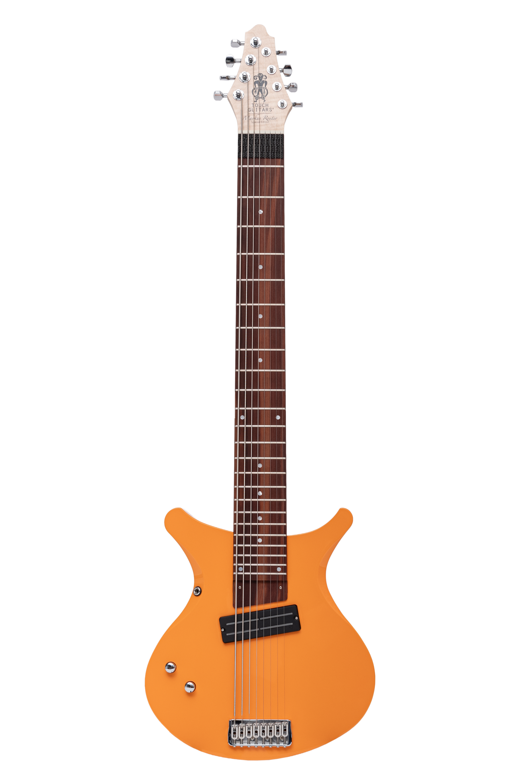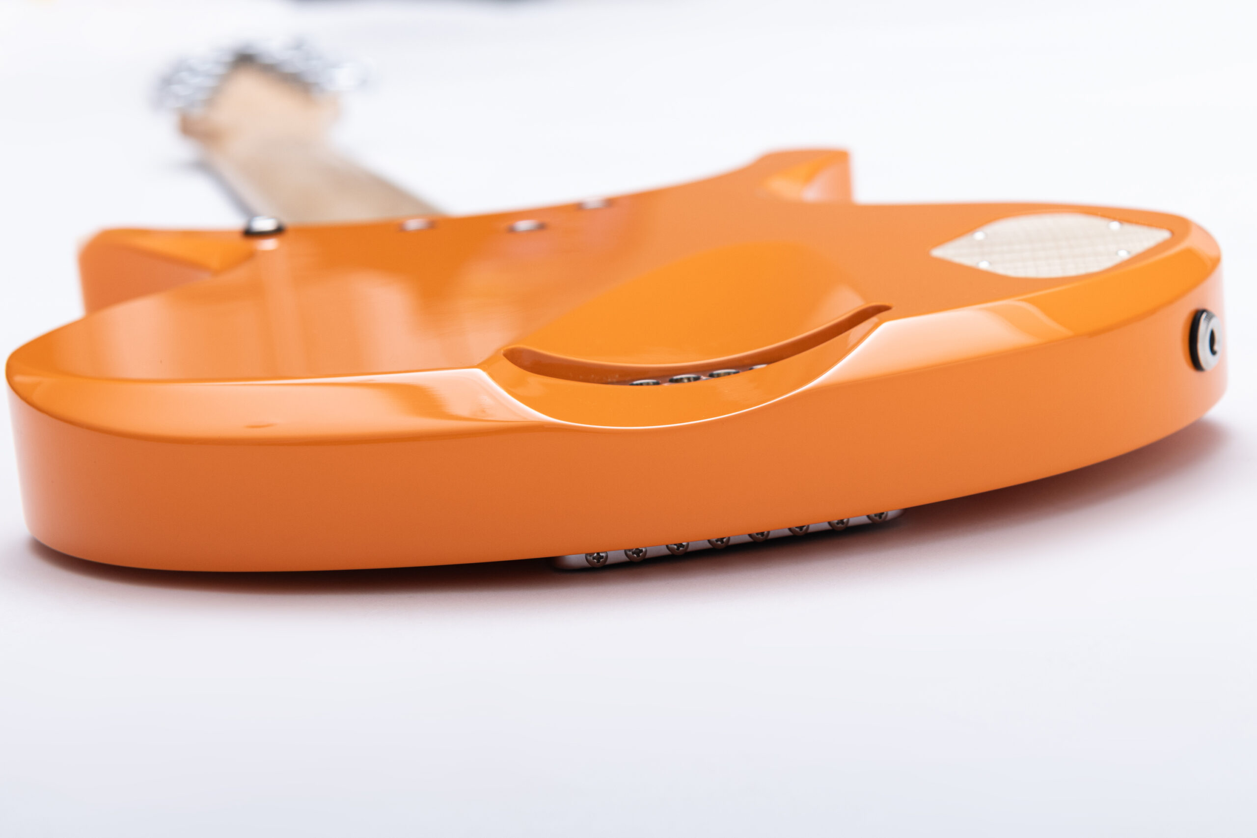 • basswood body in capri orange• true oil neck • maple neck • bog oak fretboard • chrome hardware • Jim Dunlop Straplok system • 1x Nova Custom 8- string pickup • volume, tone • Tuning: Bb F C G D A C D