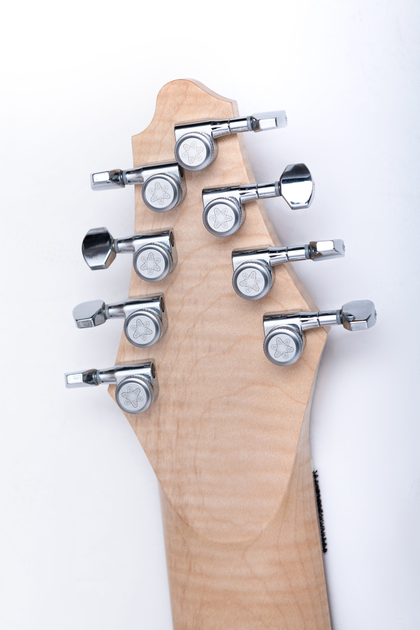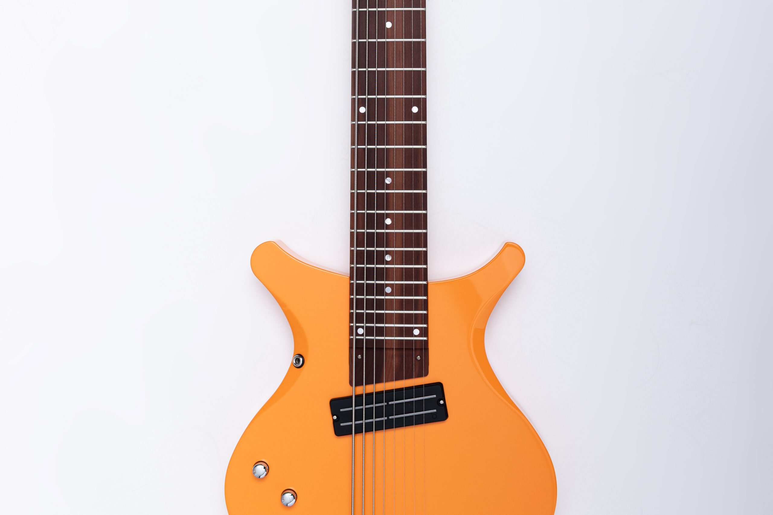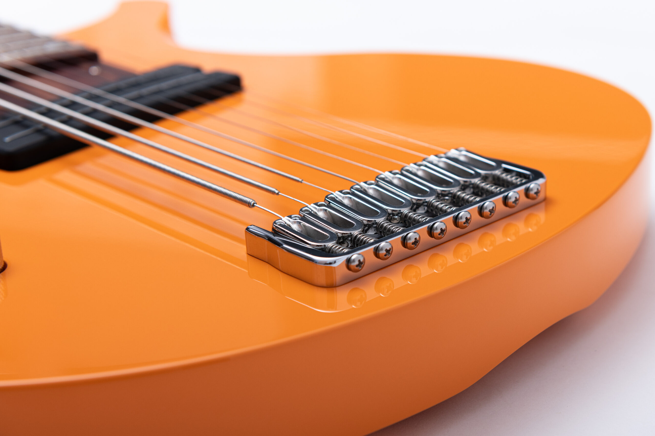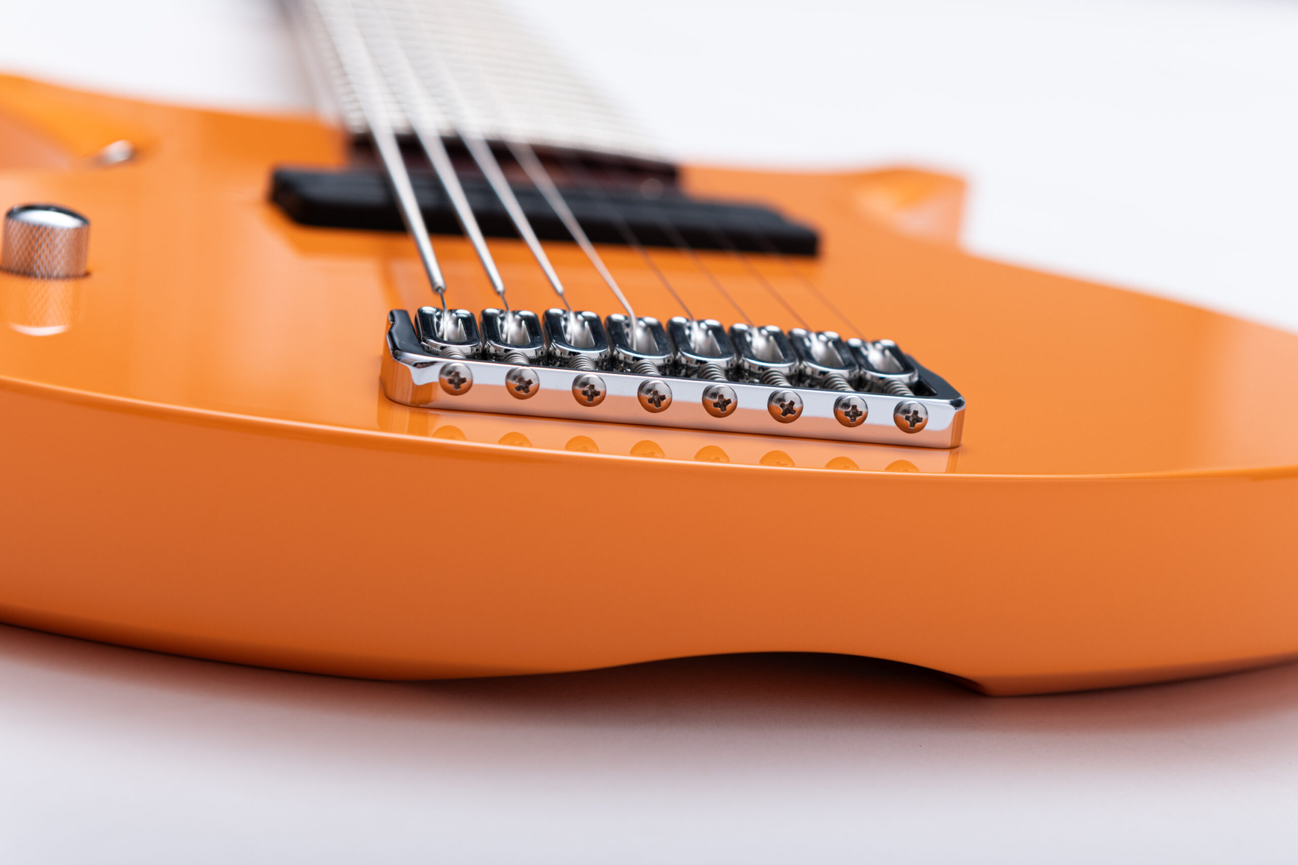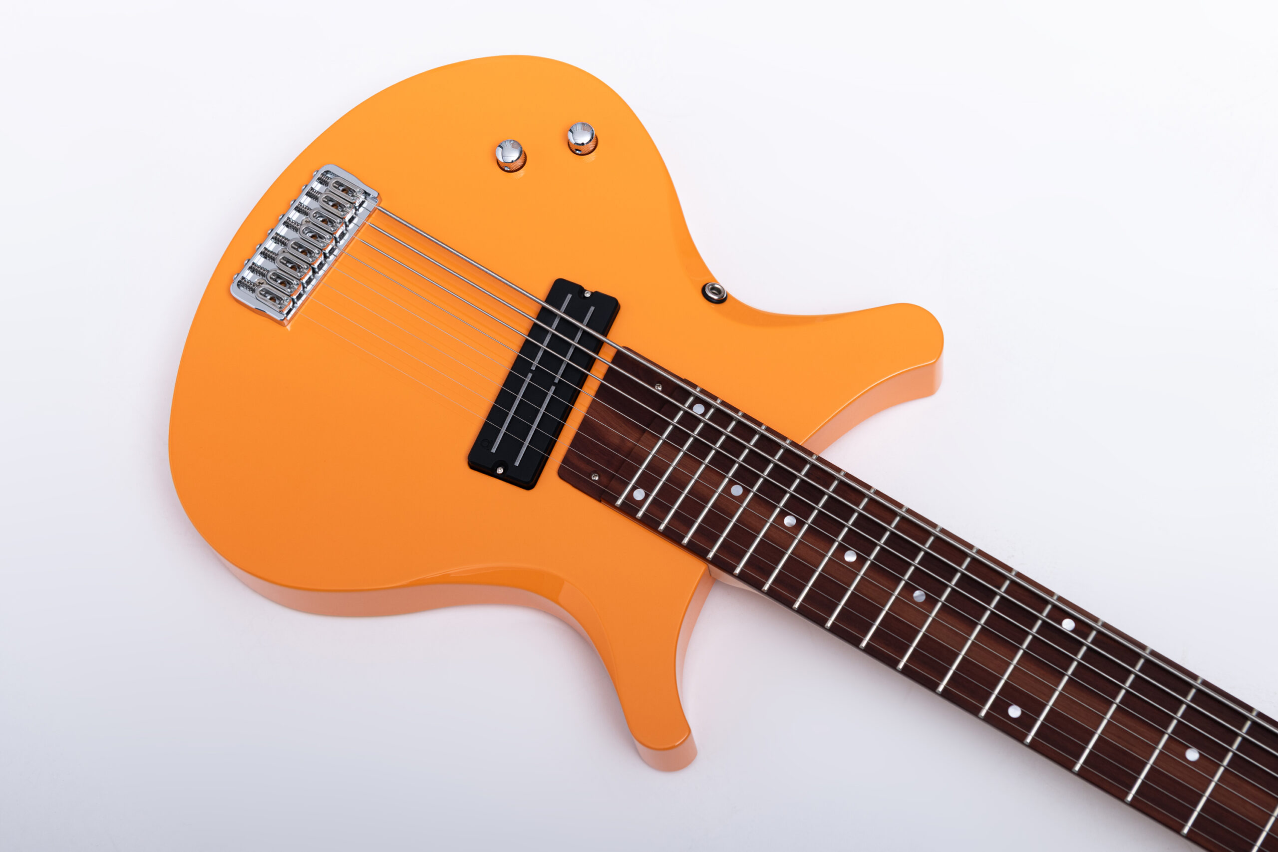 • basswood body in capri orange• true oil neck • maple neck • bog oak fretboard • chrome hardware • Jim Dunlop Straplok system • 1x Nova Custom 8- string pickup • volume, tone • Tuning: Bb F C G D A C D