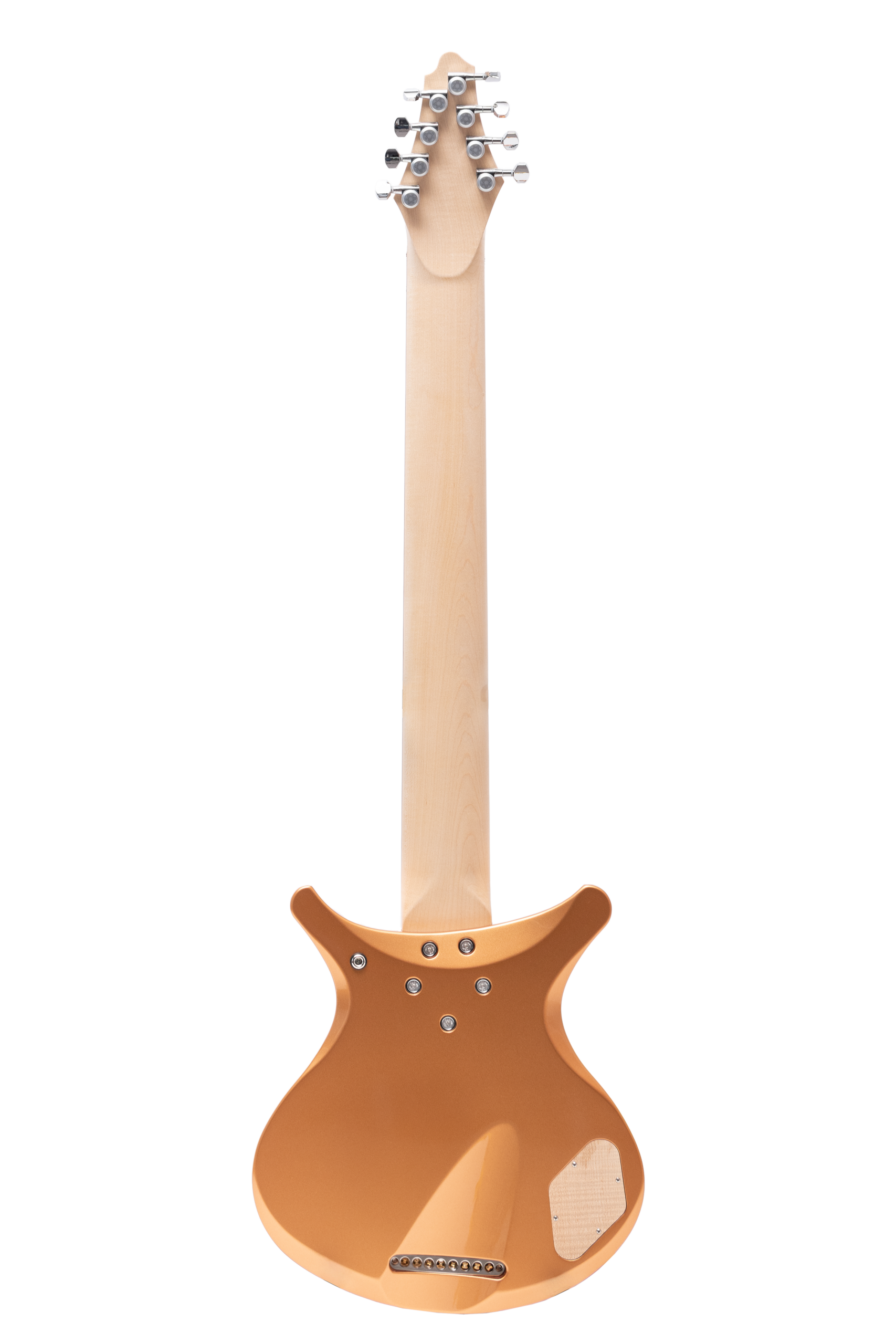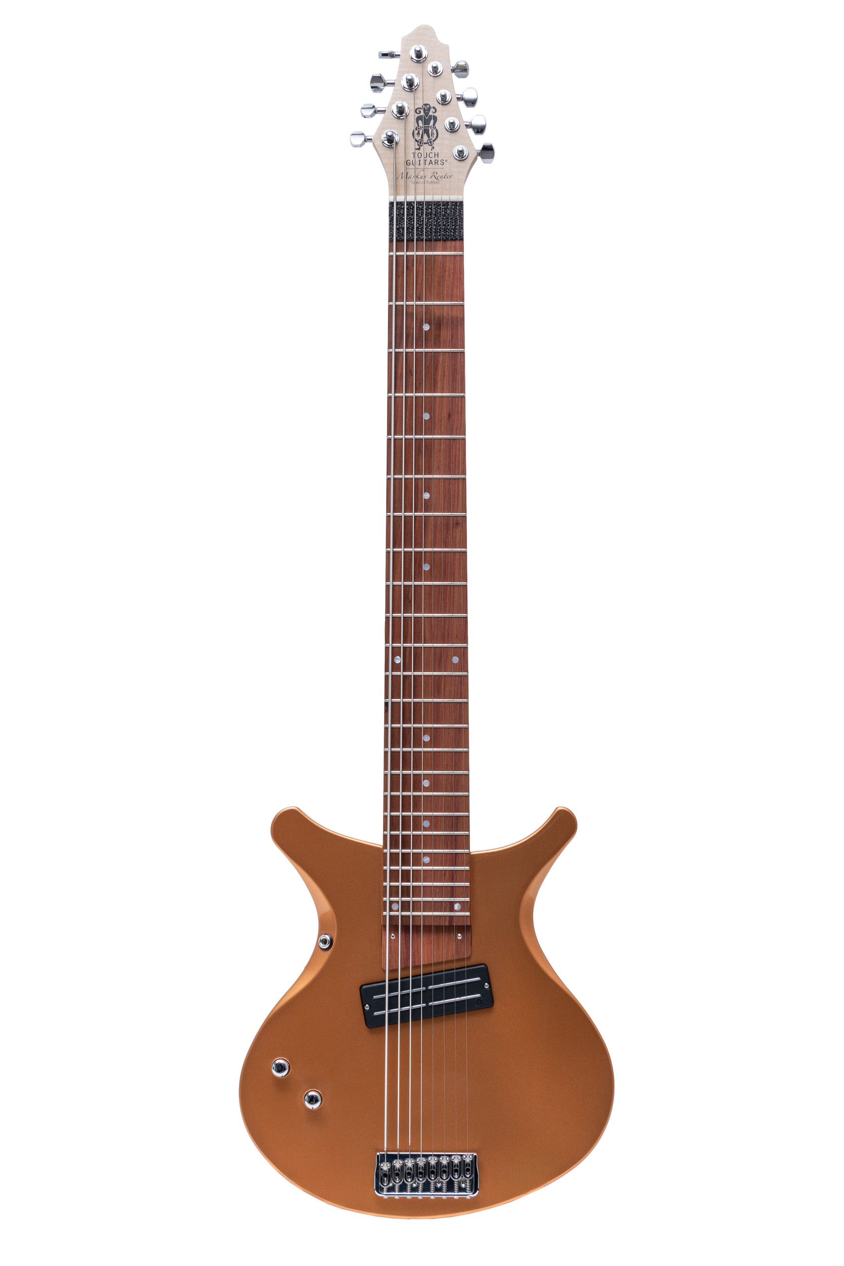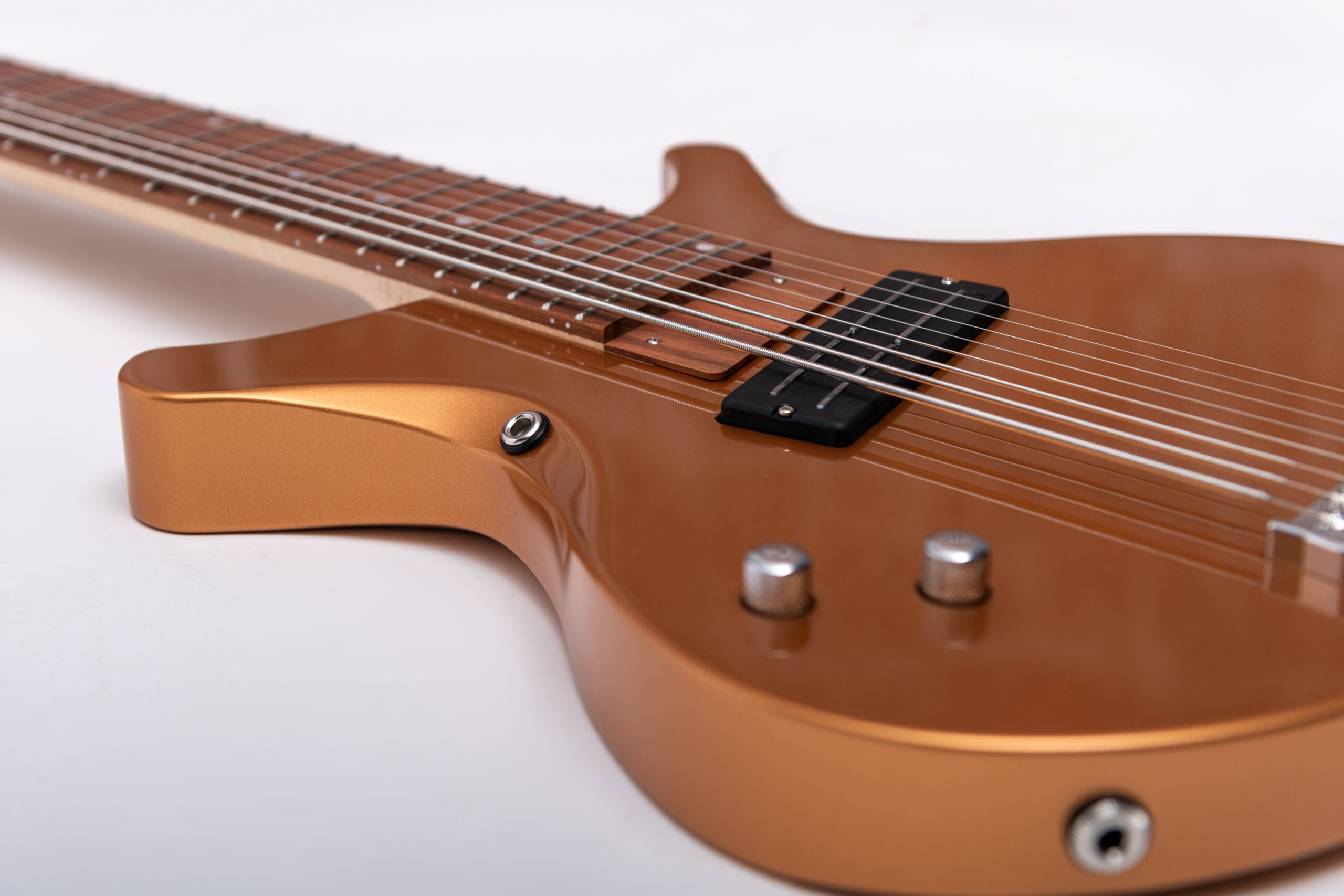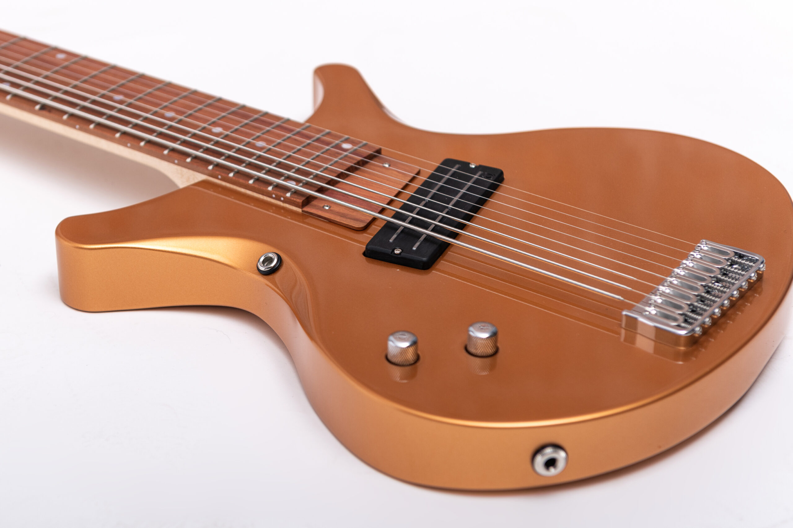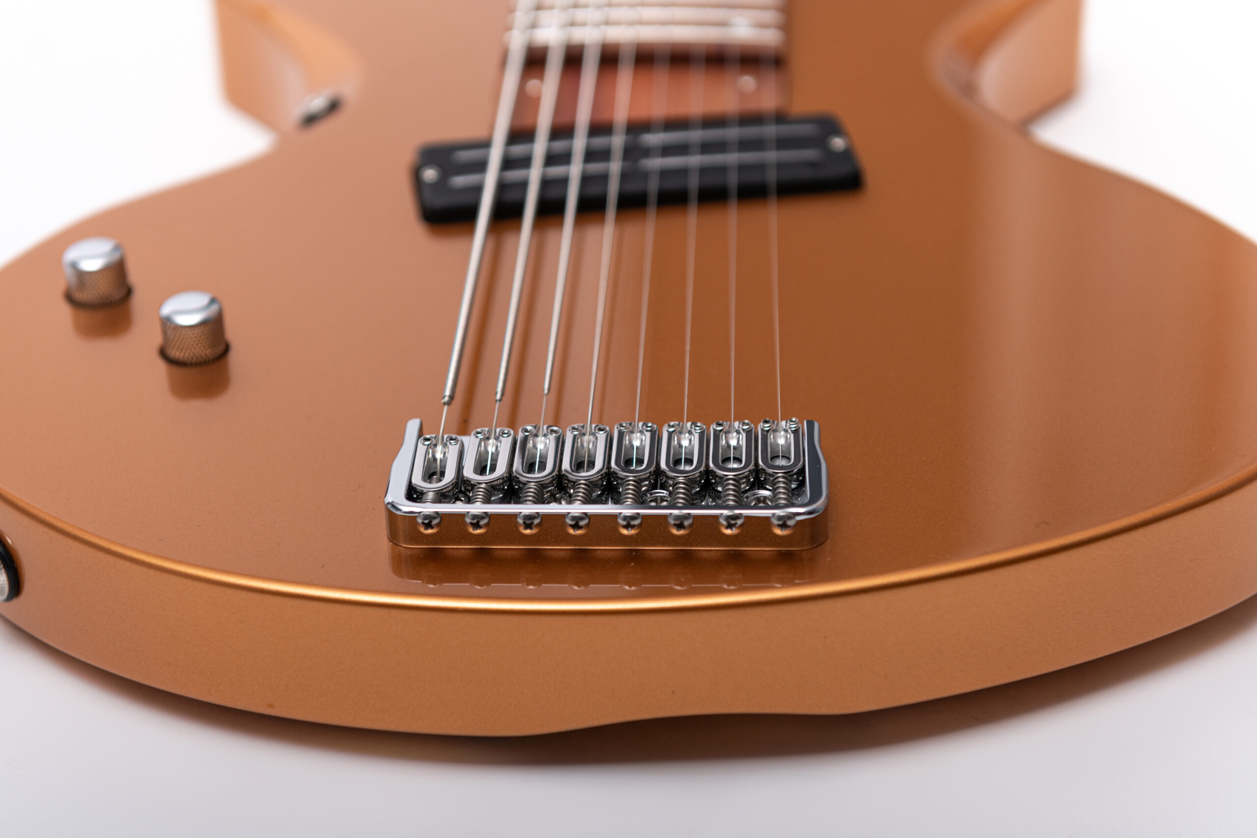 • basswood body in firemist gold metallic • true oil neck • maple neck • plumwood fretboard • chrome hardware • Jim Dunlop Straplok system • 1x Nova Custom 8- string pickup • volume, tone • Tuning: Bb F C G D A C D