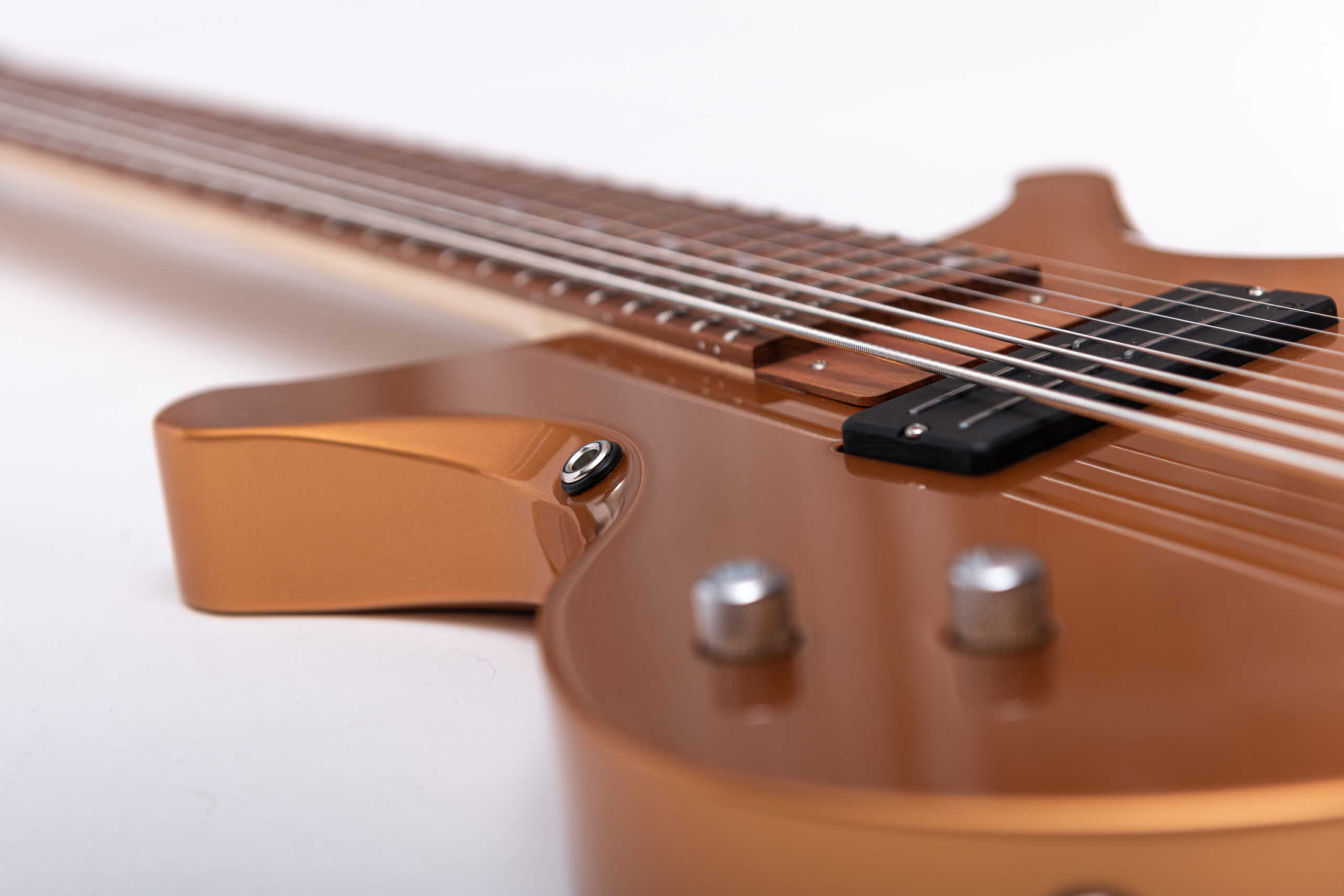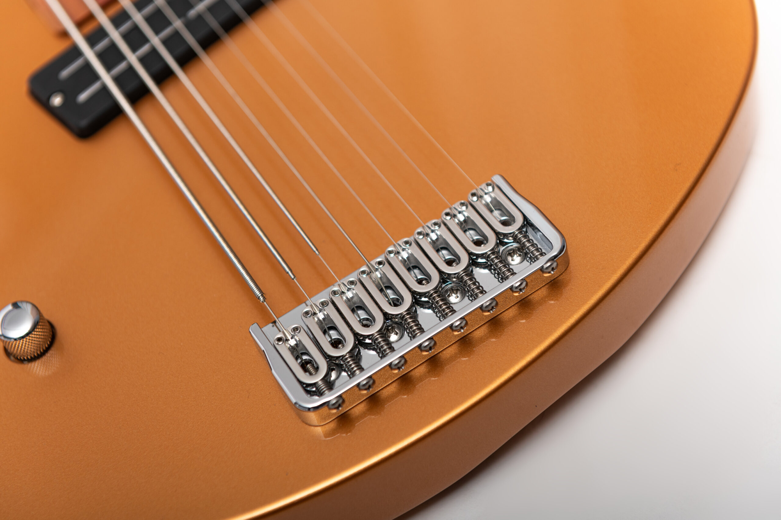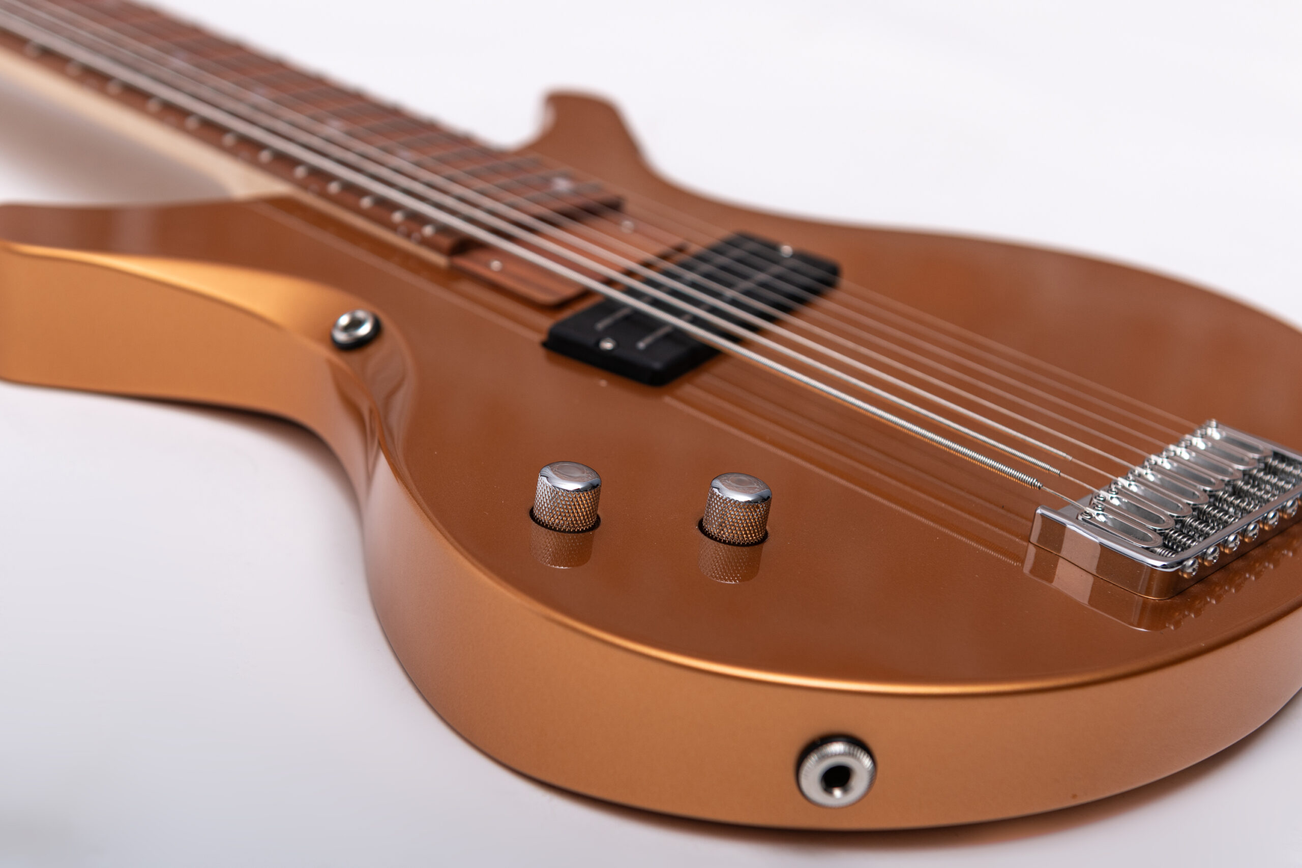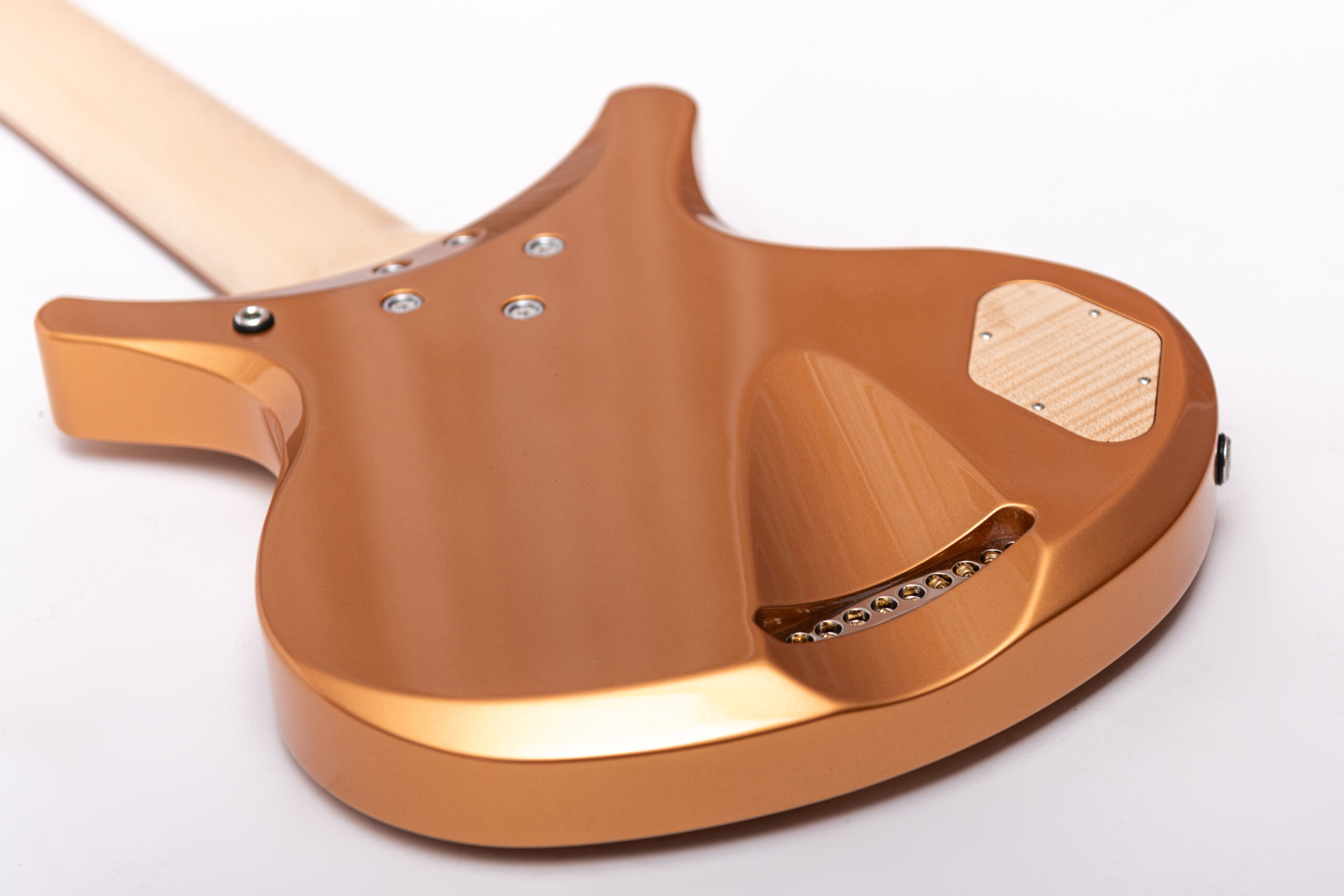 • basswood body in firemist gold metallic • true oil neck • maple neck • plumwood fretboard • chrome hardware • Jim Dunlop Straplok system • 1x Nova Custom 8- string pickup • volume, tone • Tuning: Bb F C G D A C D