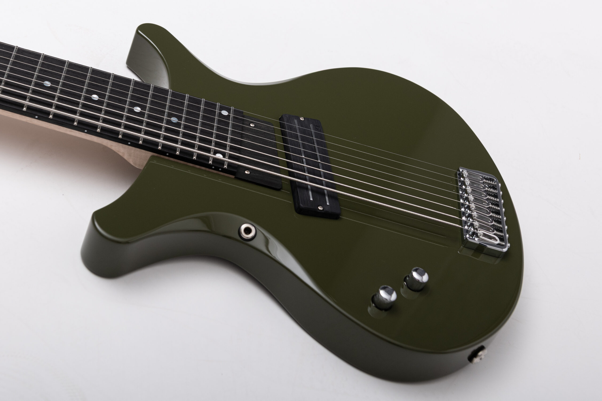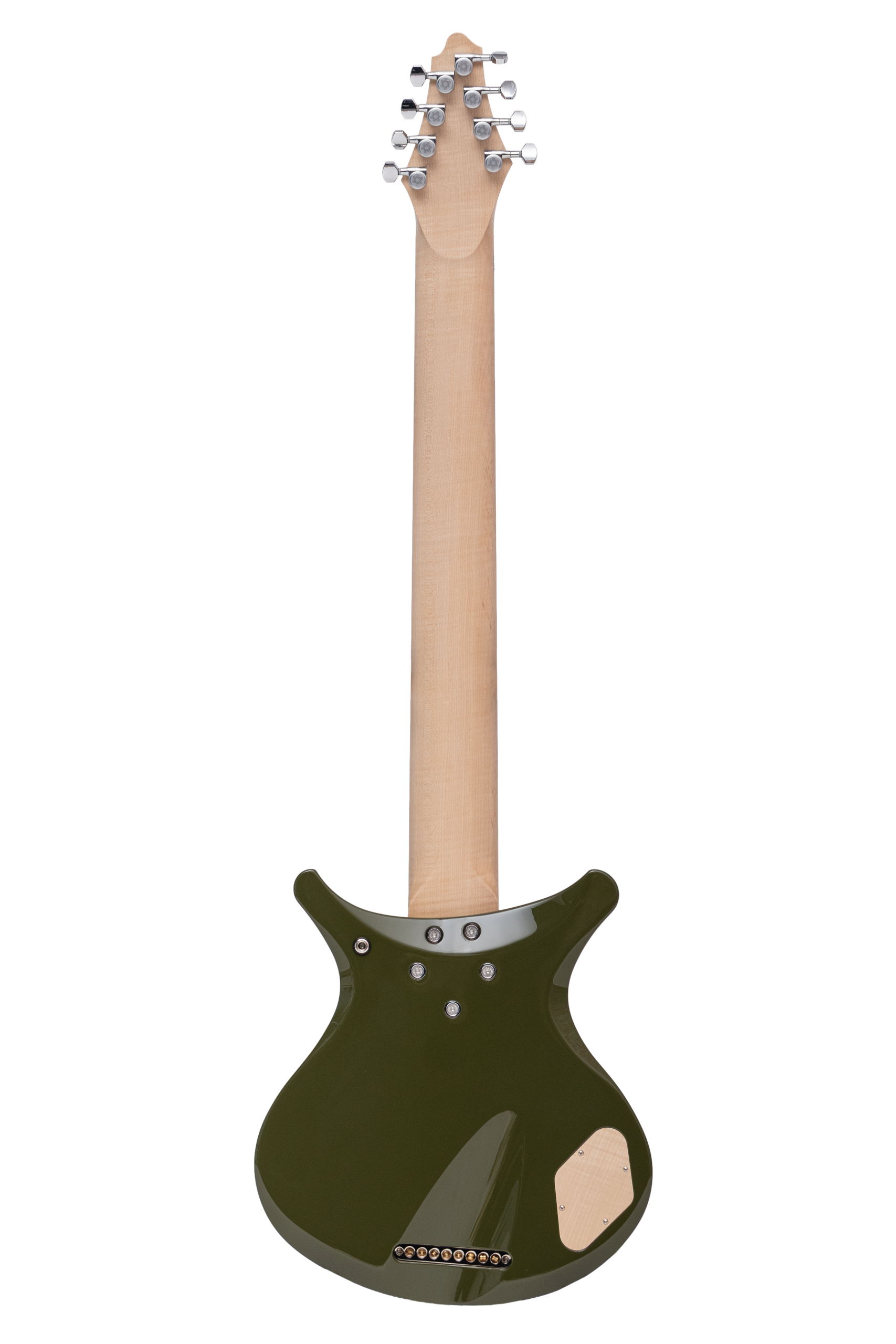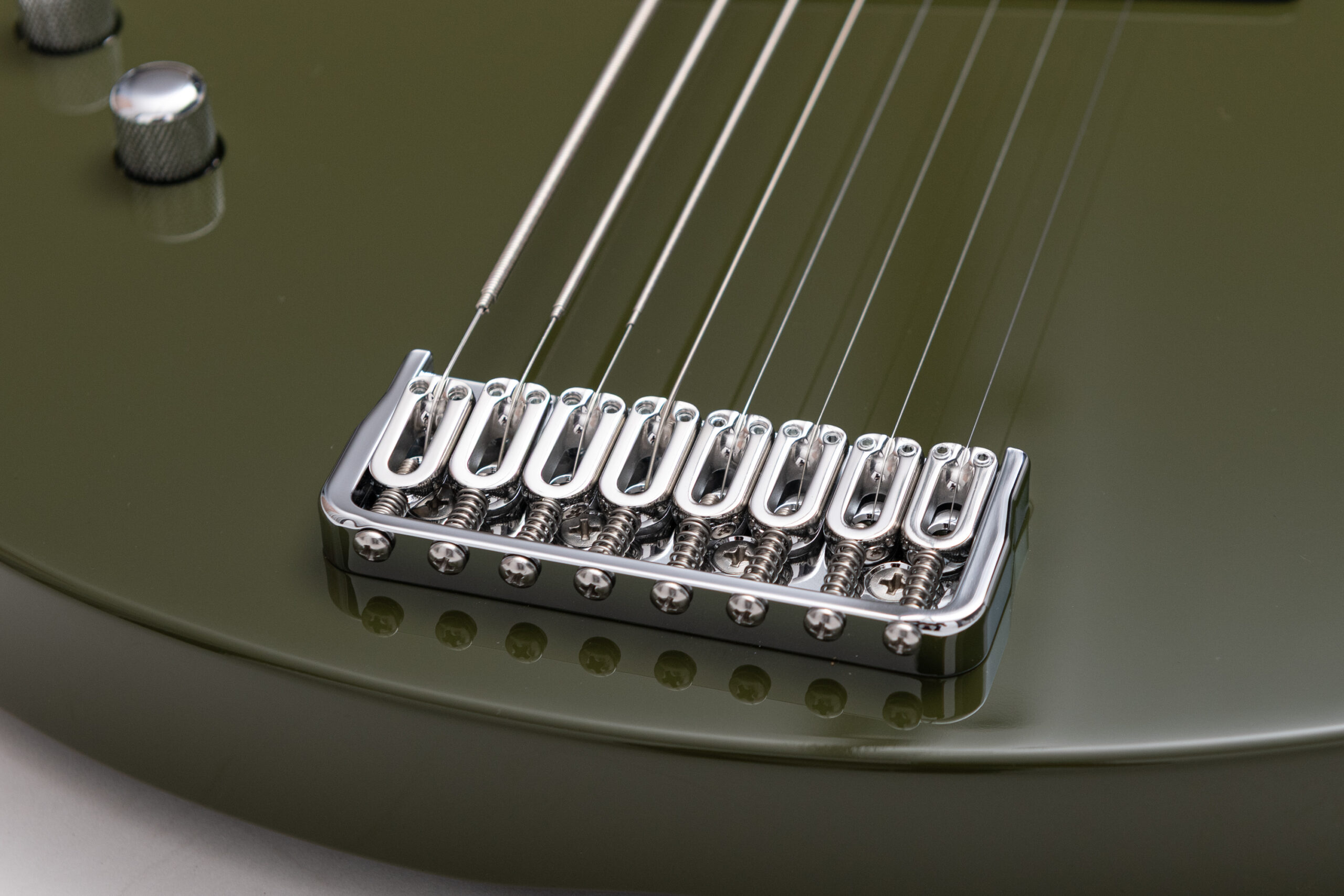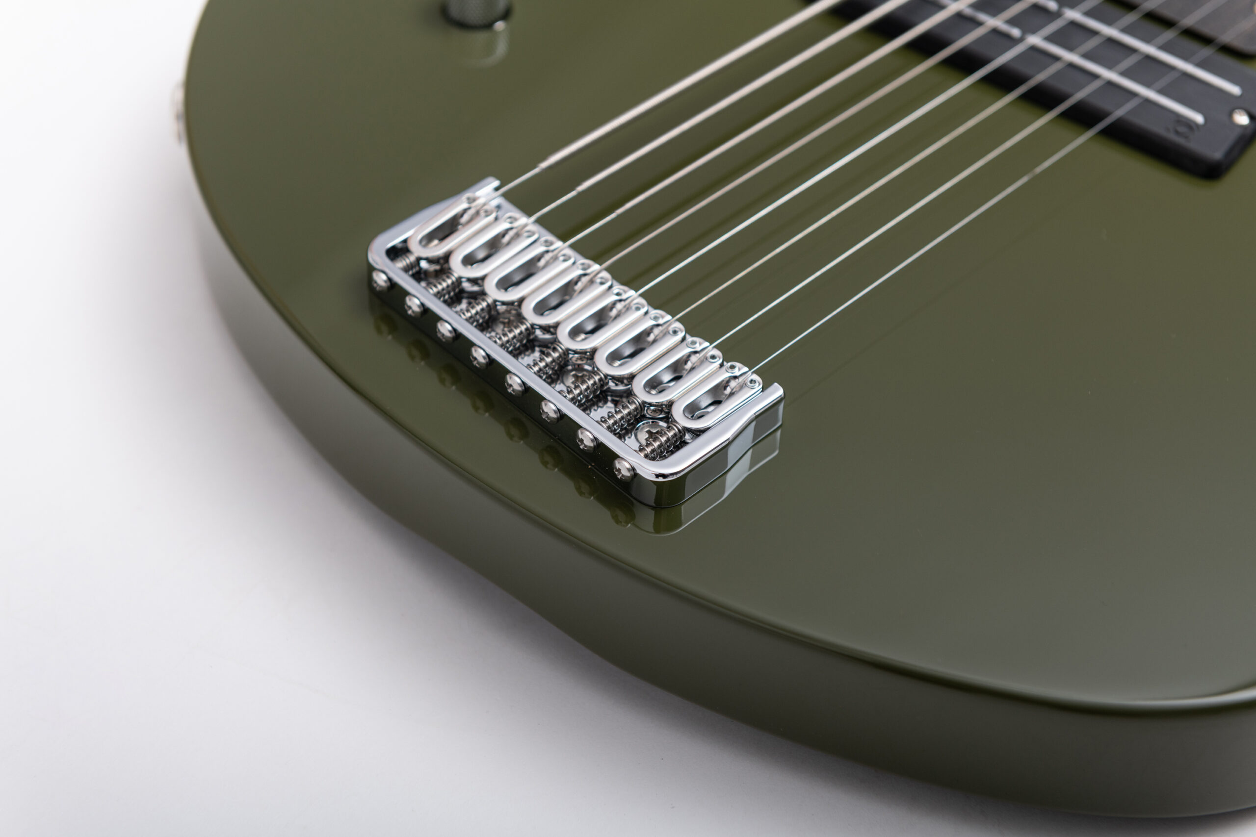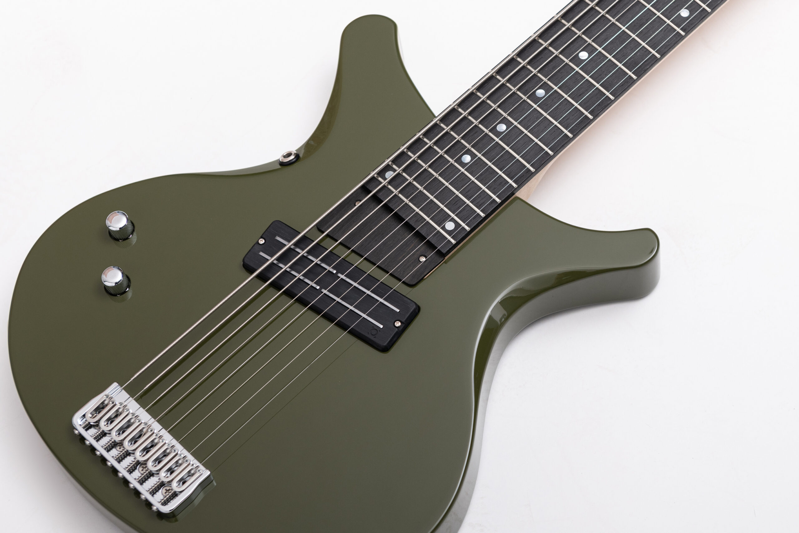 • basswood body in olive drab • true oil neck • maple neck • bog oak fretboard • chrome hardware • Jim Dunlop Straplok system • 1x Nova Custom 8- string pickup  • volume, tone • Tuning: Bb F C G D A C D
