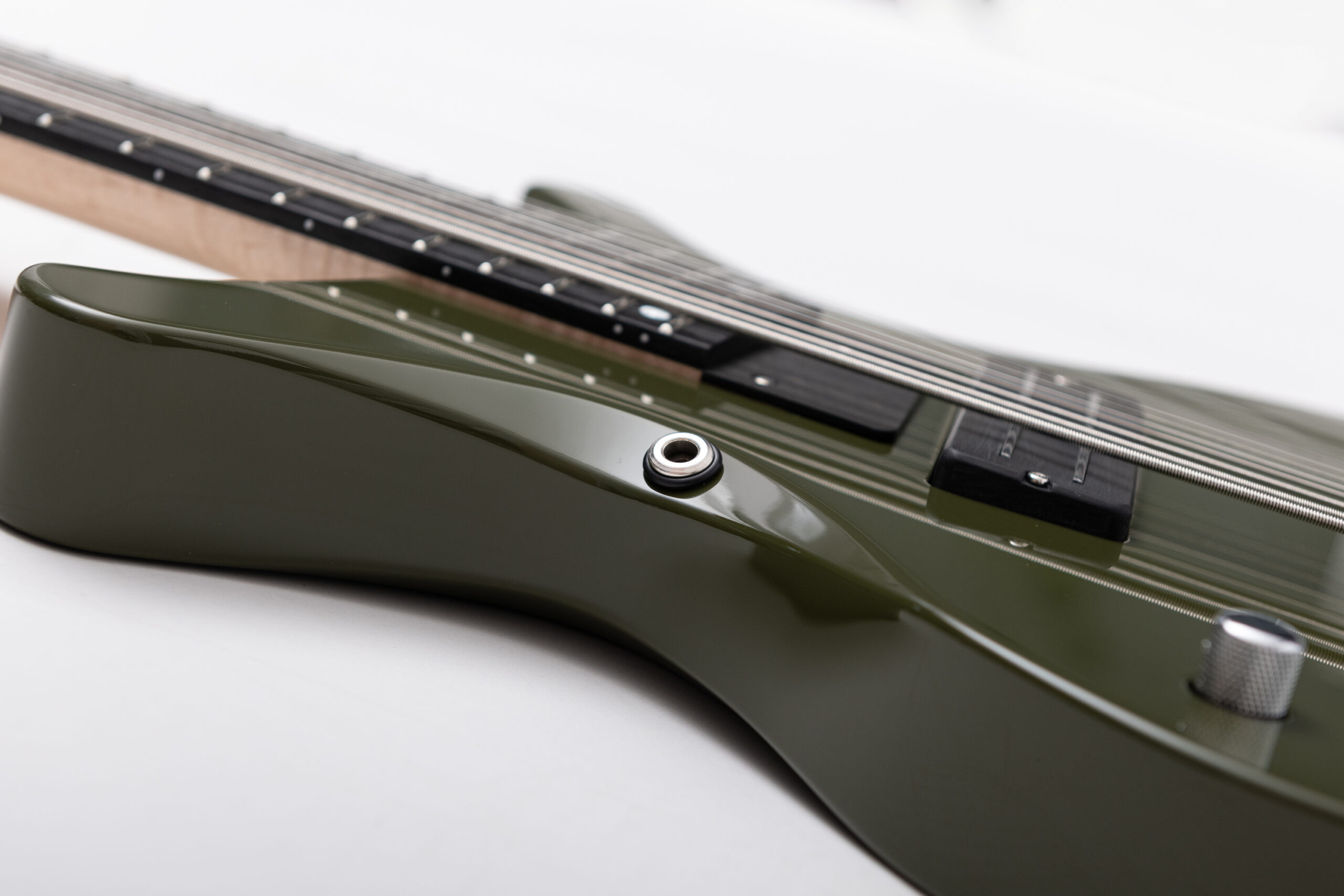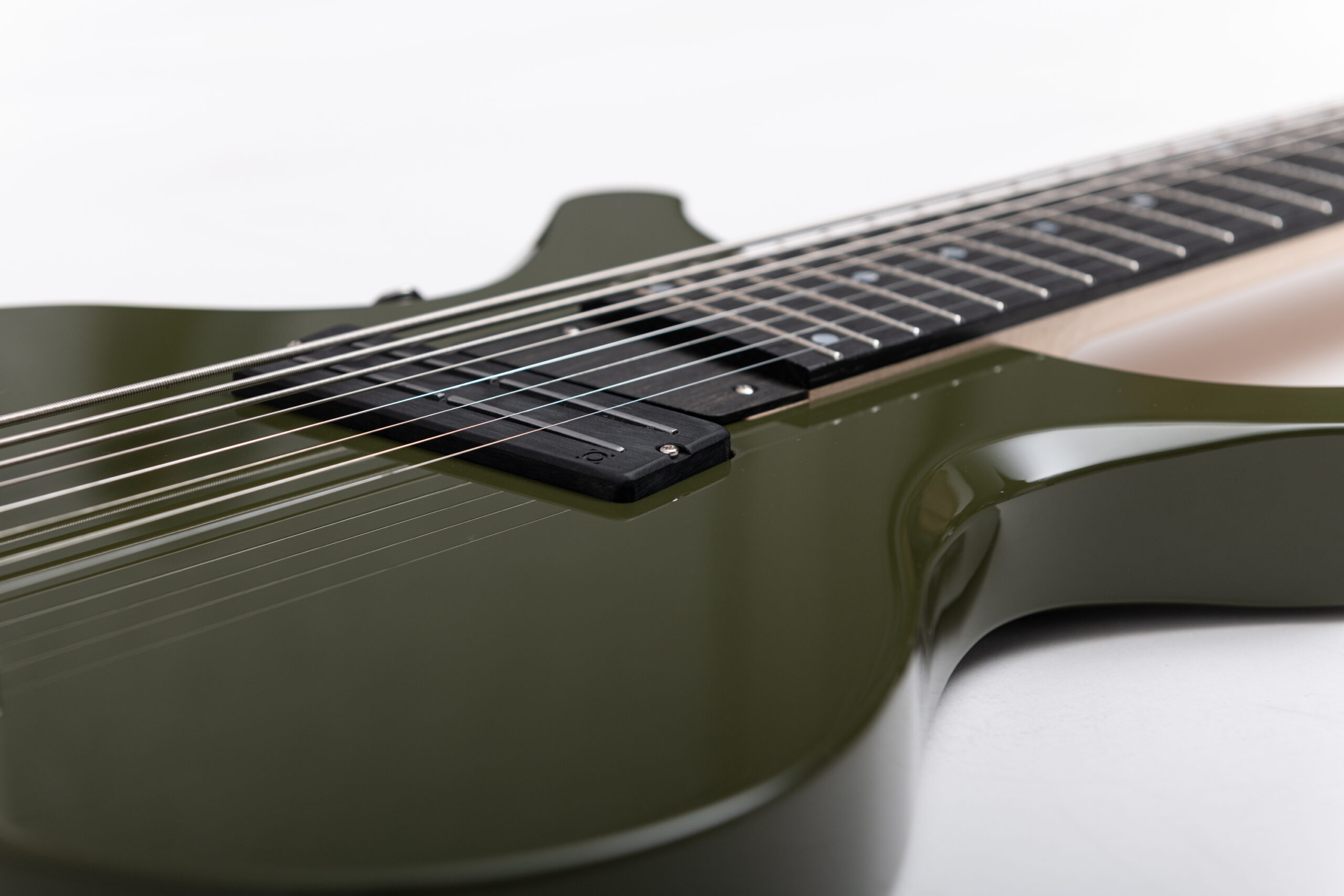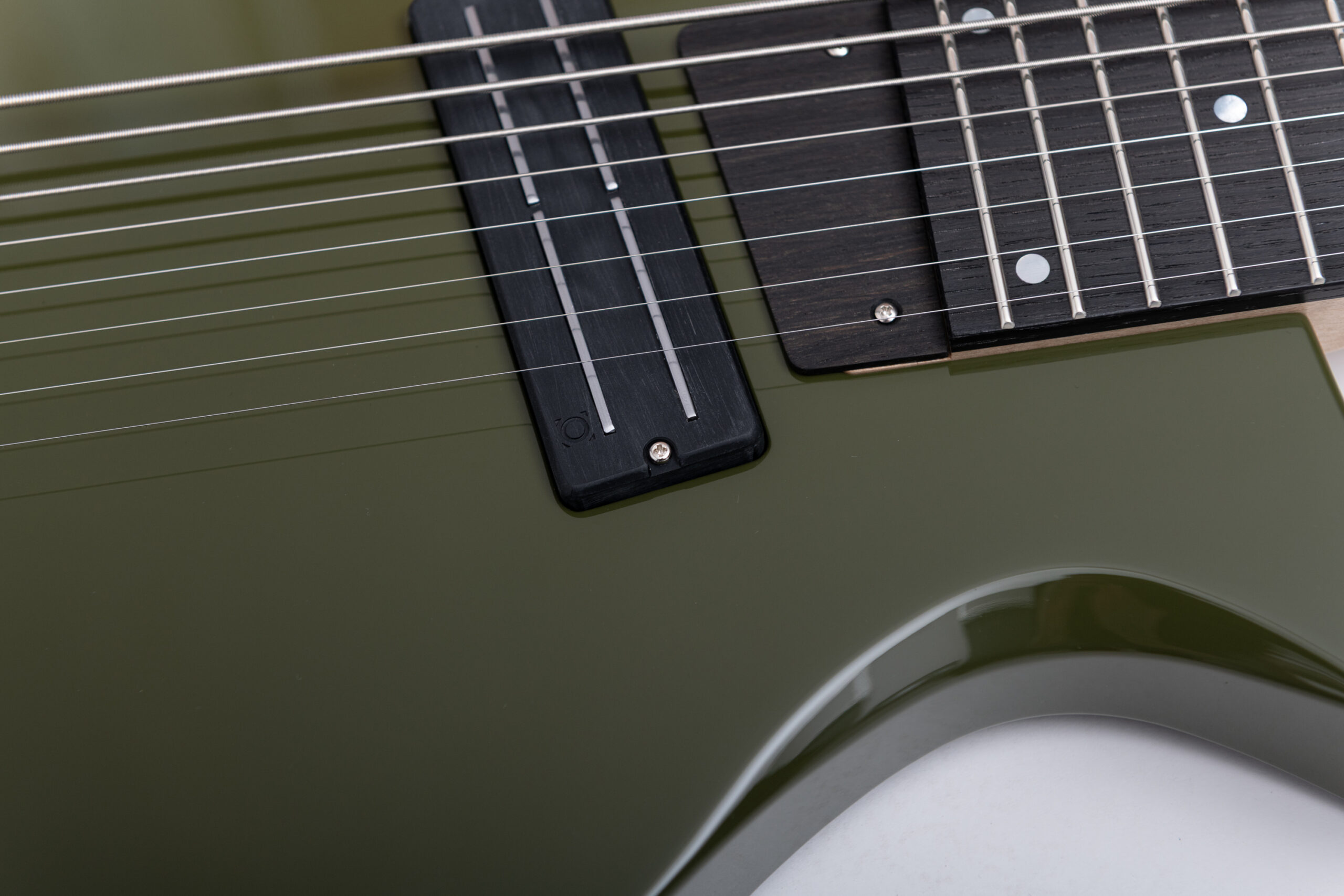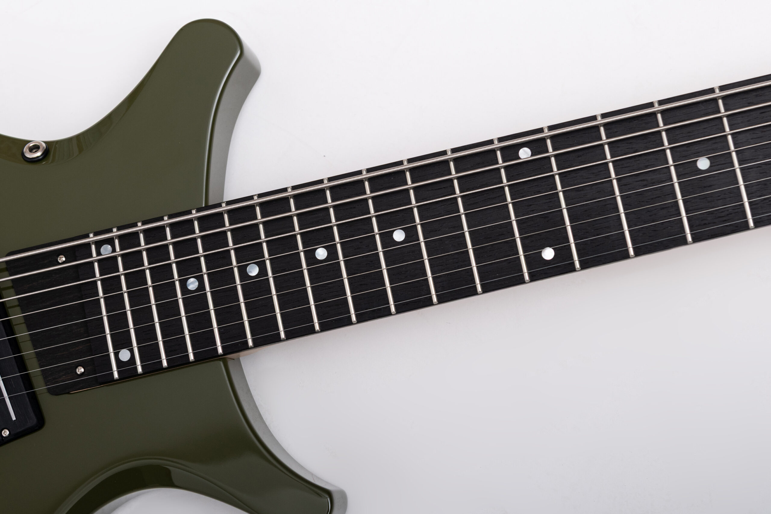• basswood body in olive drab • true oil neck • maple neck • bog oak fretboard • chrome hardware • Jim Dunlop Straplok system • 1x Nova Custom 8- string pickup  • volume, tone • Tuning: Bb F C G D A C D