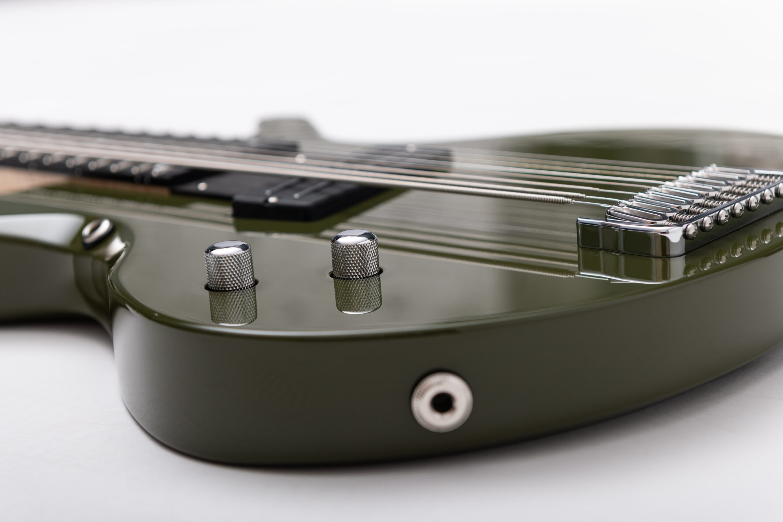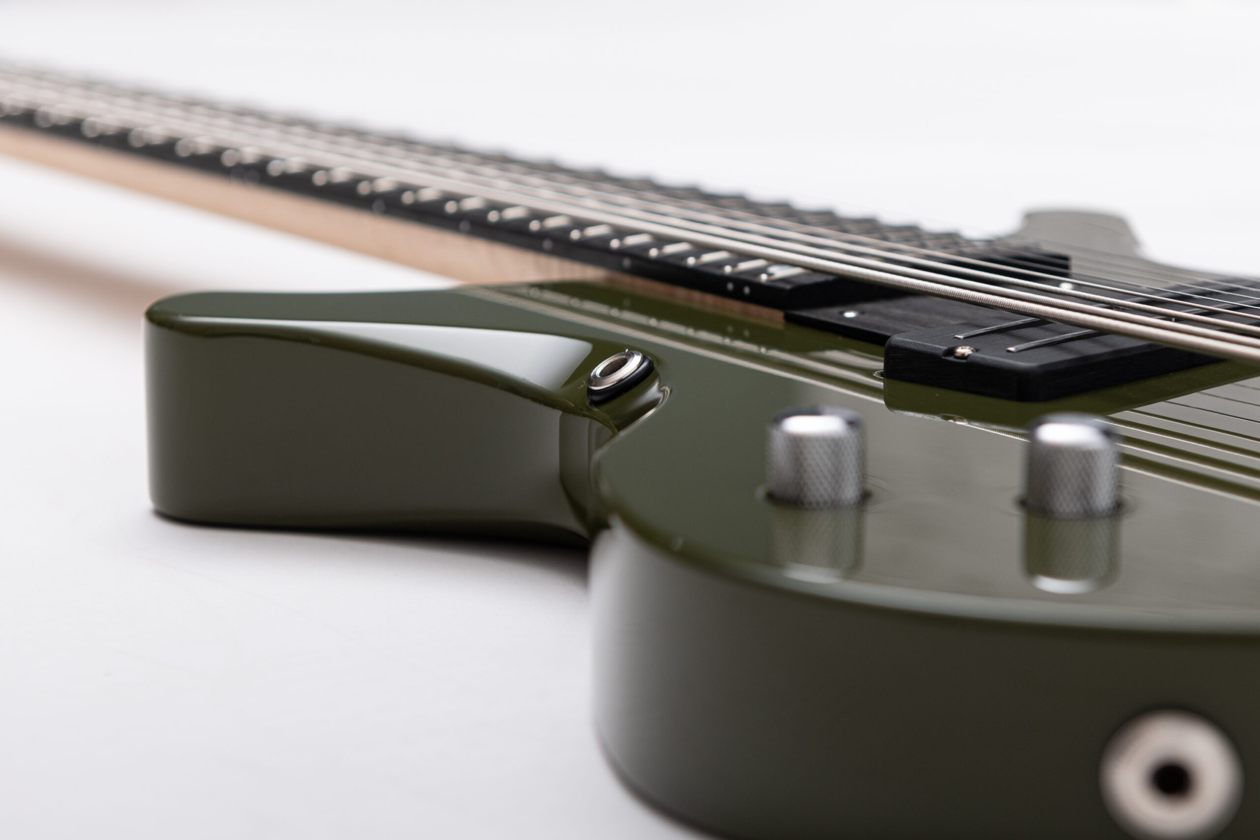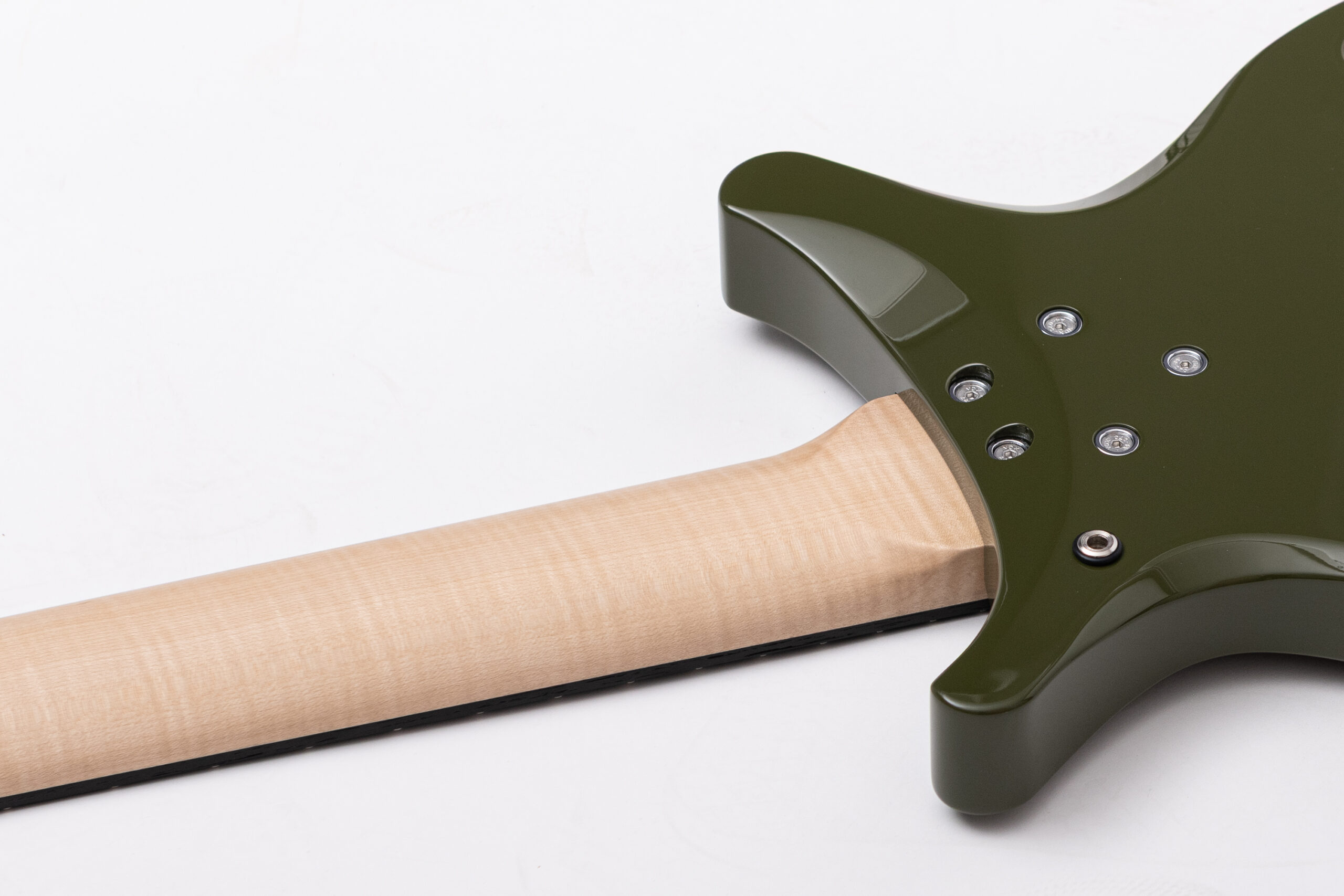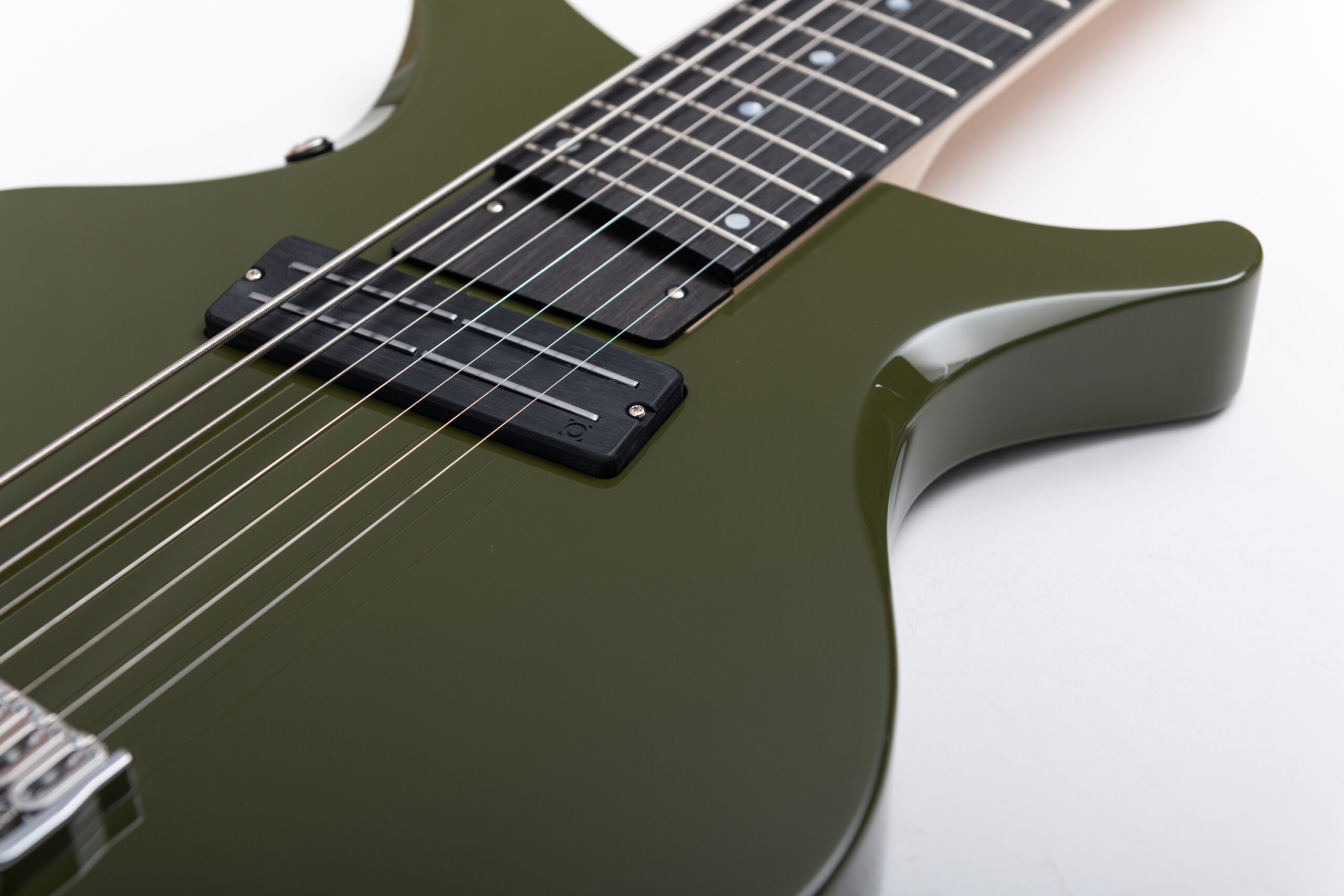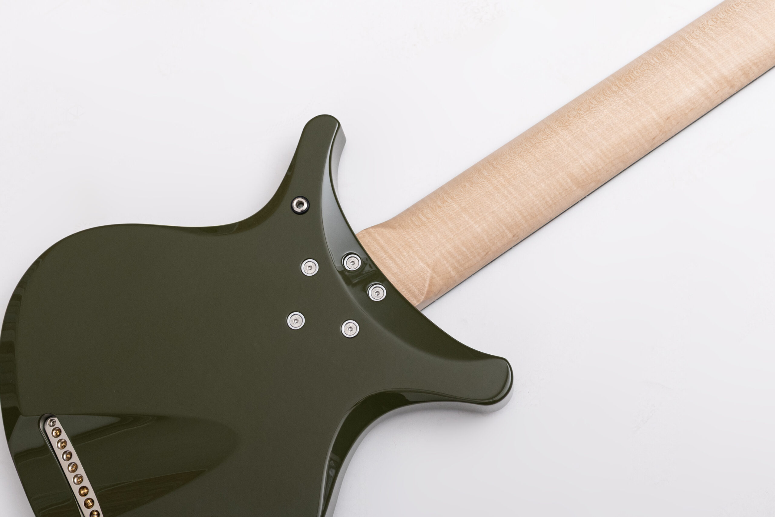 • basswood body in olive drab • true oil neck • maple neck • bog oak fretboard • chrome hardware • Jim Dunlop Straplok system • 1x Nova Custom 8- string pickup  • volume, tone • Tuning: Bb F C G D A C D