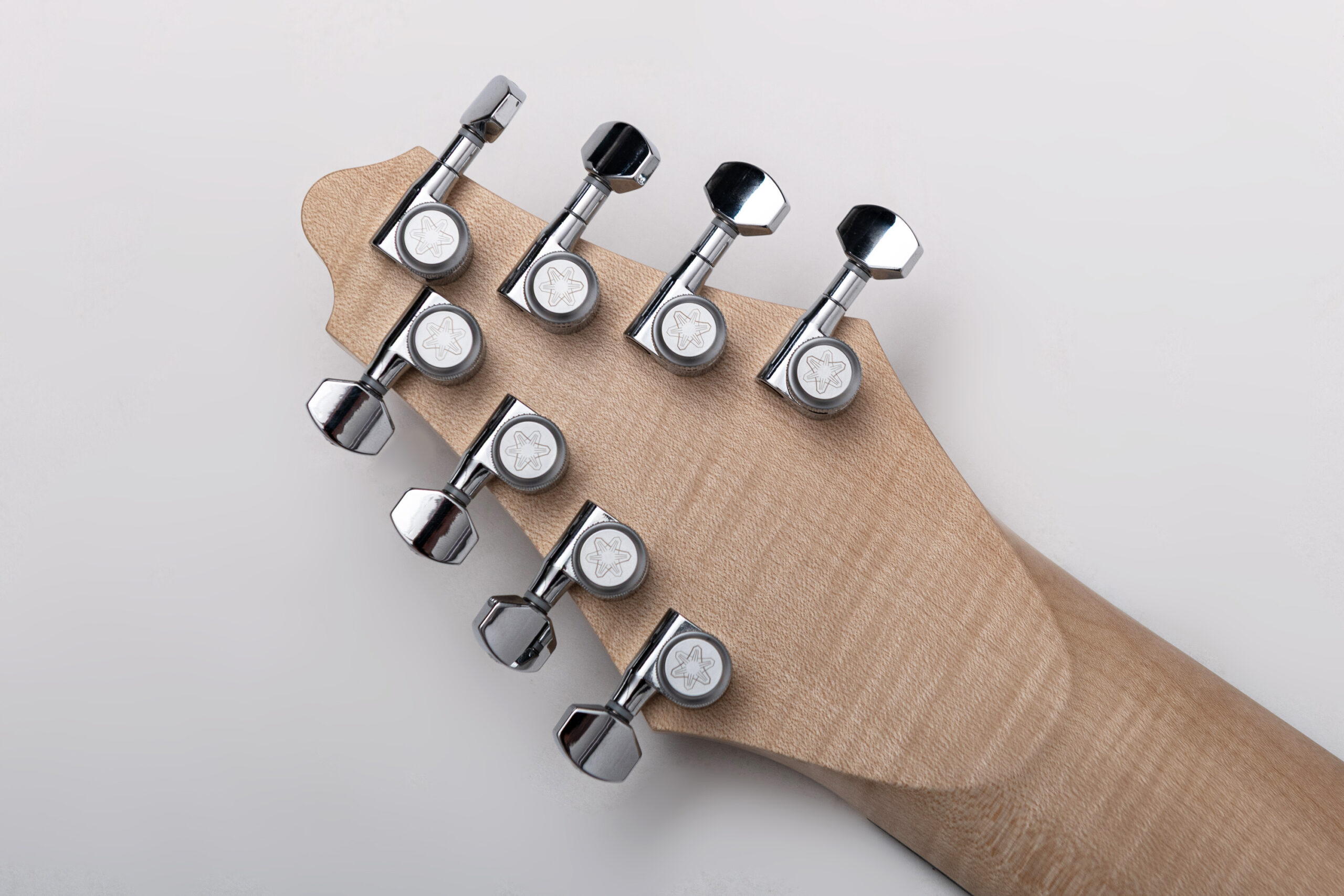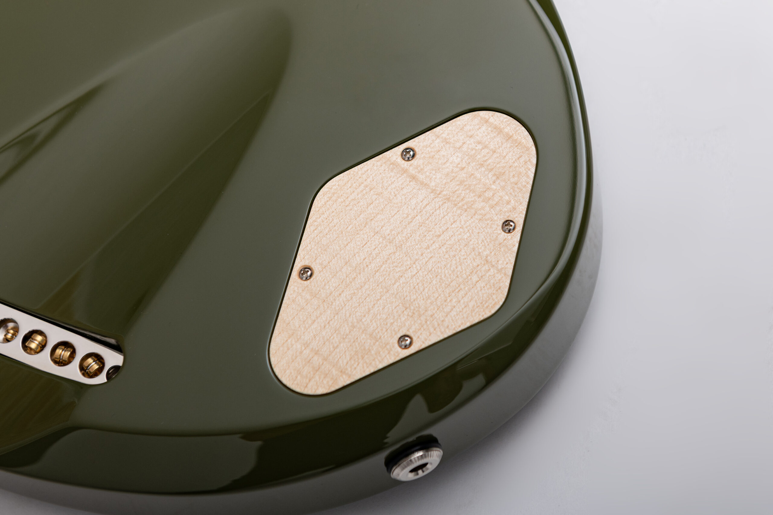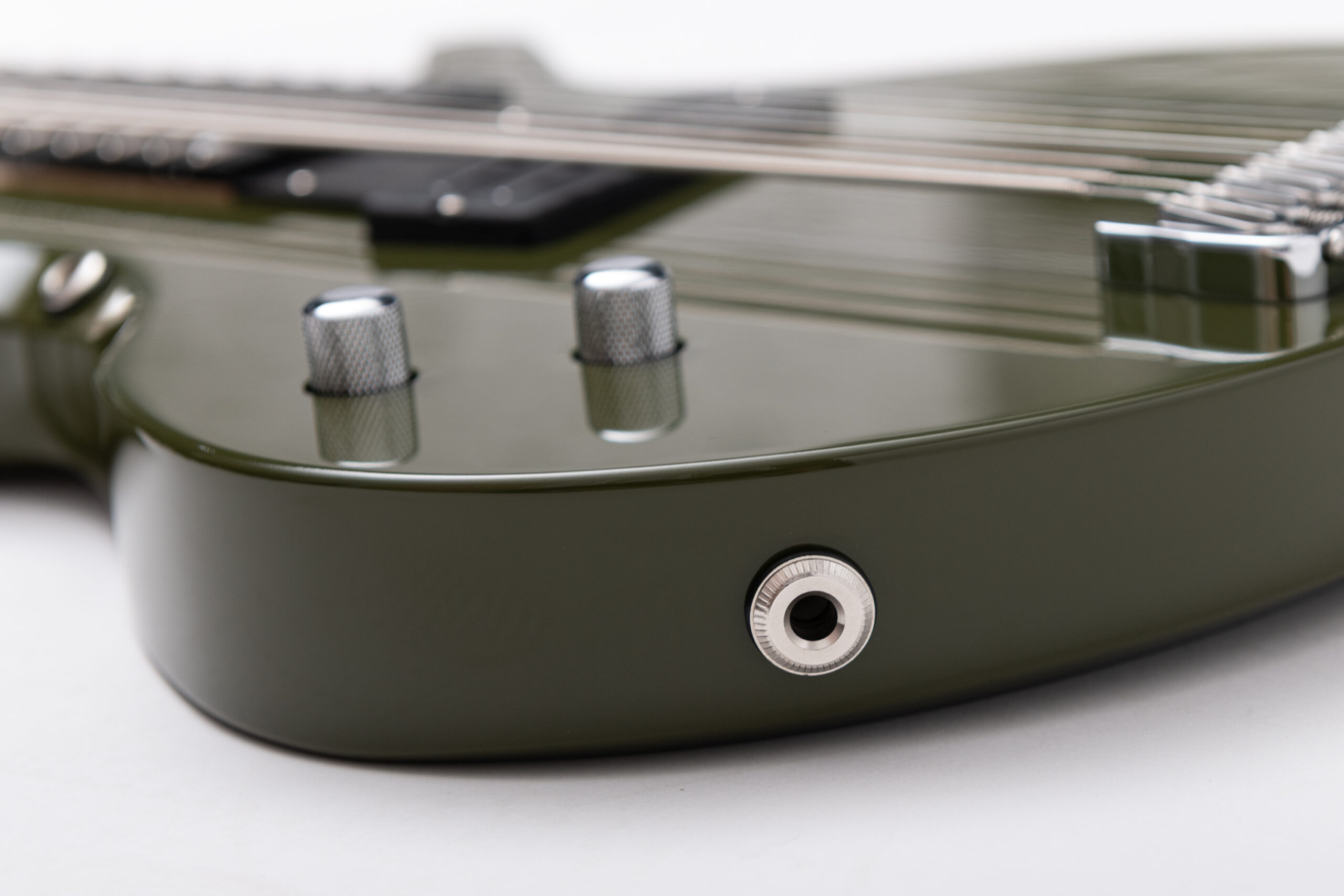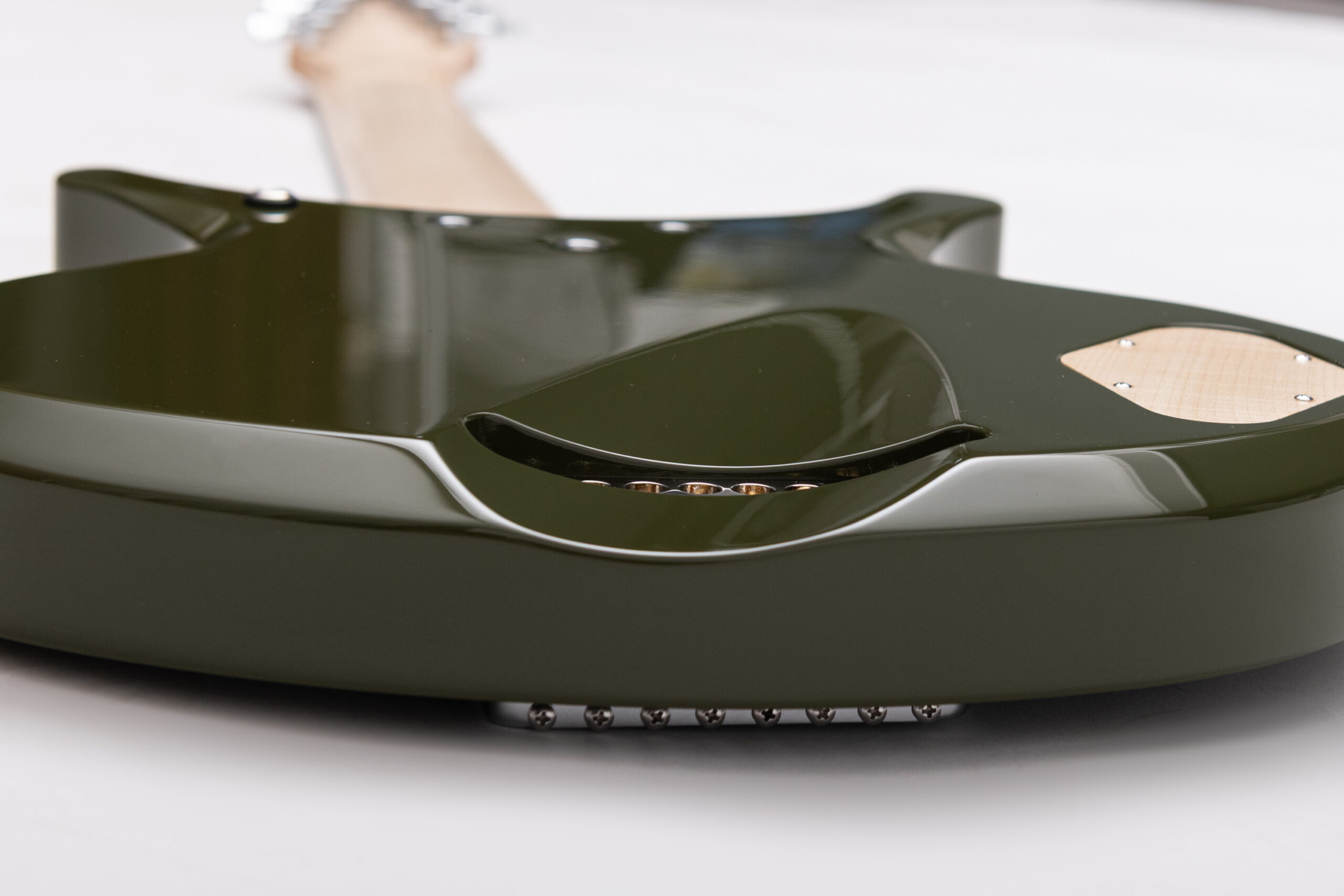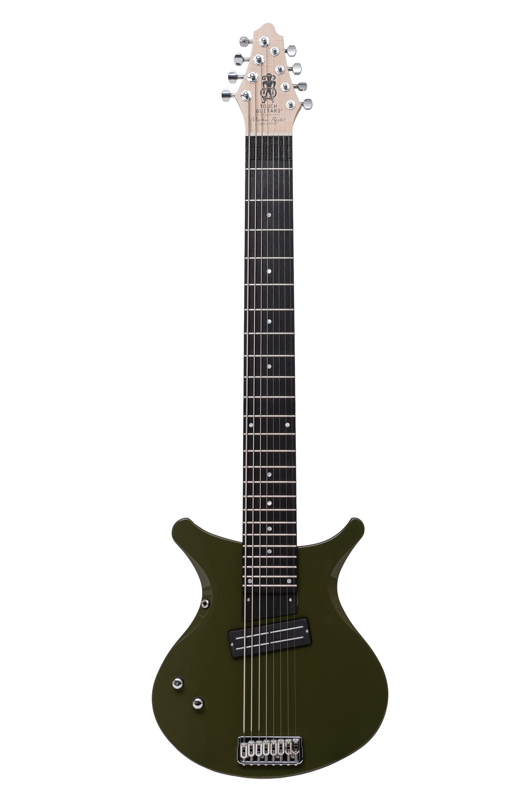 • basswood body in olive drab • true oil neck • maple neck • bog oak fretboard • chrome hardware • Jim Dunlop Straplok system • 1x Nova Custom 8- string pickup  • volume, tone • Tuning: Bb F C G D A C D