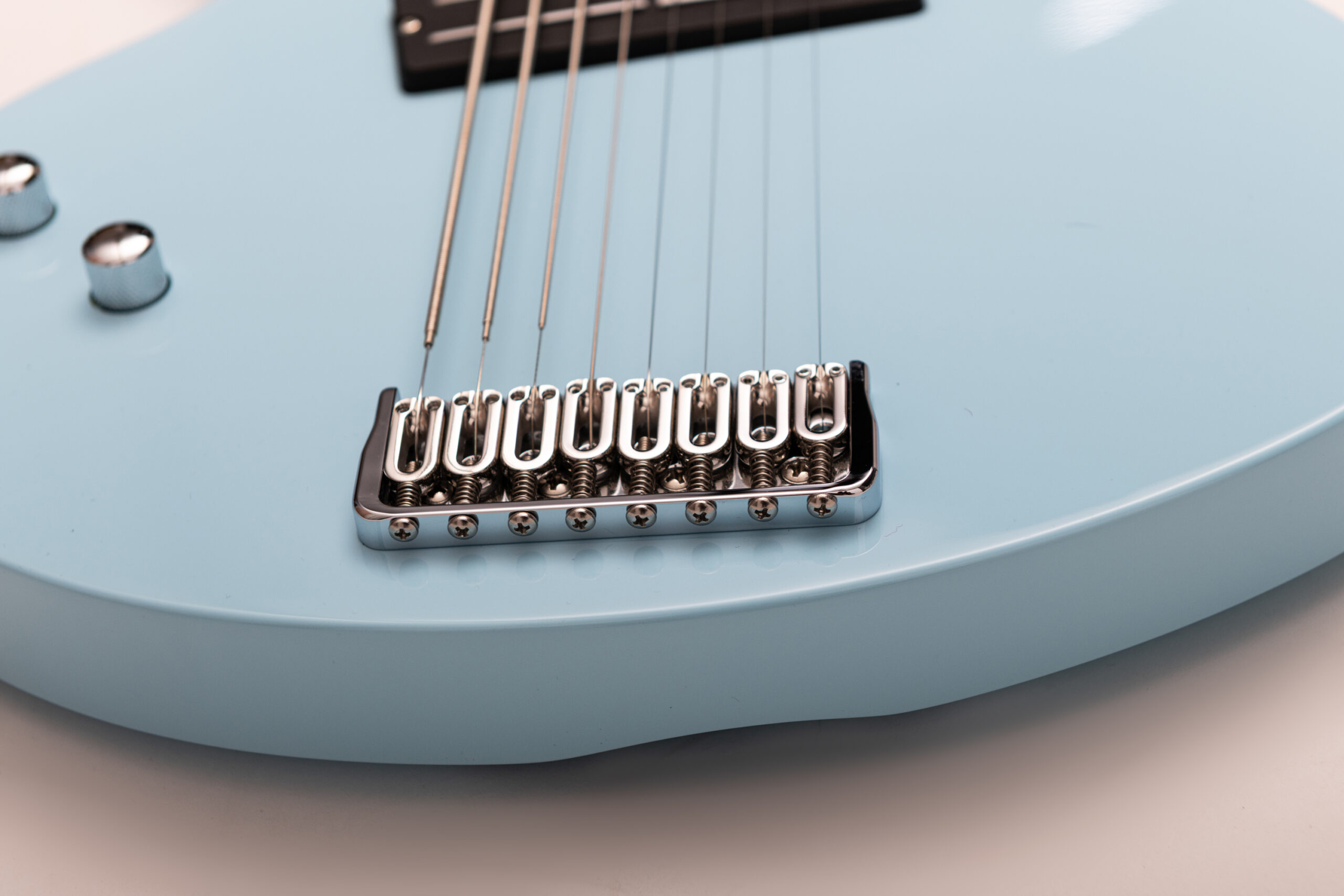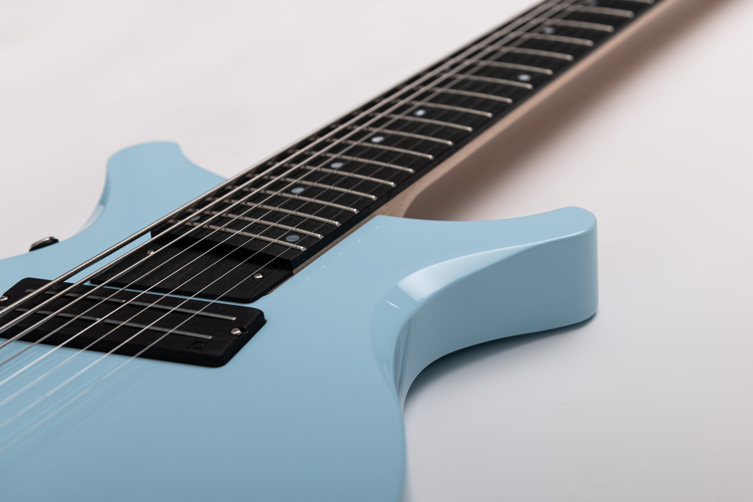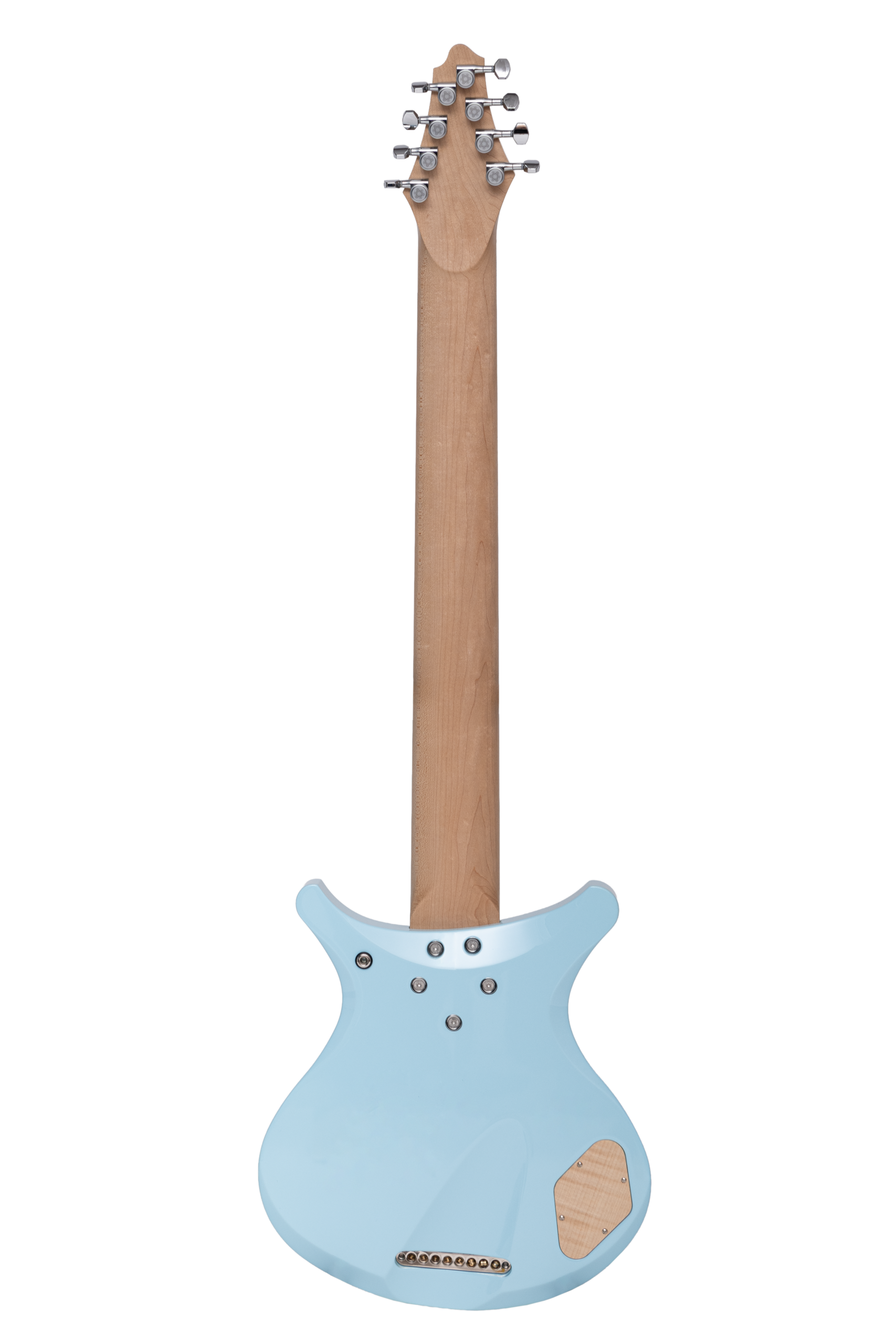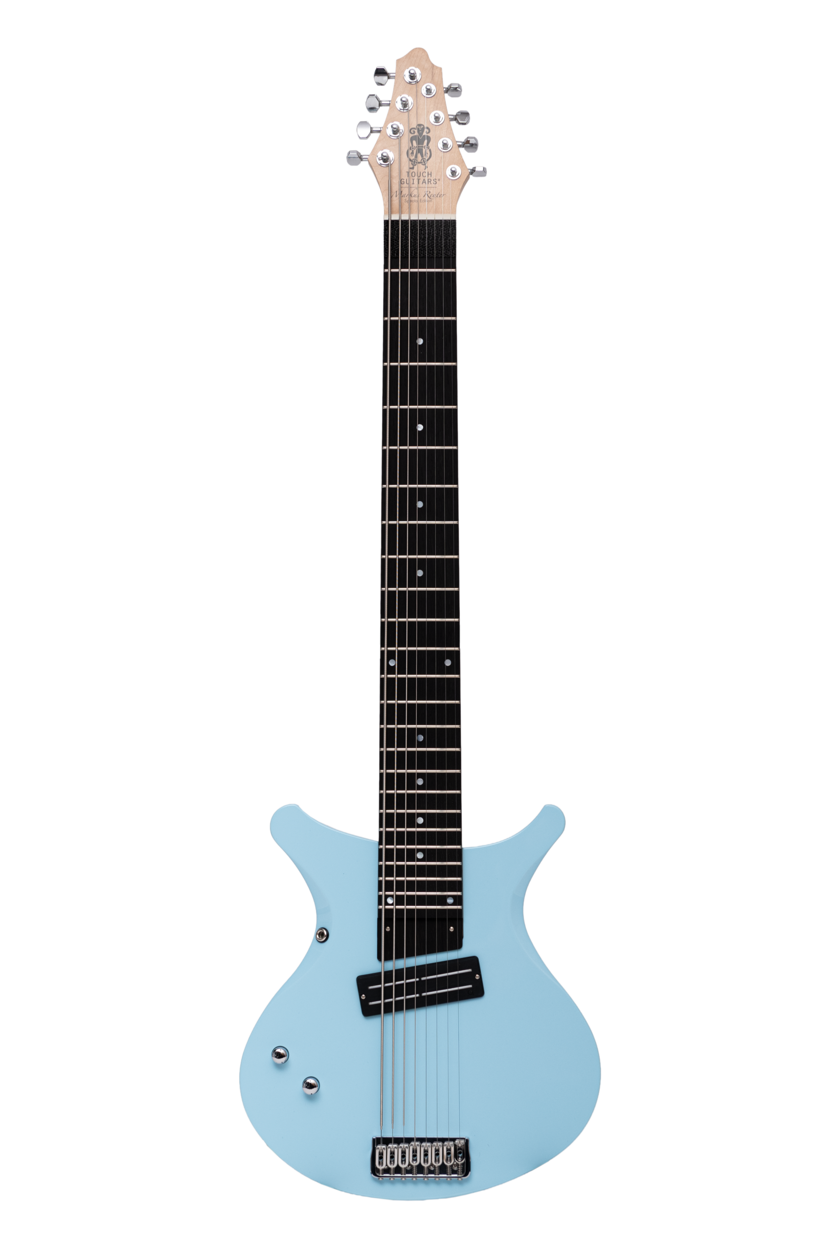 • basswood body in pelham blue • true oil neck • maple neck • bog oak fretboard • chrome hardware • Jim Dunlop Straplok system • 1x Nova Custom 8- string pickup  • volume, tone • Tuning: Bb F C G D A C D