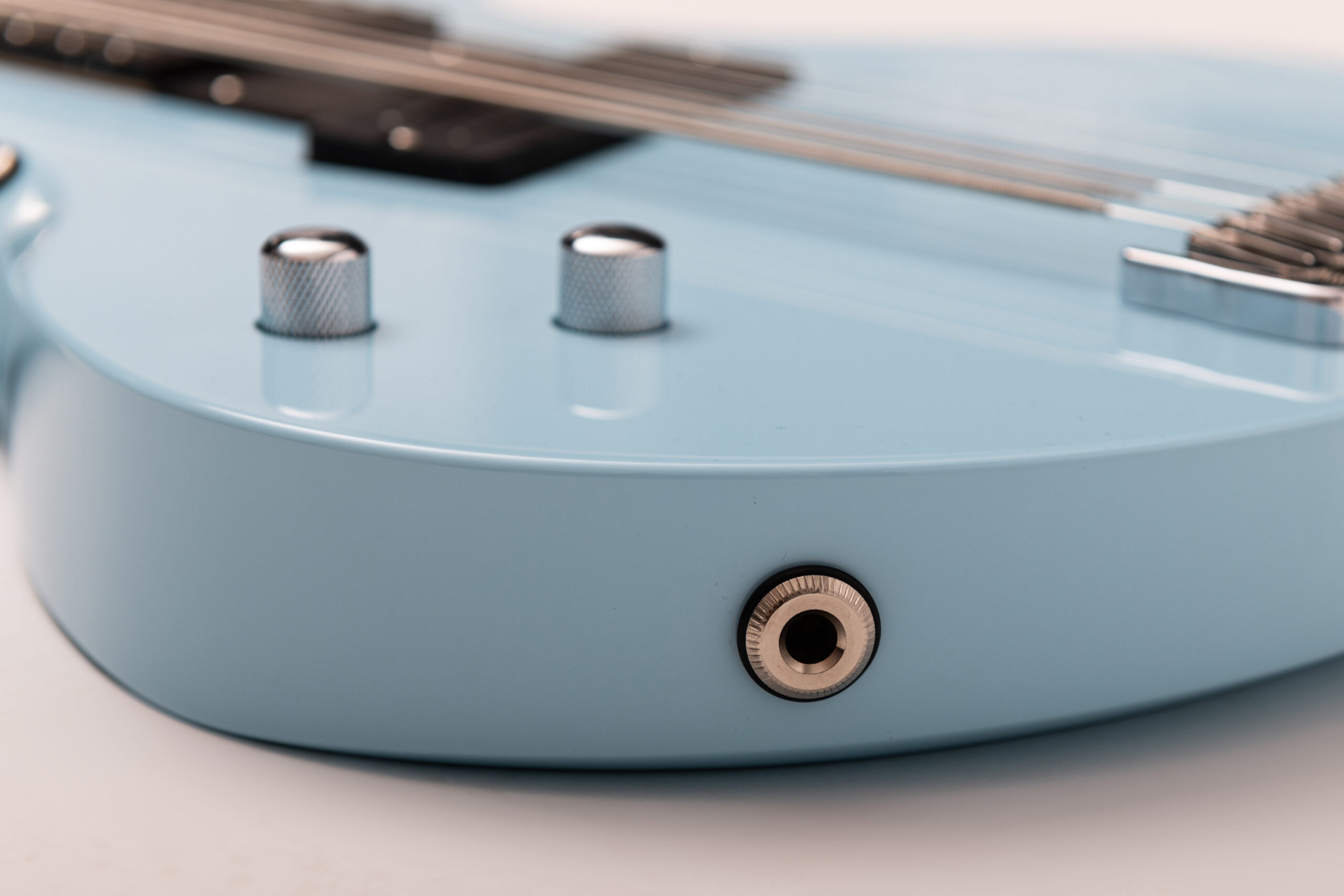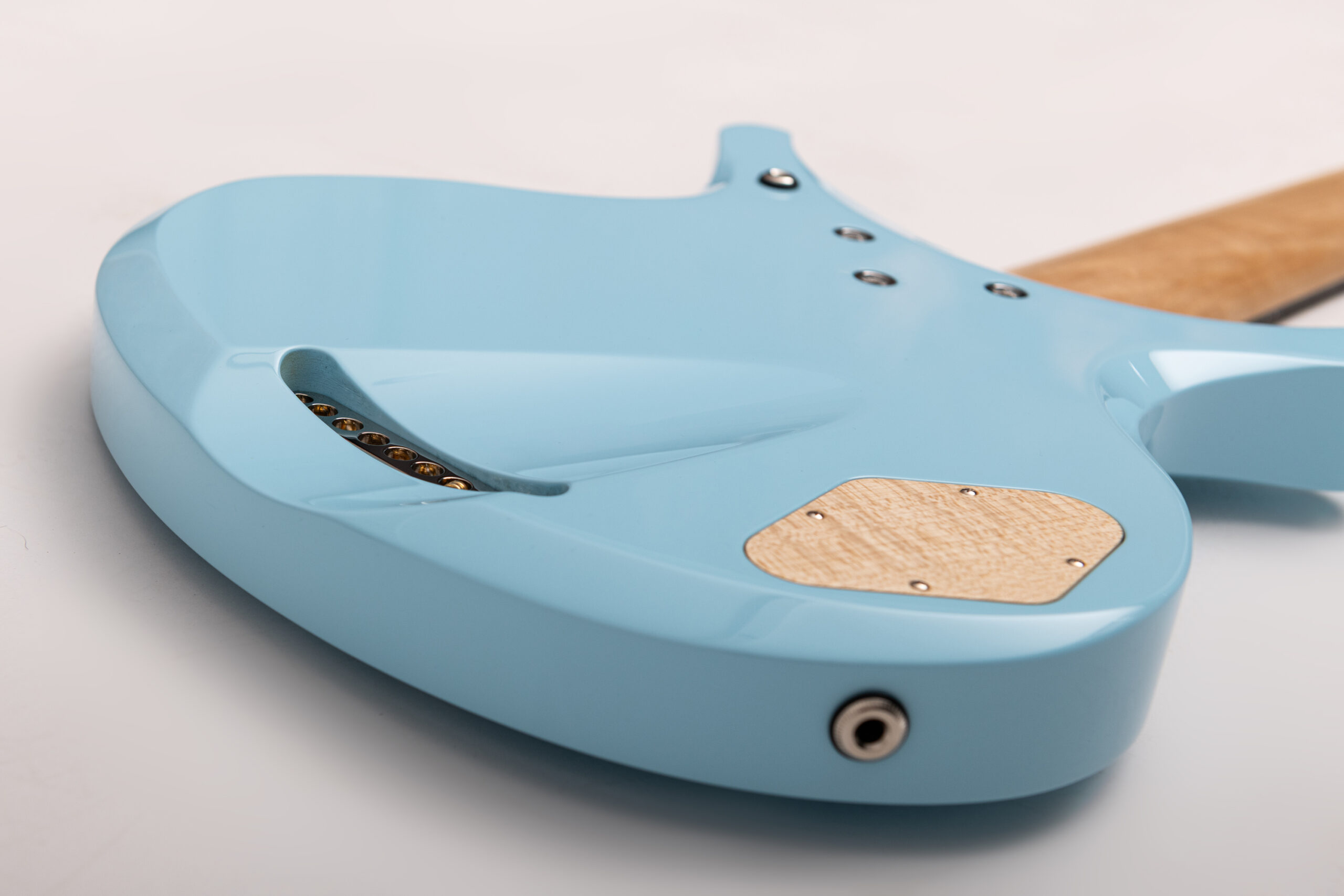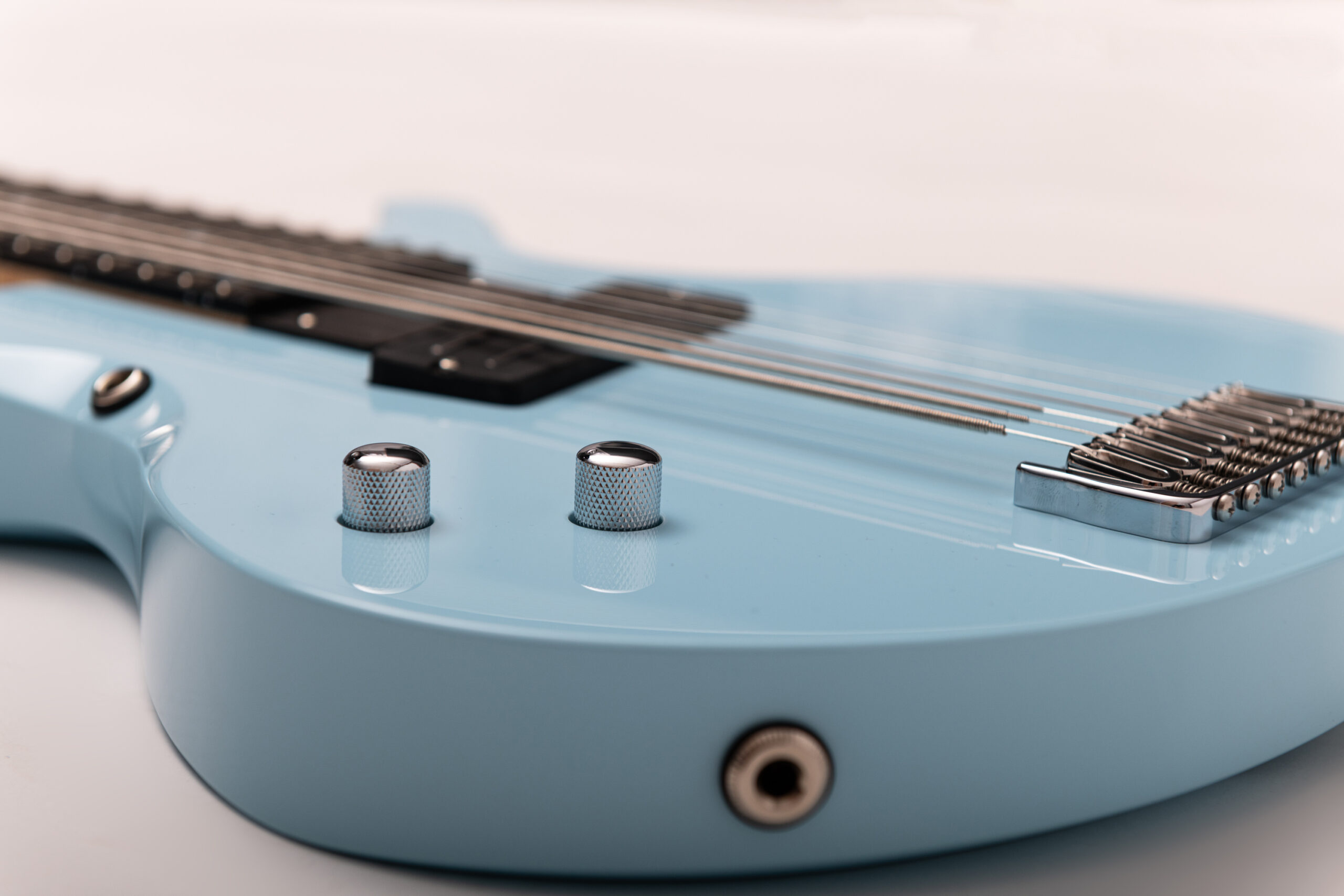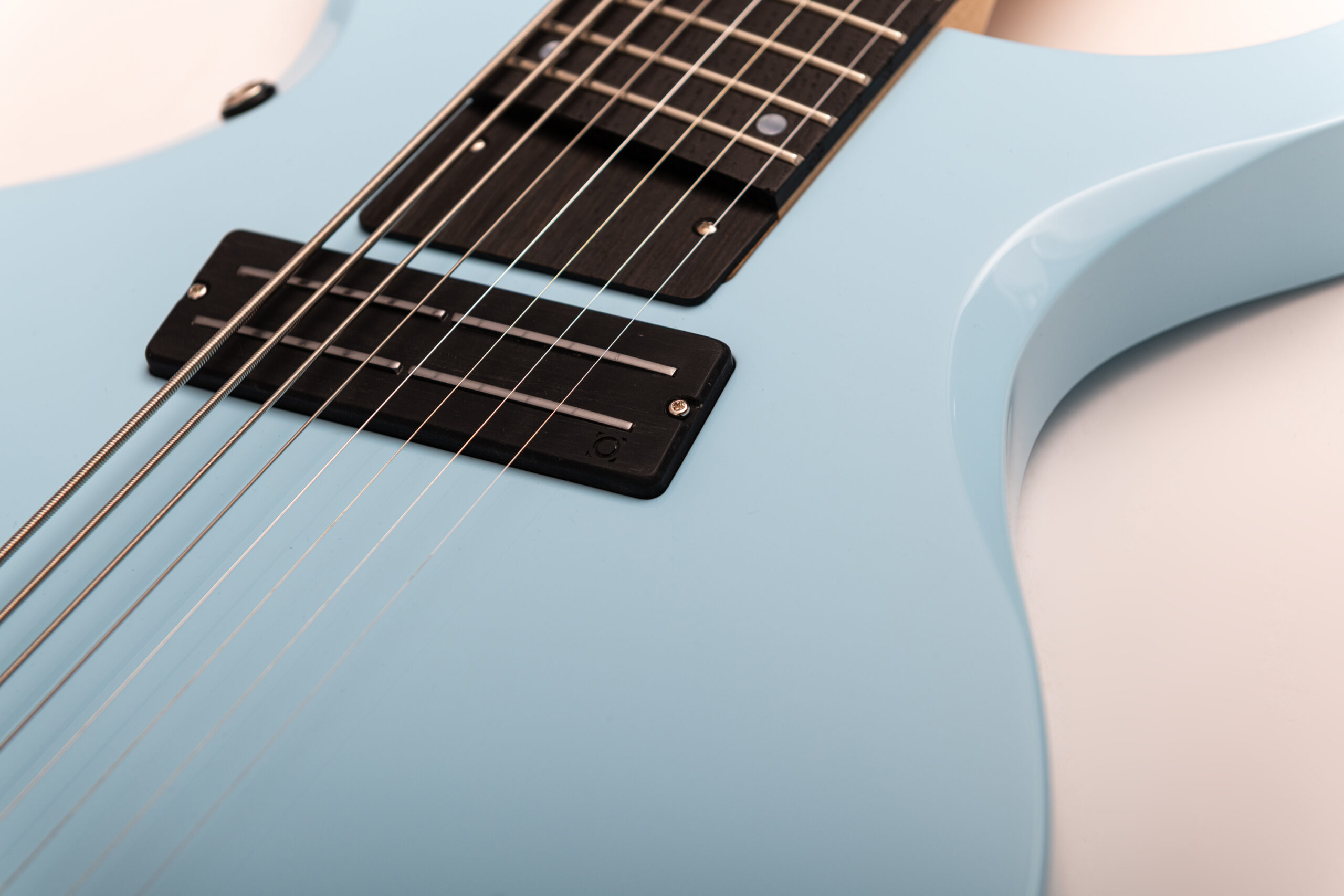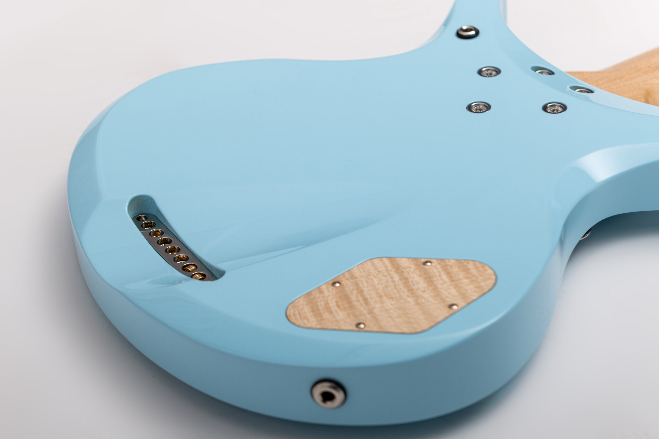 • basswood body in pelham blue • true oil neck • maple neck • bog oak fretboard • chrome hardware • Jim Dunlop Straplok system • 1x Nova Custom 8- string pickup  • volume, tone • Tuning: Bb F C G D A C D