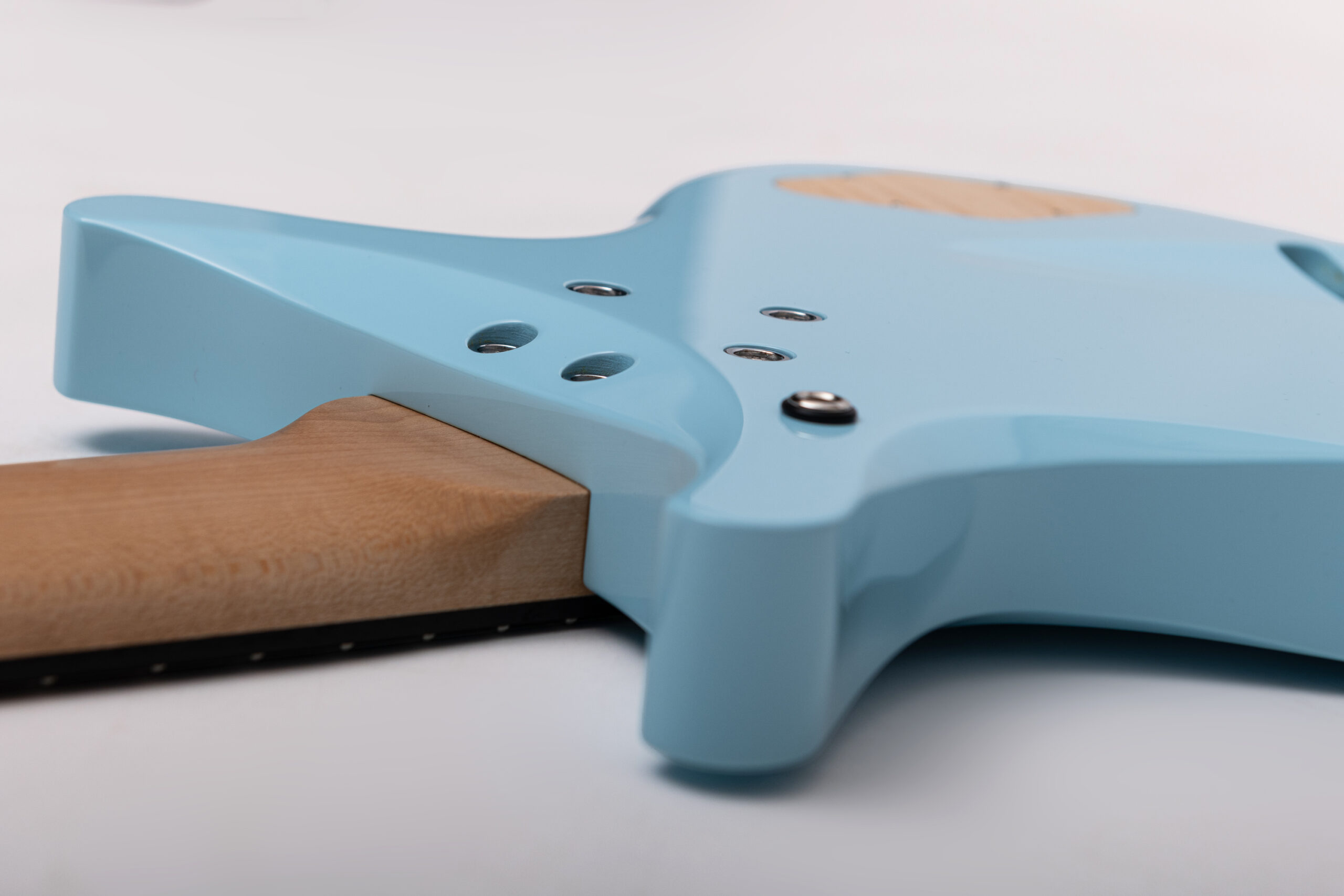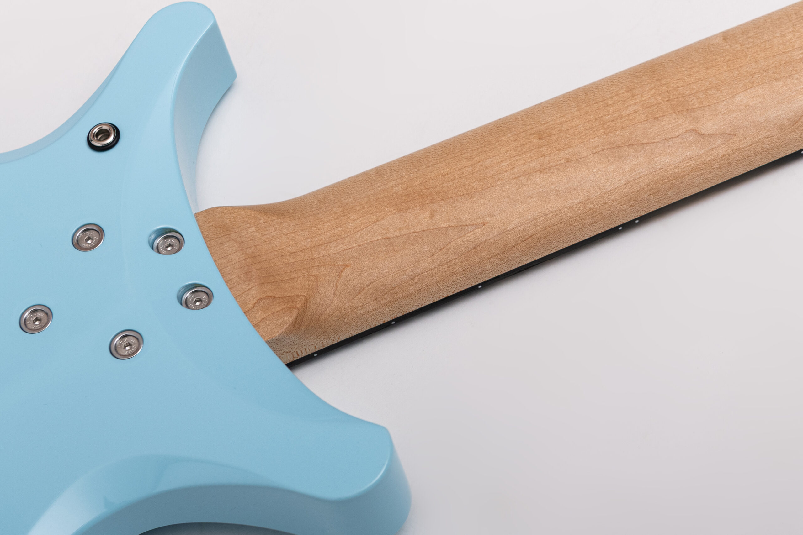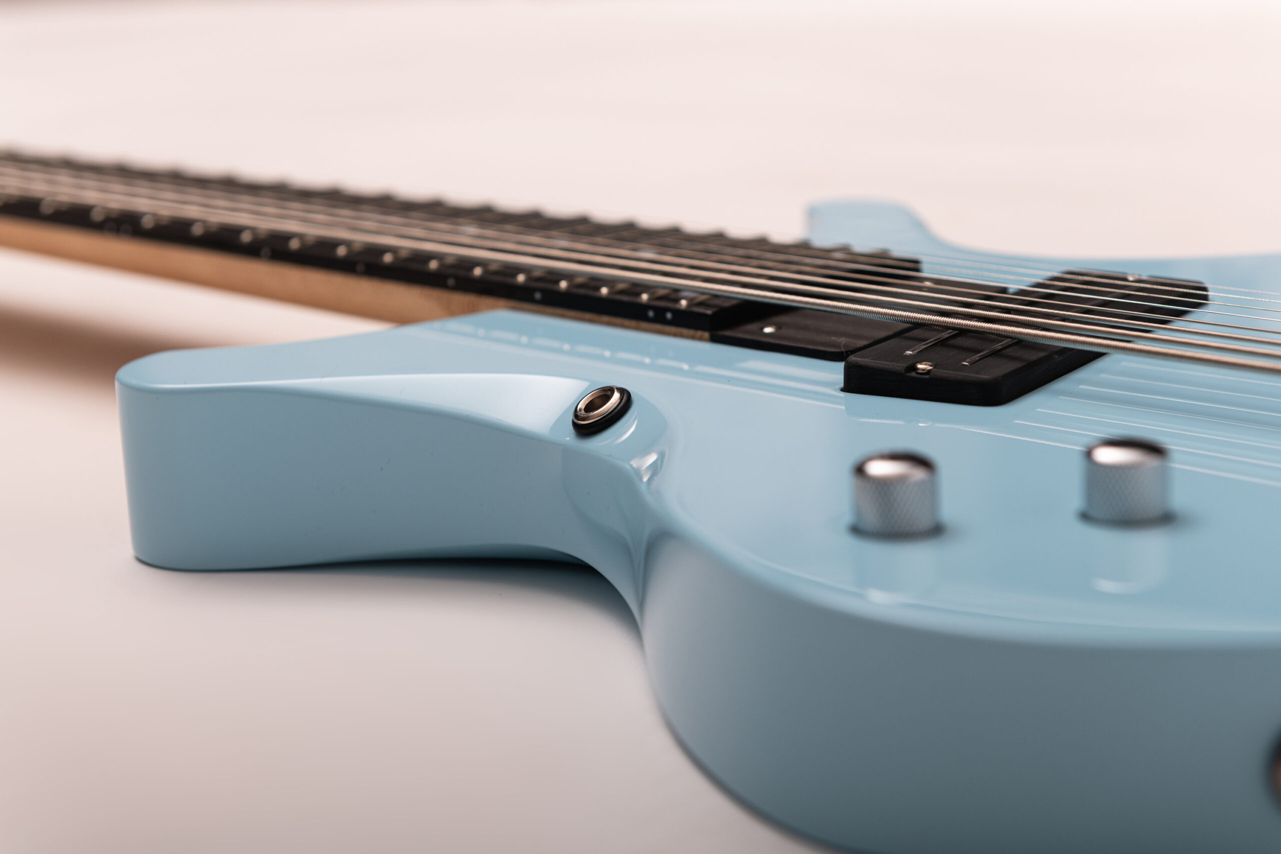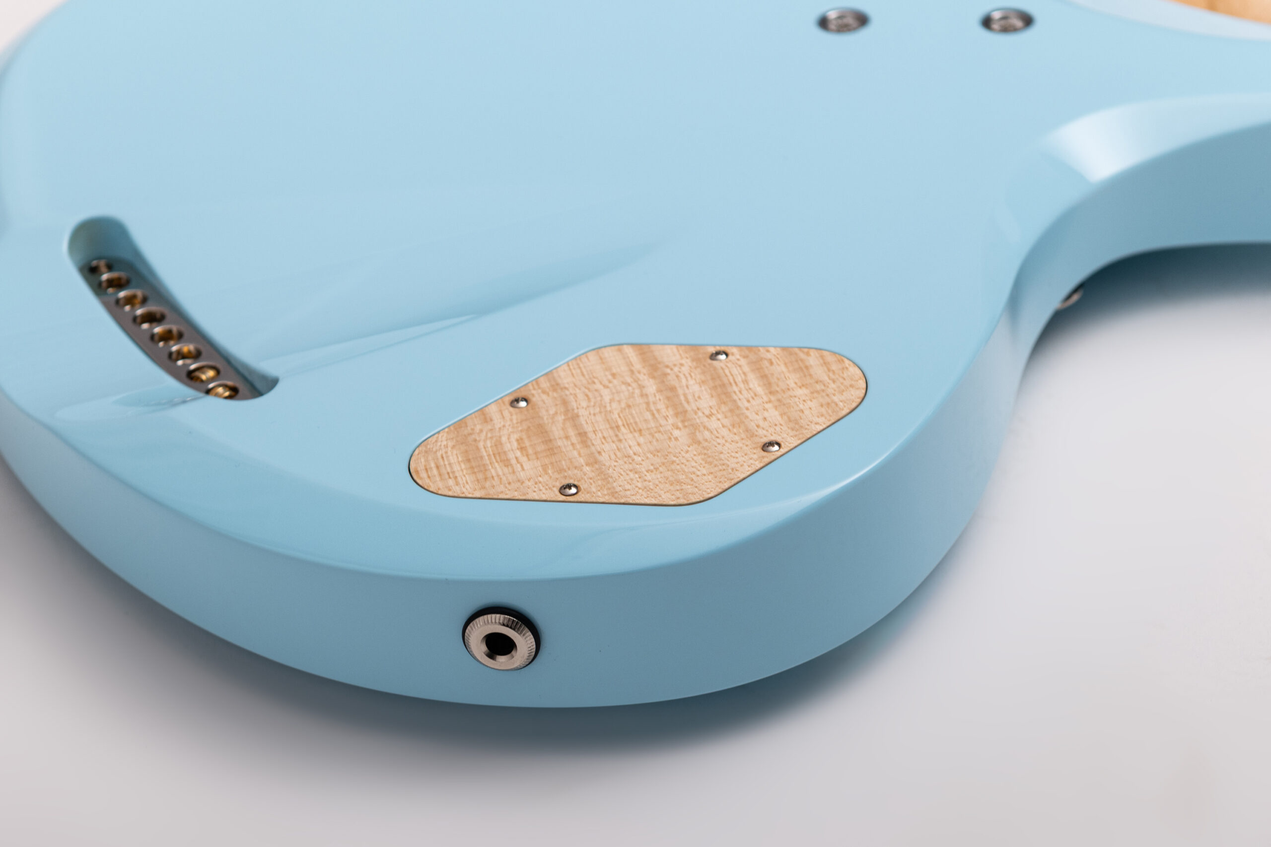 • basswood body in pelham blue • true oil neck • maple neck • bog oak fretboard • chrome hardware • Jim Dunlop Straplok system • 1x Nova Custom 8- string pickup  • volume, tone • Tuning: Bb F C G D A C D