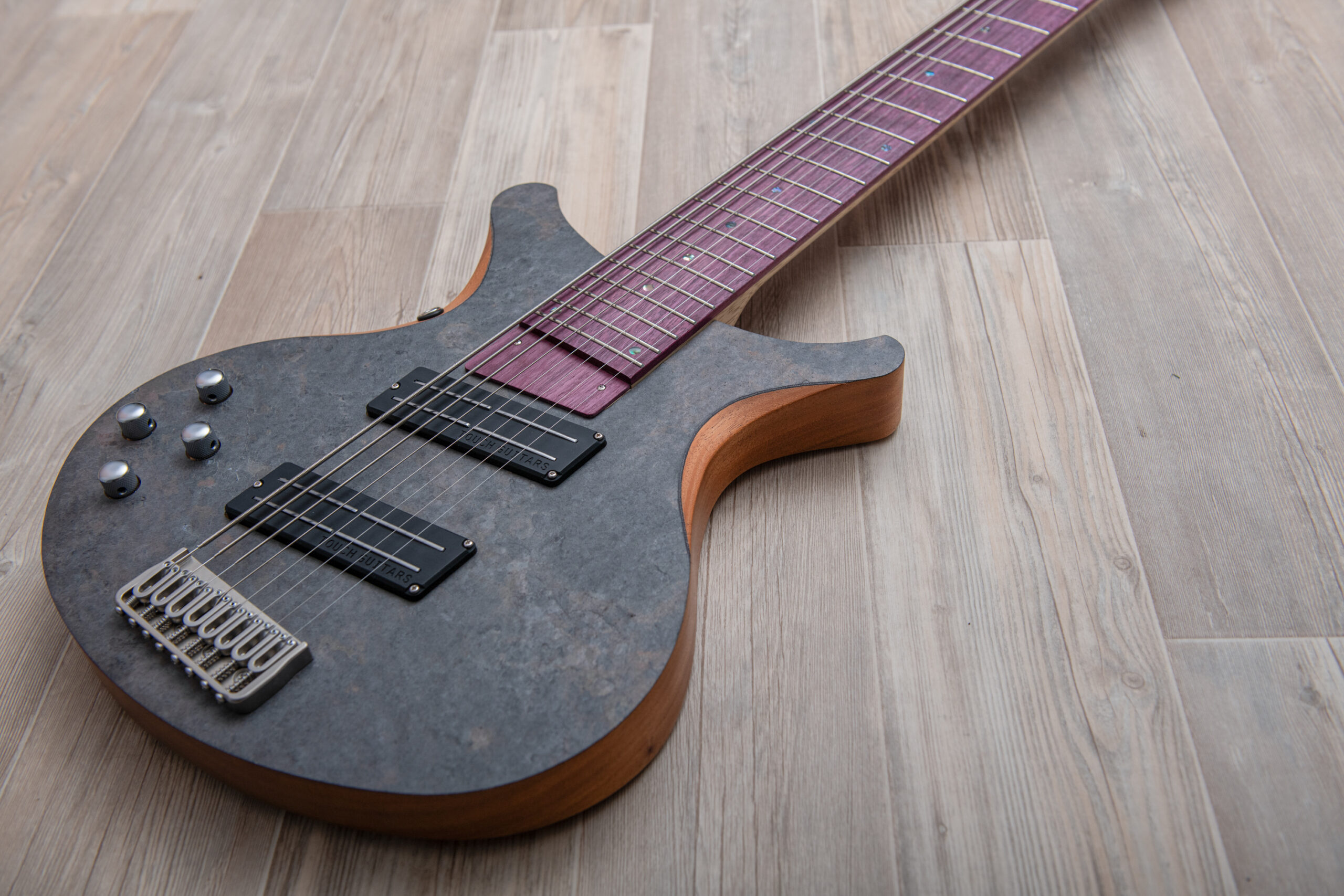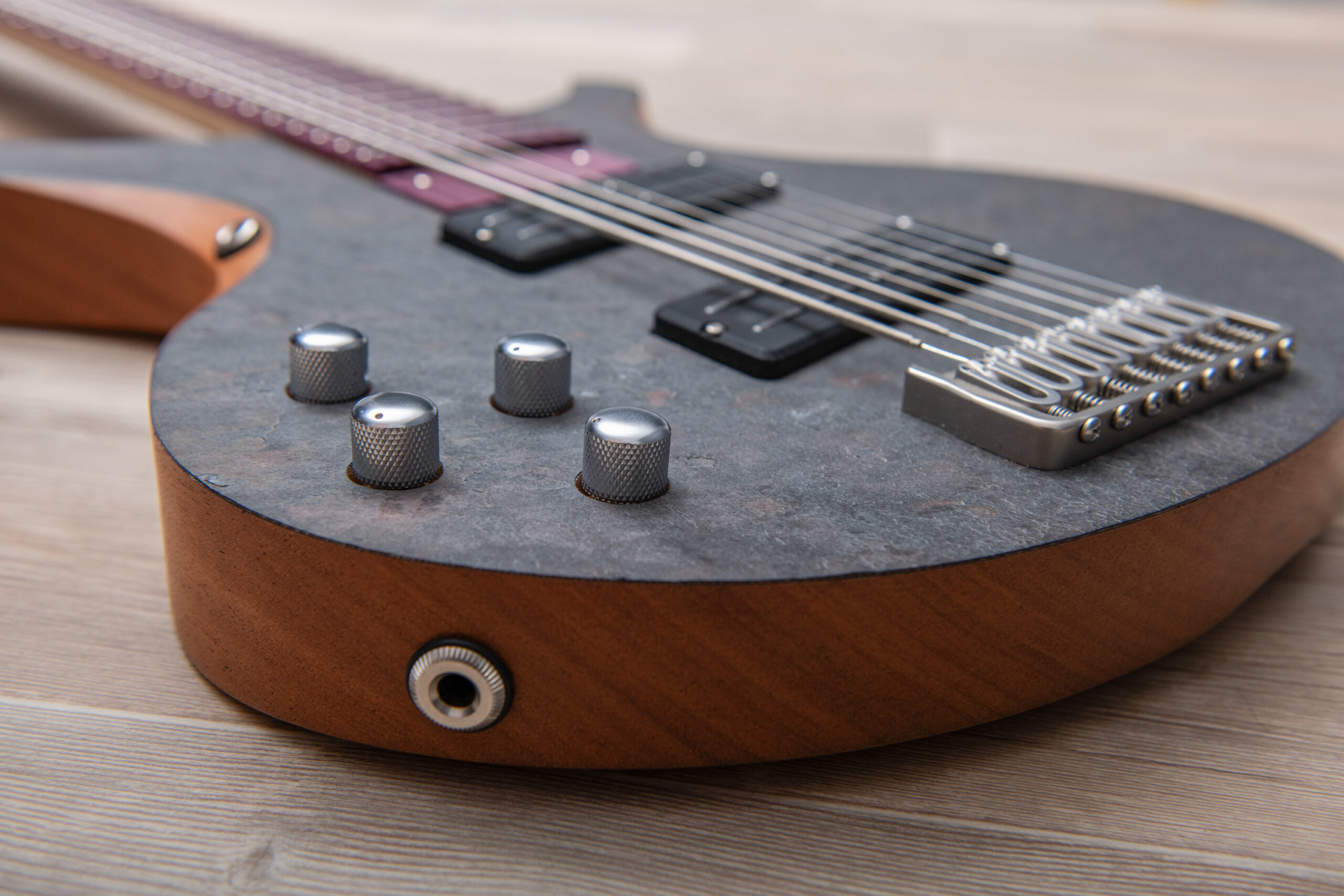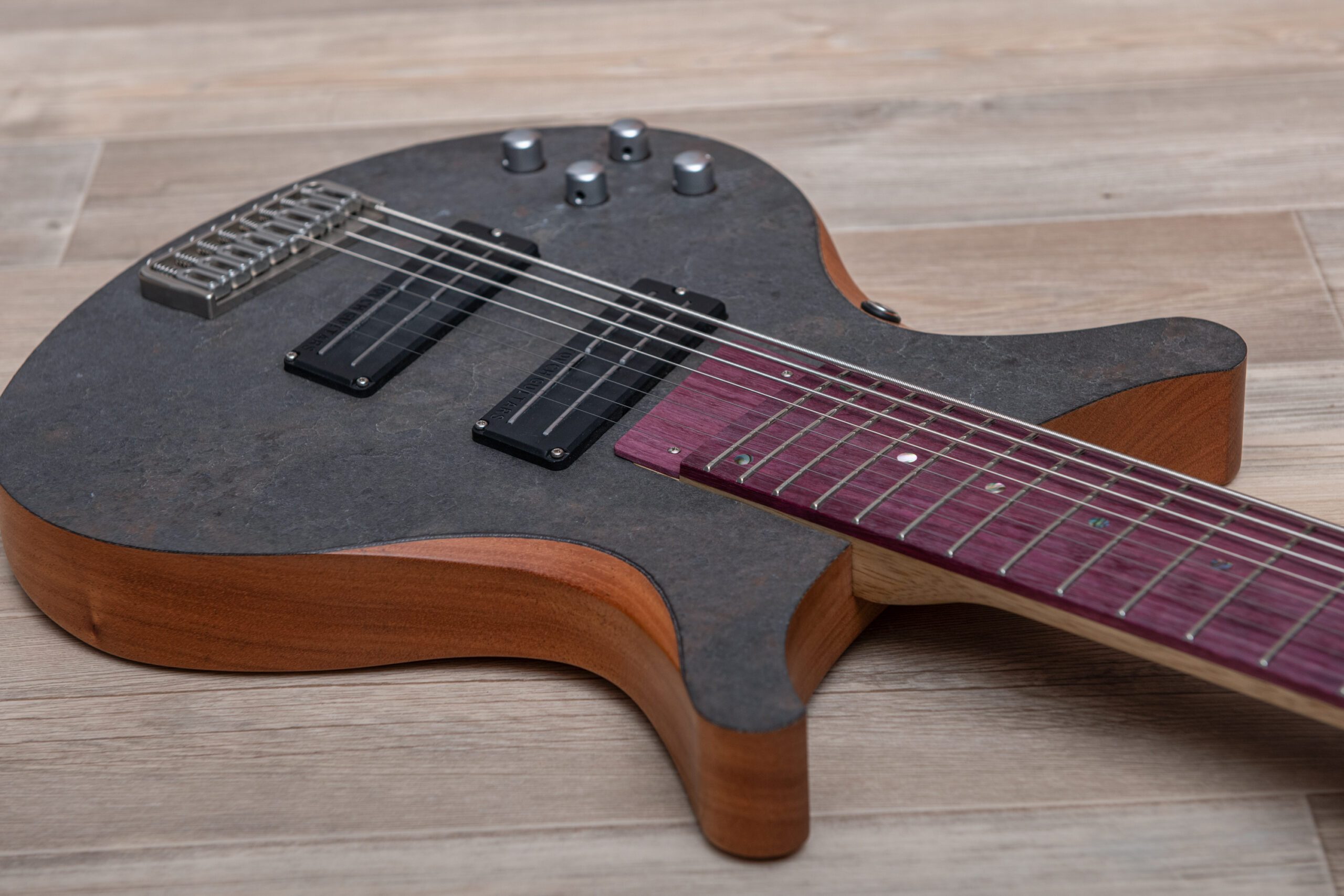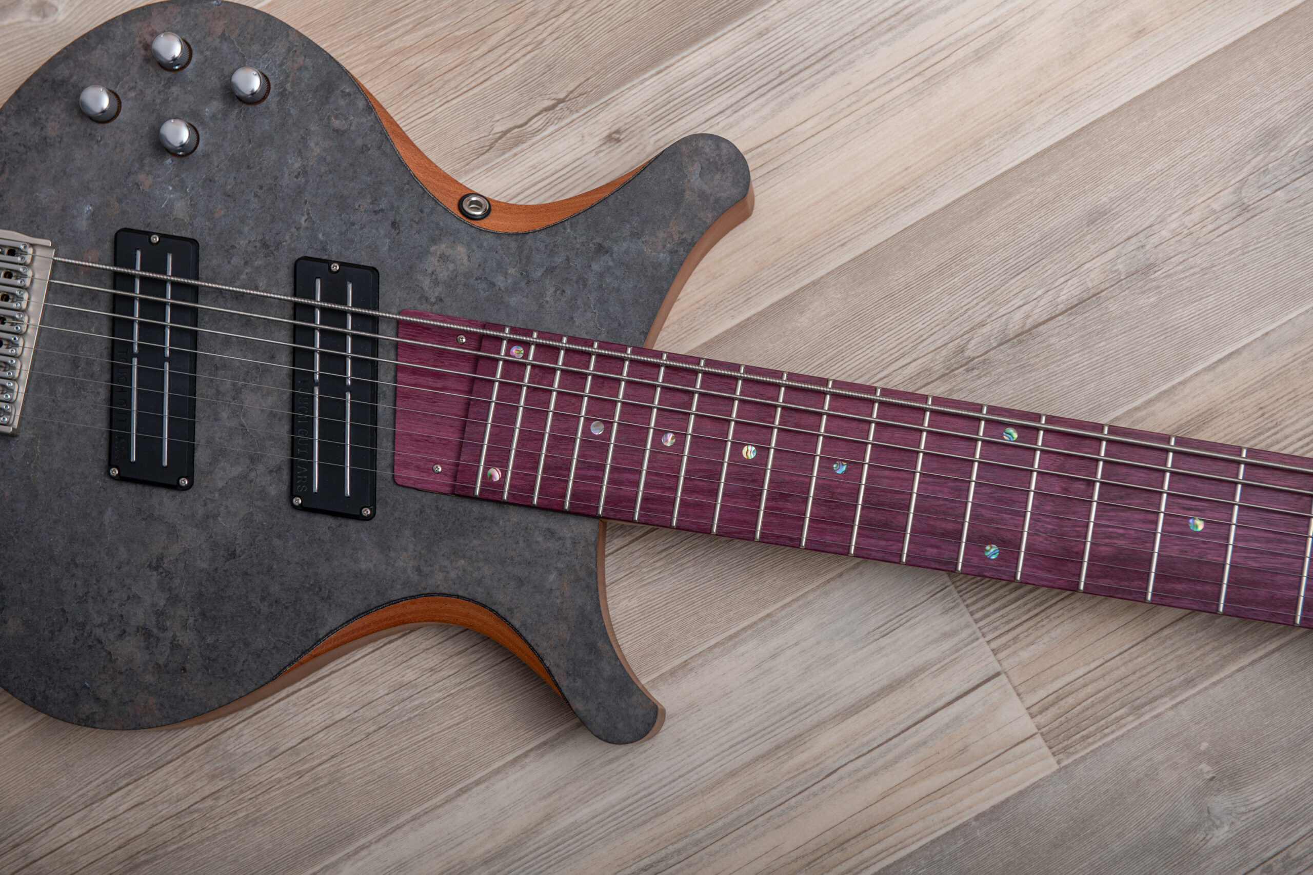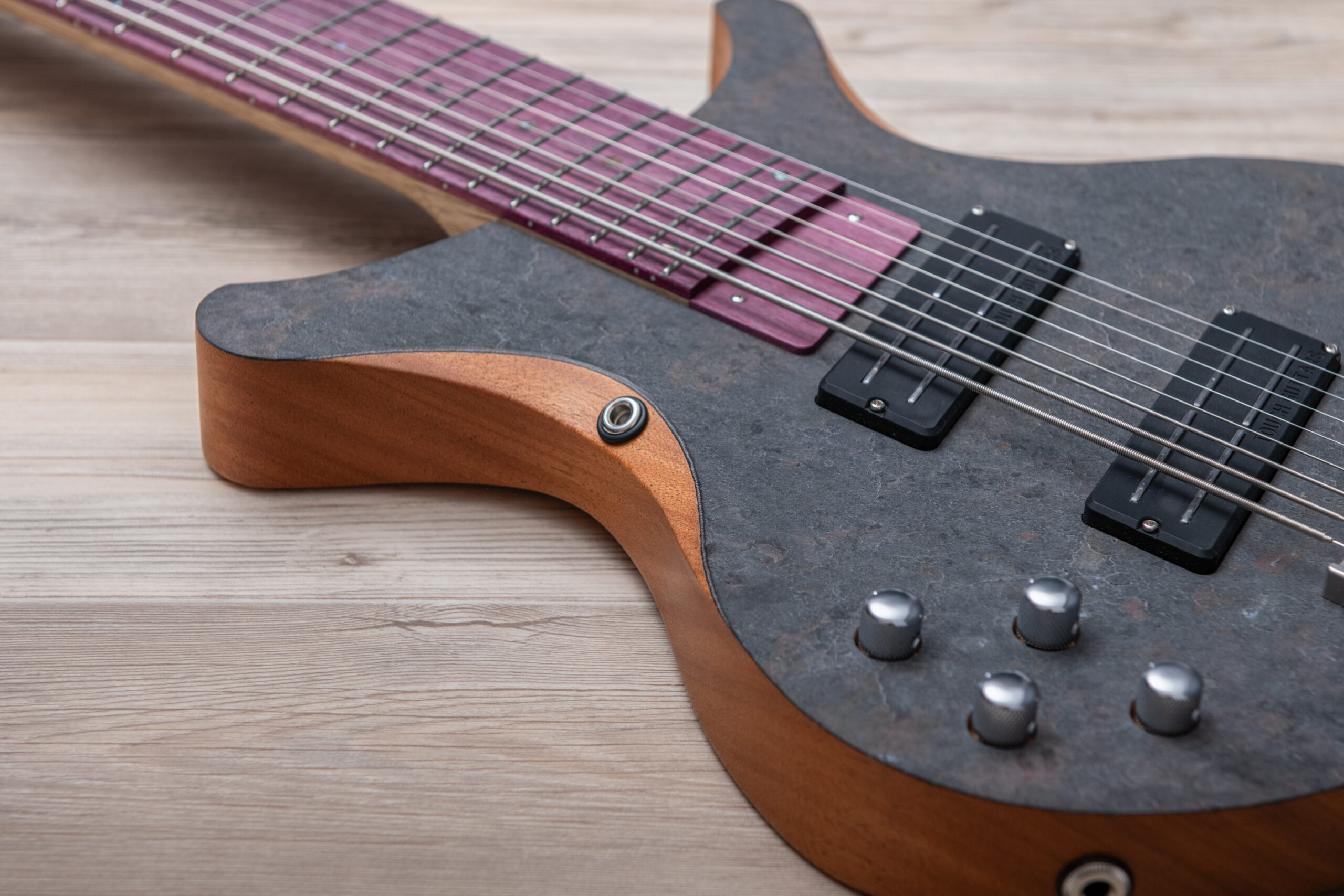 • mahogany body • real stone top • 3-piece korina/purple heart/korina neck • purple heart fretboard • chrome hardware • Jim Dunlop Straplok system • 2x Nova Custom Touch Guitars® frfr pickups • filter preamp • volume, blend (push high boost), filter 1 (push cutoff boost), filter 2 (push cutoff boost) • power pack by vaudoo audio • Tuning: Bb F C G D A C D