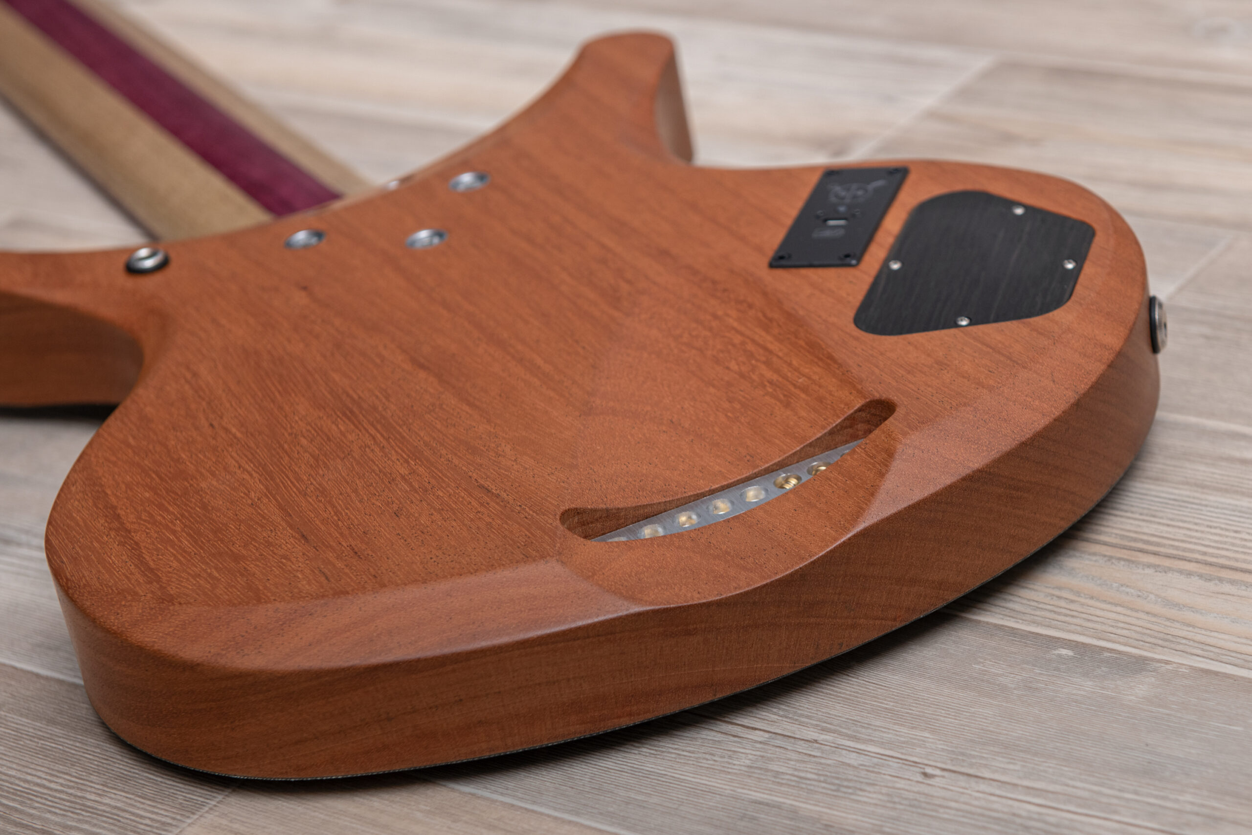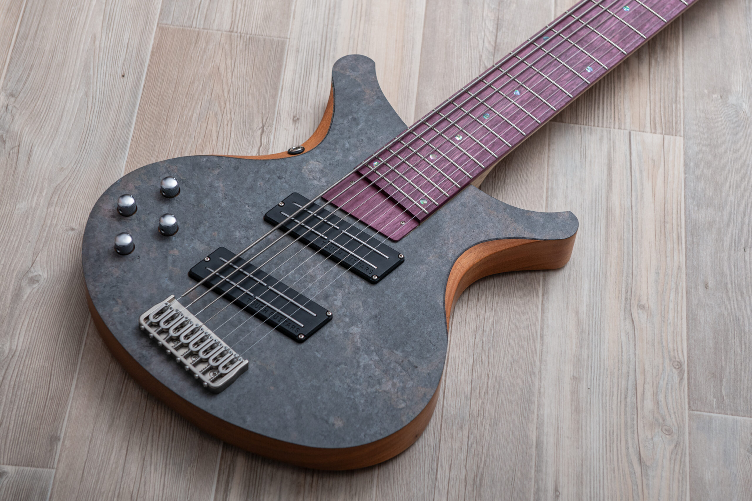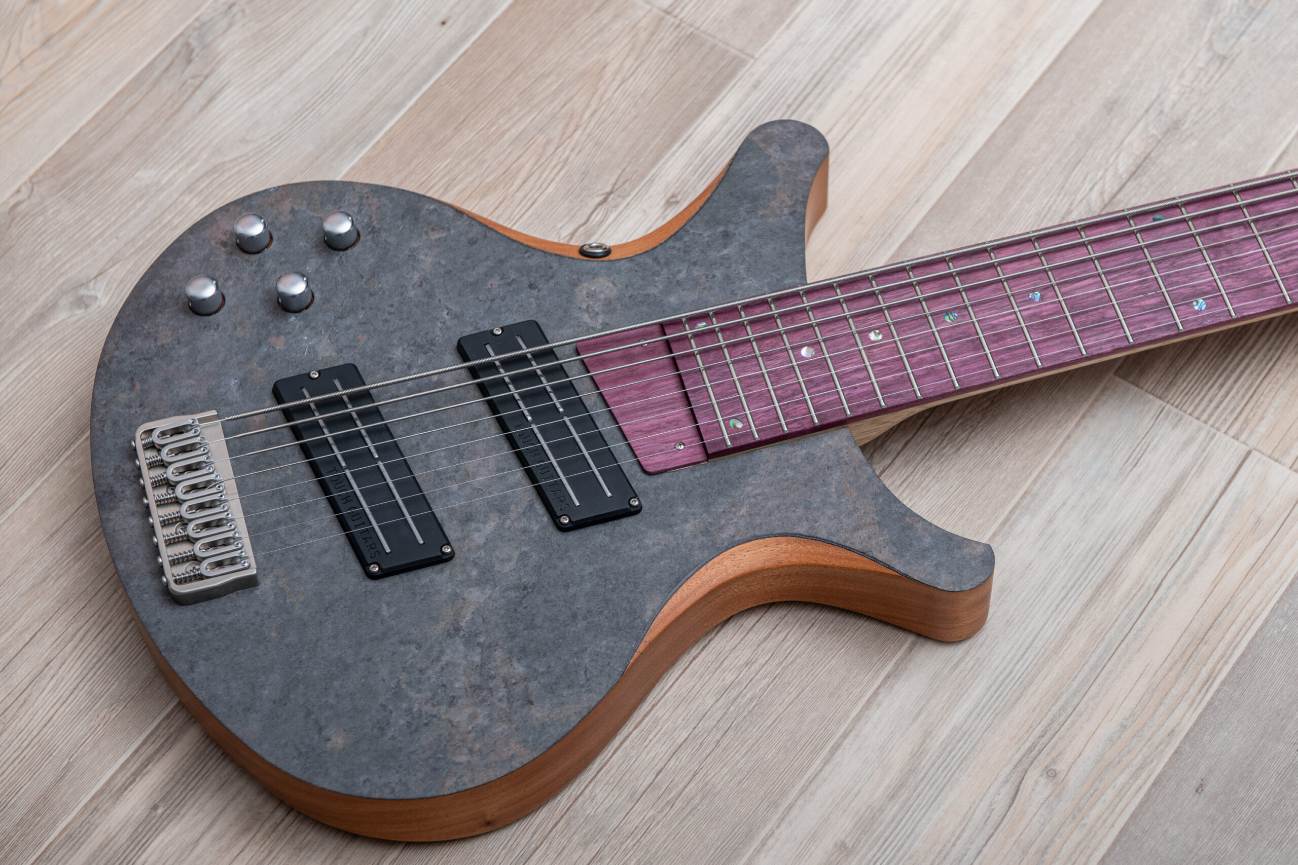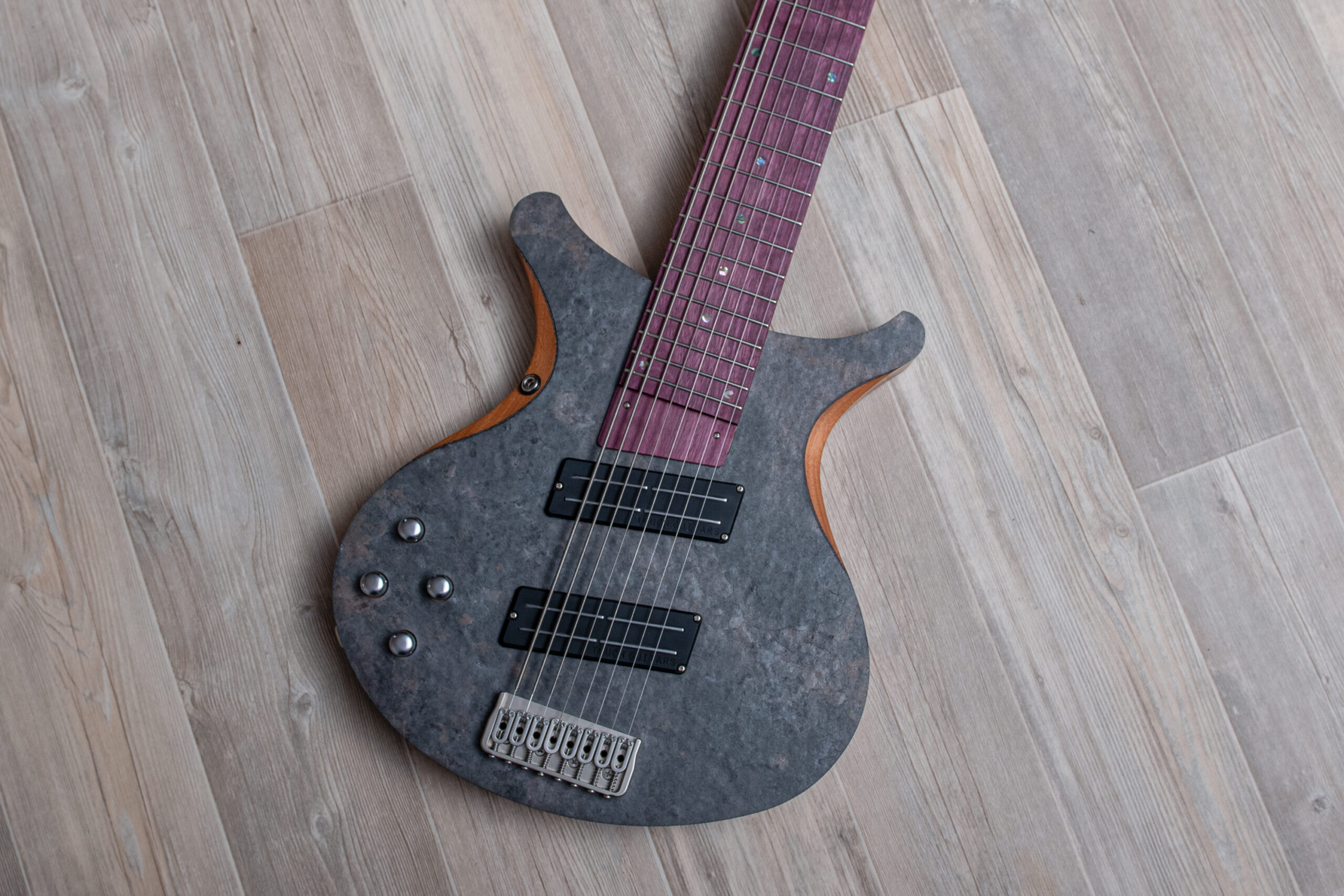 • mahogany body • real stone top • 3-piece korina/purple heart/korina neck • purple heart fretboard • chrome hardware • Jim Dunlop Straplok system • 2x Nova Custom Touch Guitars® frfr pickups • filter preamp • volume, blend (push high boost), filter 1 (push cutoff boost), filter 2 (push cutoff boost) • power pack by vaudoo audio • Tuning: Bb F C G D A C D