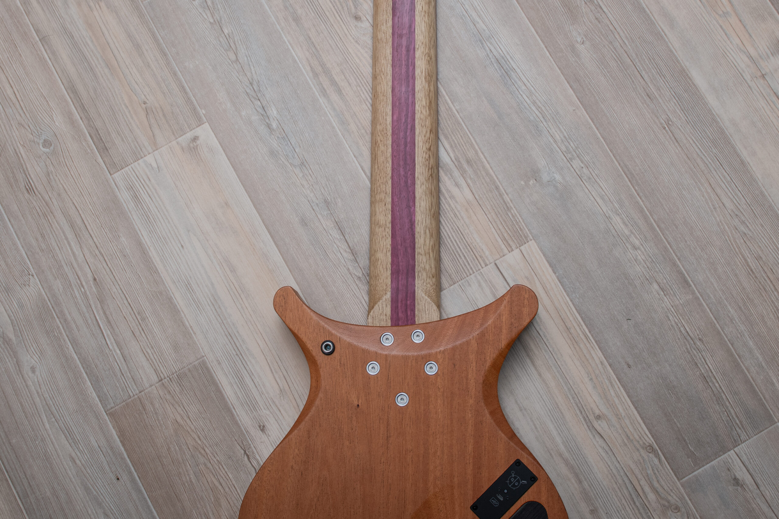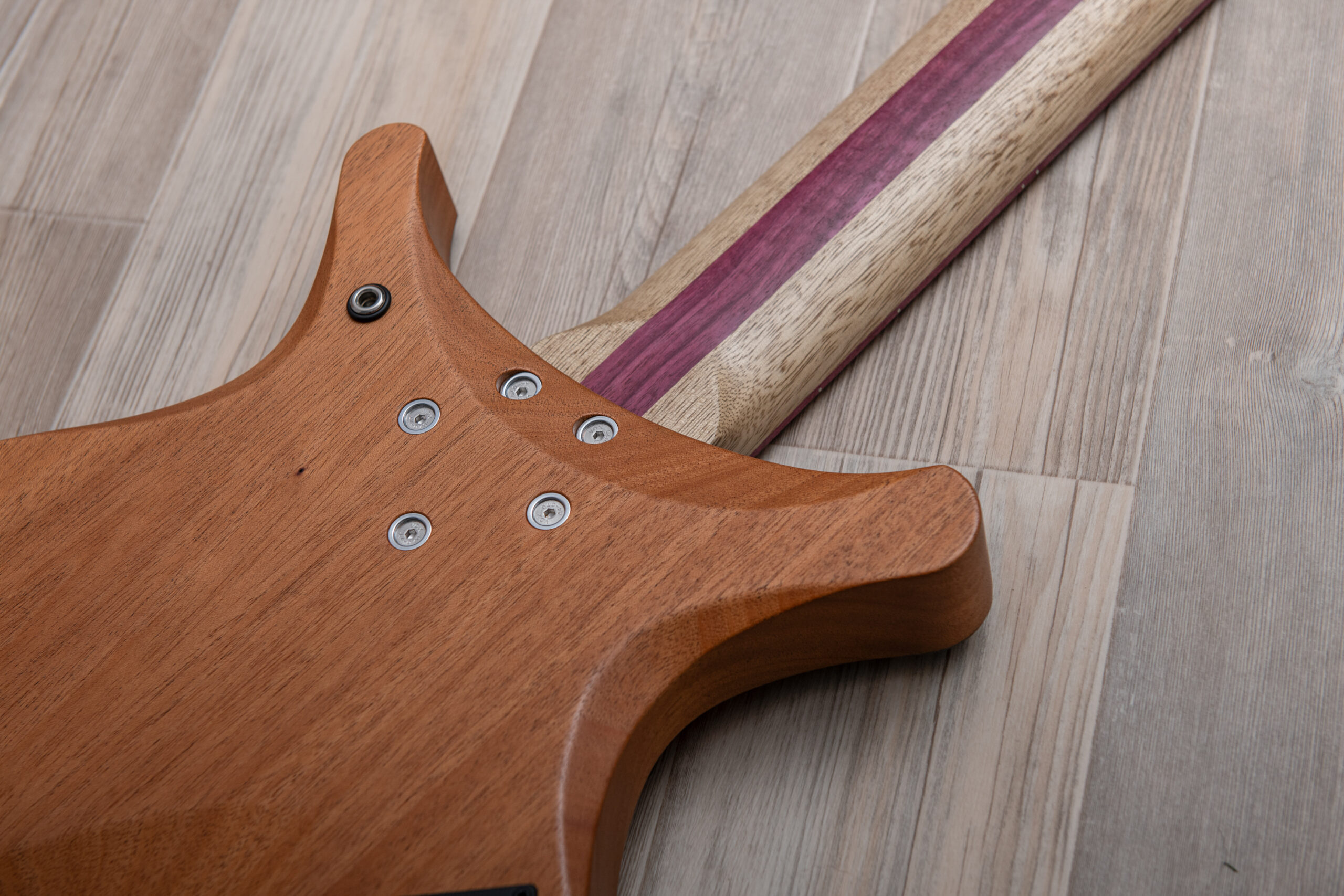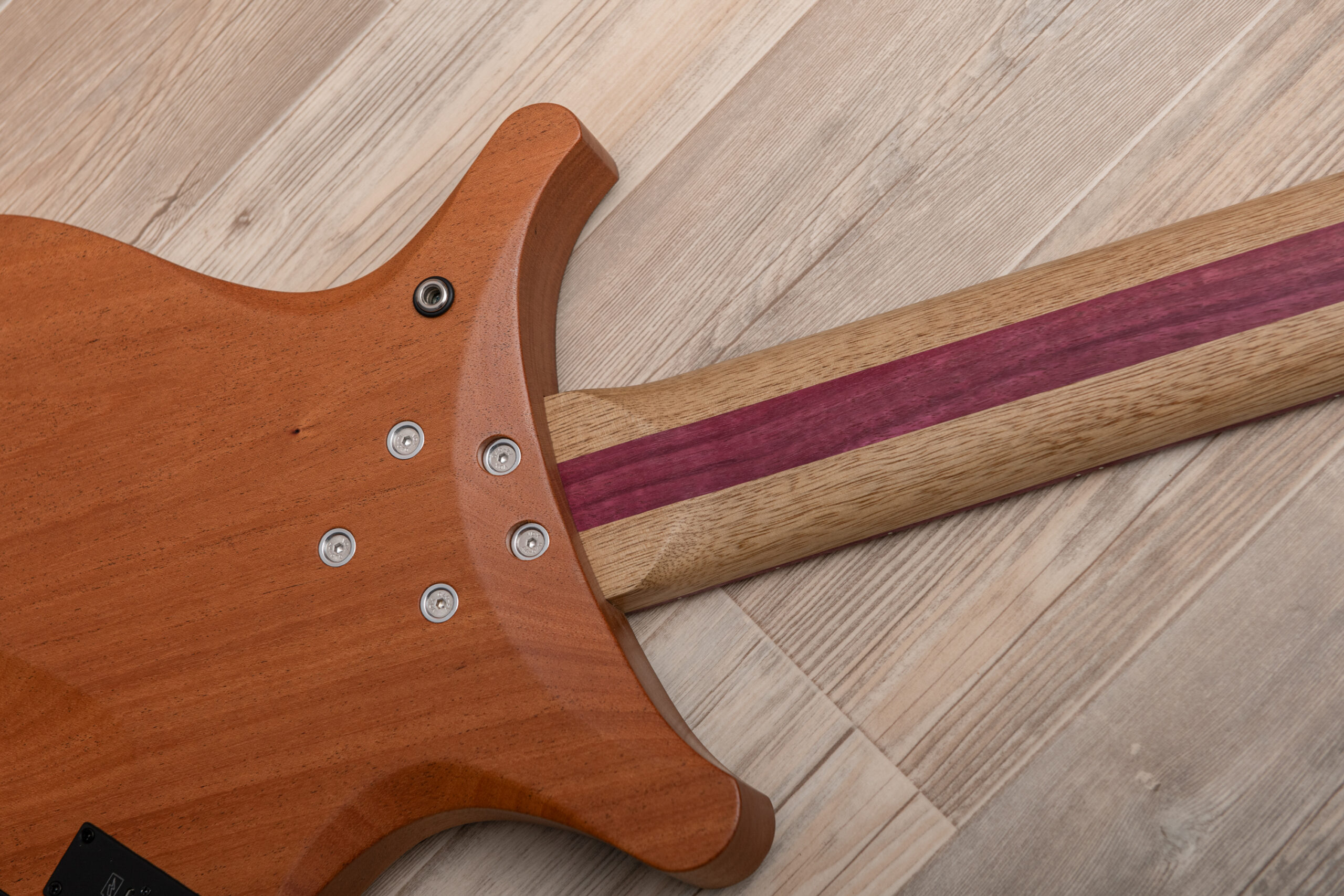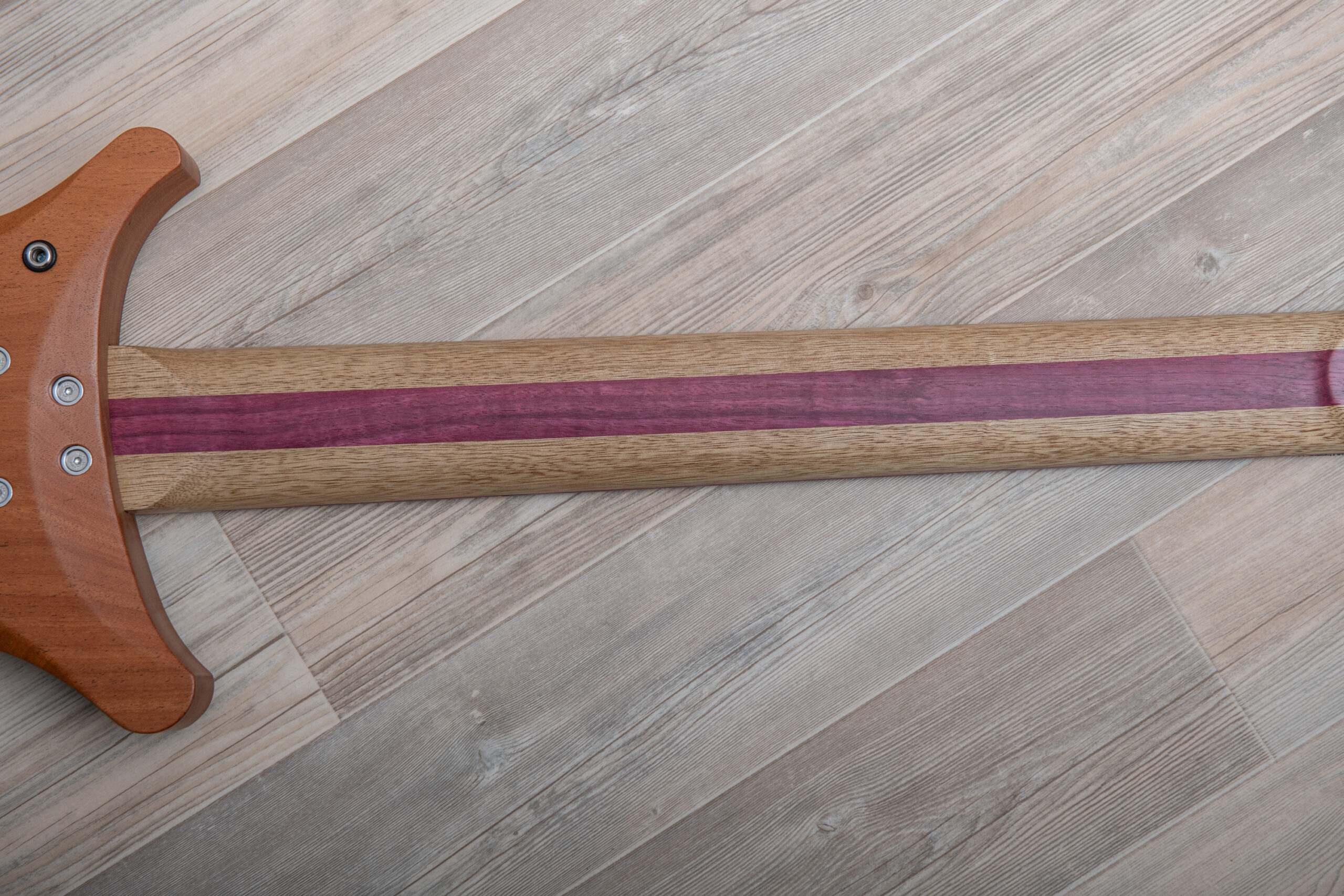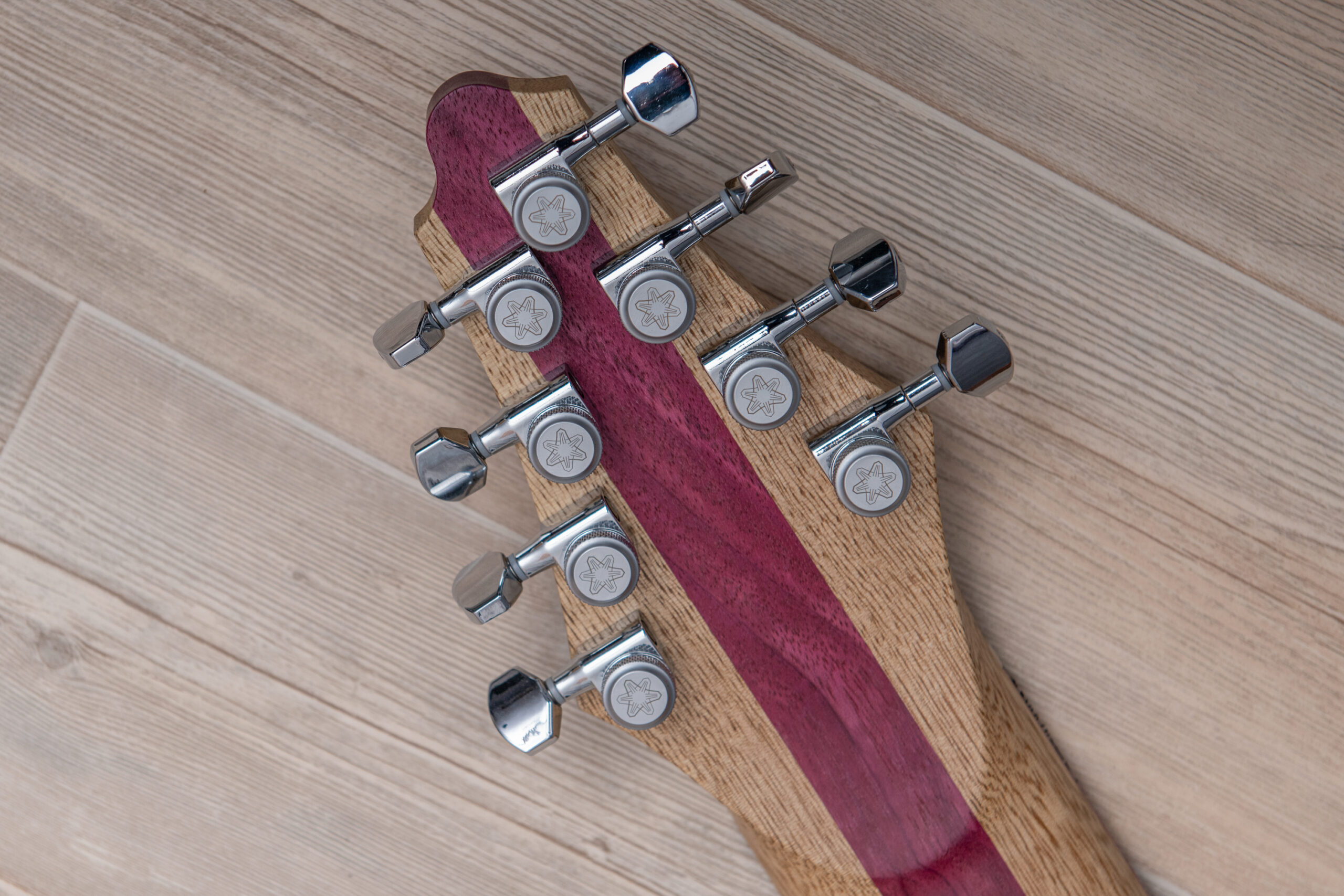 • mahogany body • real stone top • 3-piece korina/purple heart/korina neck • purple heart fretboard • chrome hardware • Jim Dunlop Straplok system • 2x Nova Custom Touch Guitars® frfr pickups • filter preamp • volume, blend (push high boost), filter 1 (push cutoff boost), filter 2 (push cutoff boost) • power pack by vaudoo audio • Tuning: Bb F C G D A C D